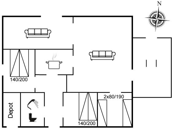 Der er i alt 3 soveværelser. Sovepladserne fordeler sig på: 4 sovepladser i dobbeltsenge. 2 sovepladser i enkeltsenge.