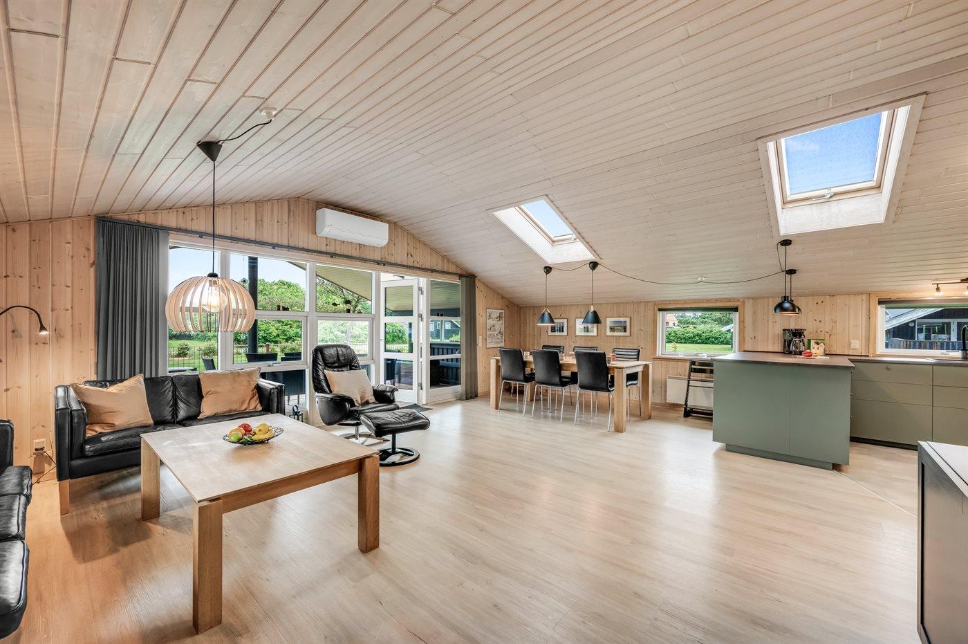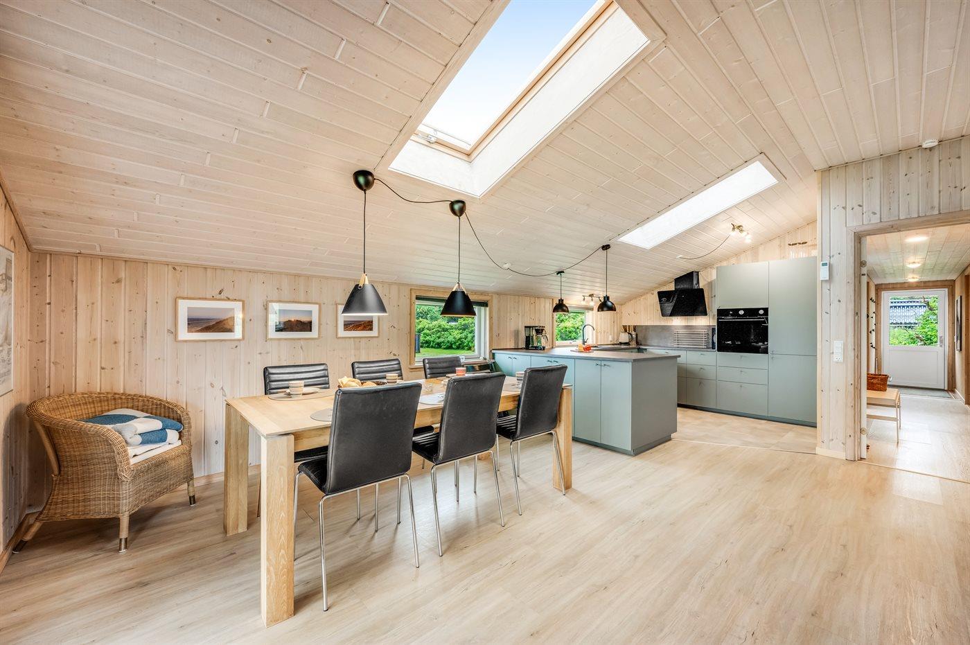 Et dejligt sommerhus med god plads og skønne lysindfald fra flere ovenlysvinduer - beliggende i rolige og naturskønne omgivelser mellem hav og fjord. På den lukkede grund er der plads til boldspil og leg samt adgang til et fint anneks, hvor 2 af sovepladserne befinder sig.