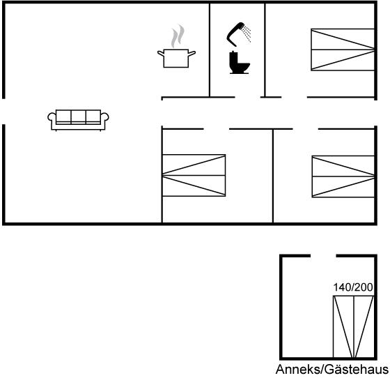 Der er i alt 4 soveværelser. Sovepladserne fordeler sig på: 6 sovepladser i dobbeltsenge.2 sovepladser i elevationssenge. 2 af disse sovepladser befinder sig i et anneks. Derudover er der 1 stk. barneseng.