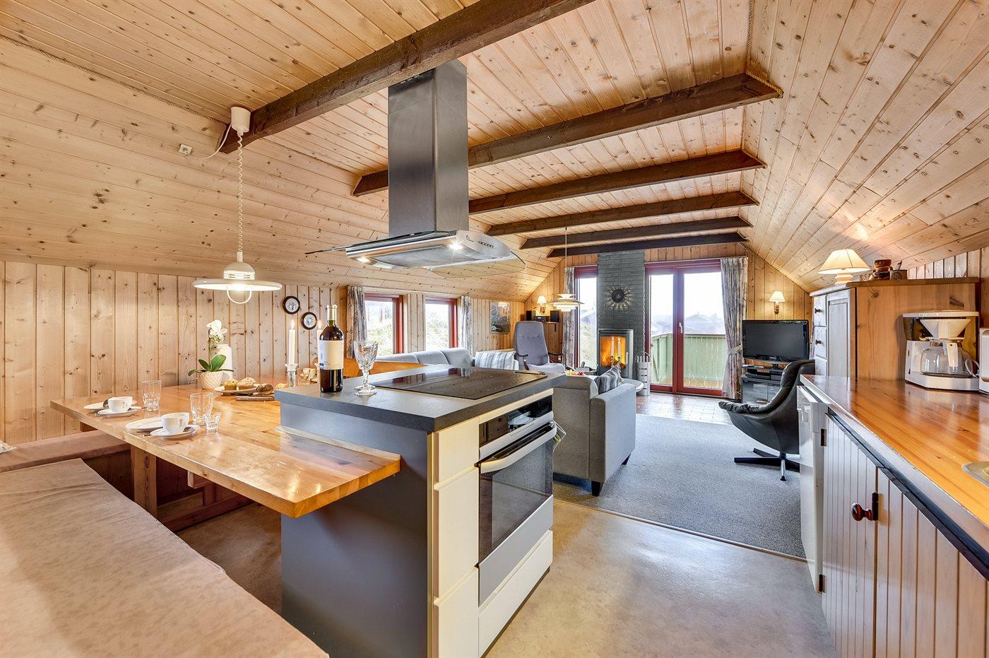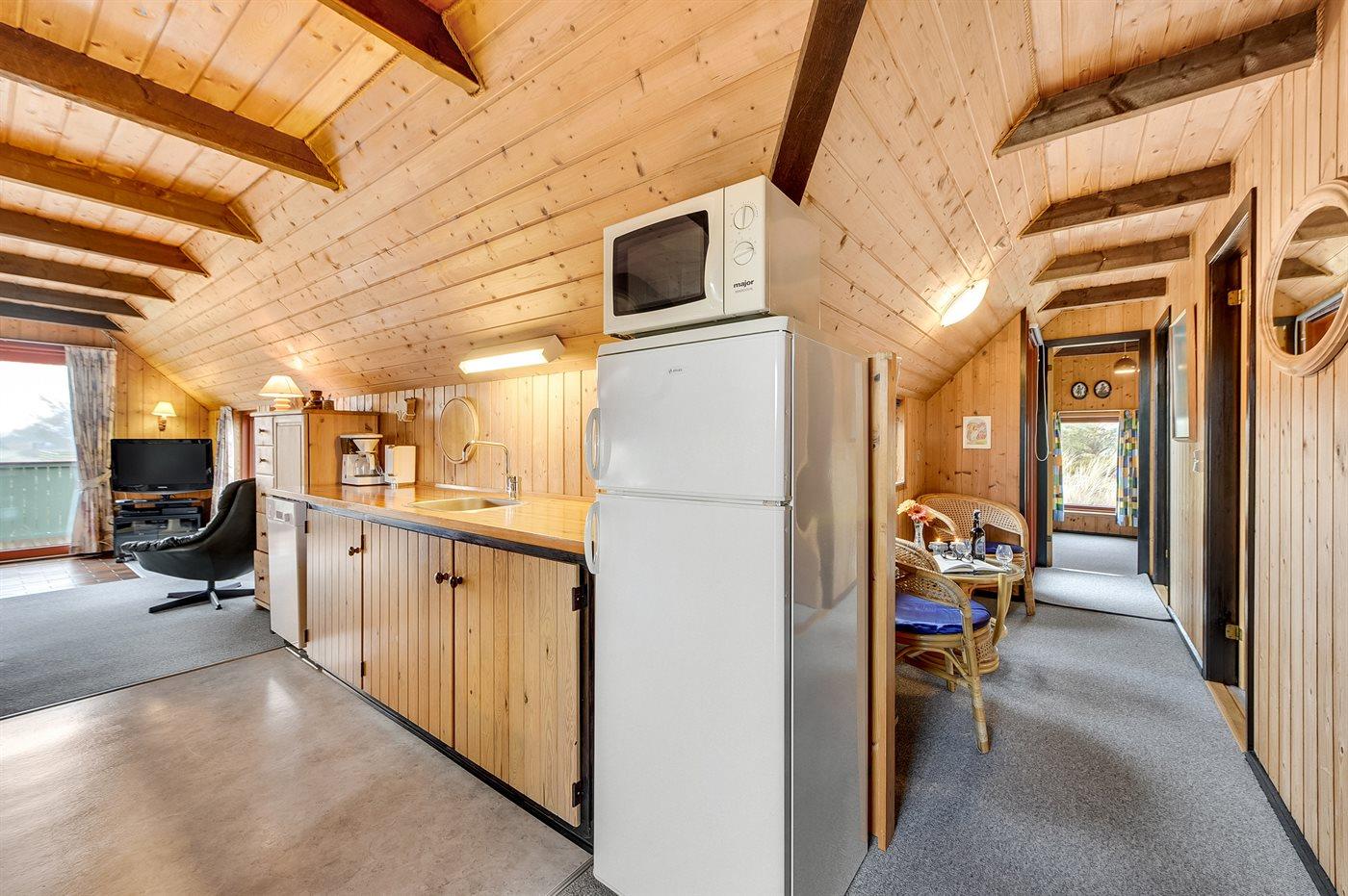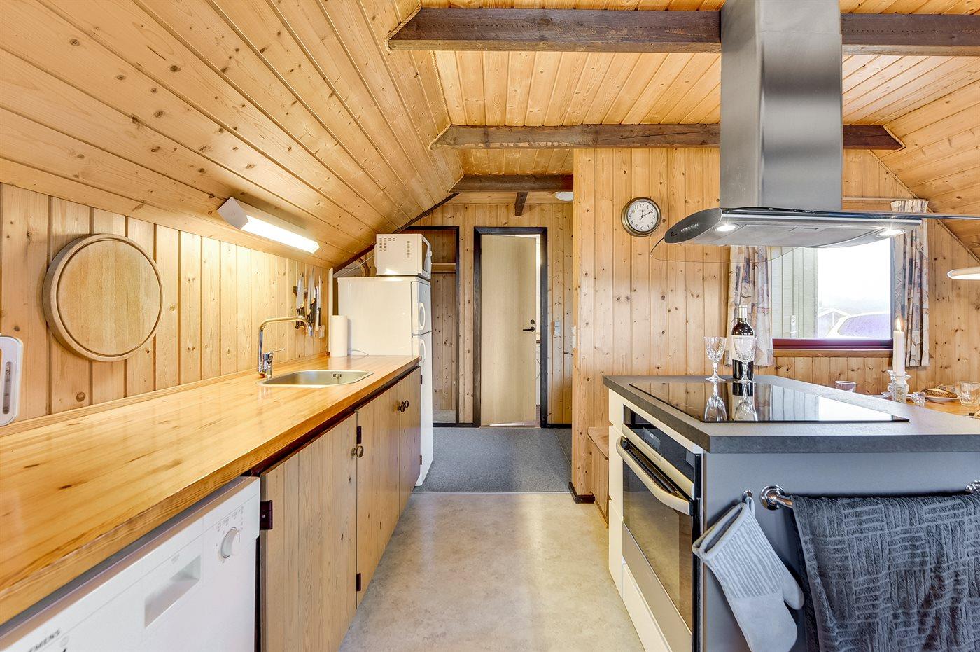 Køkkenet er udstyret med 1 køleskab. Der er 4 induktionskogeplader, varmluftovn, mikrobølgeovn samt opvaskemaskine.