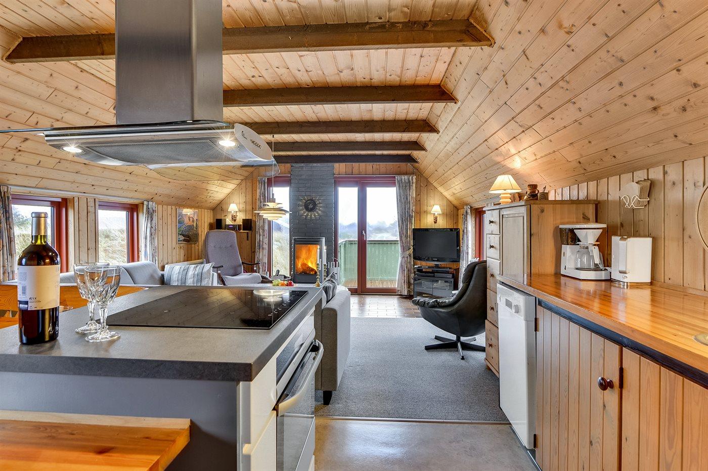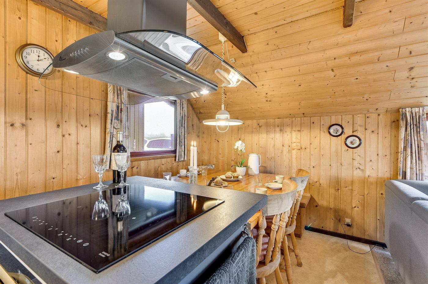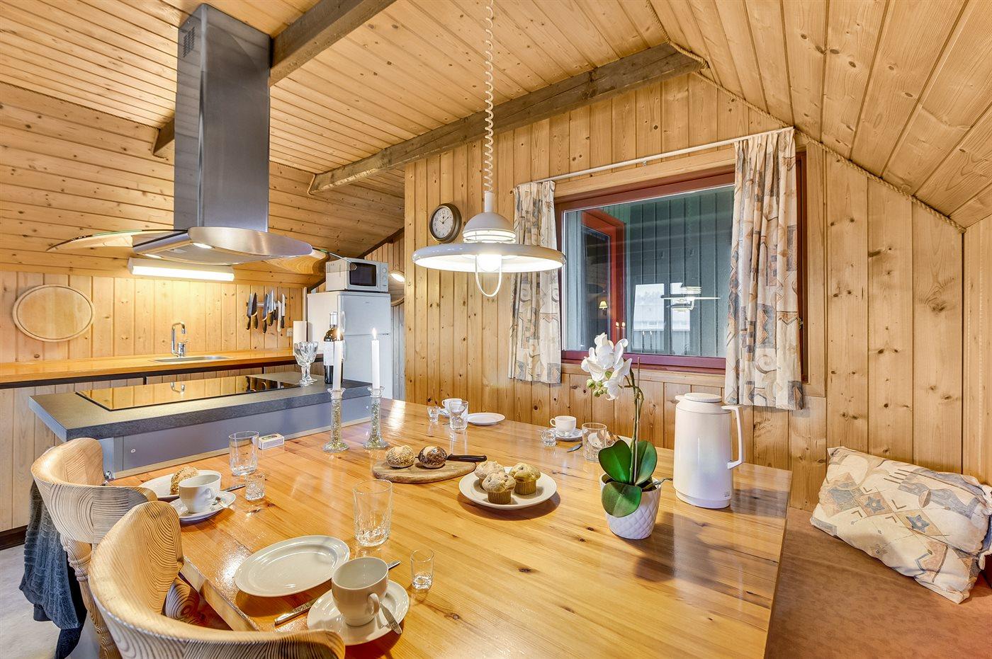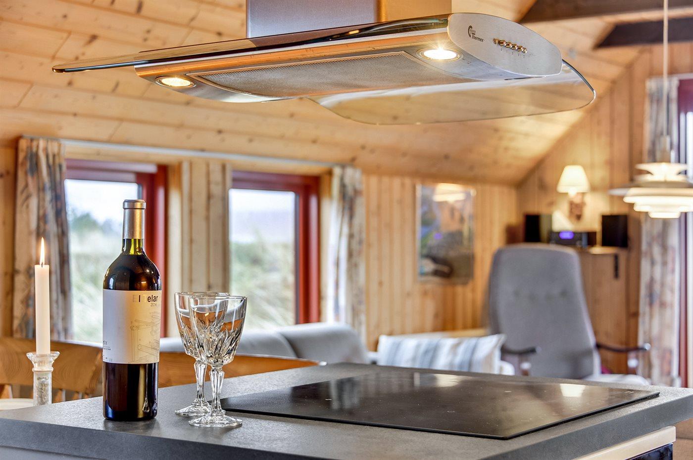 Køkkenet er udstyret med 1 køleskab. Der er 4 induktionskogeplader, varmluftovn, mikrobølgeovn samt opvaskemaskine.