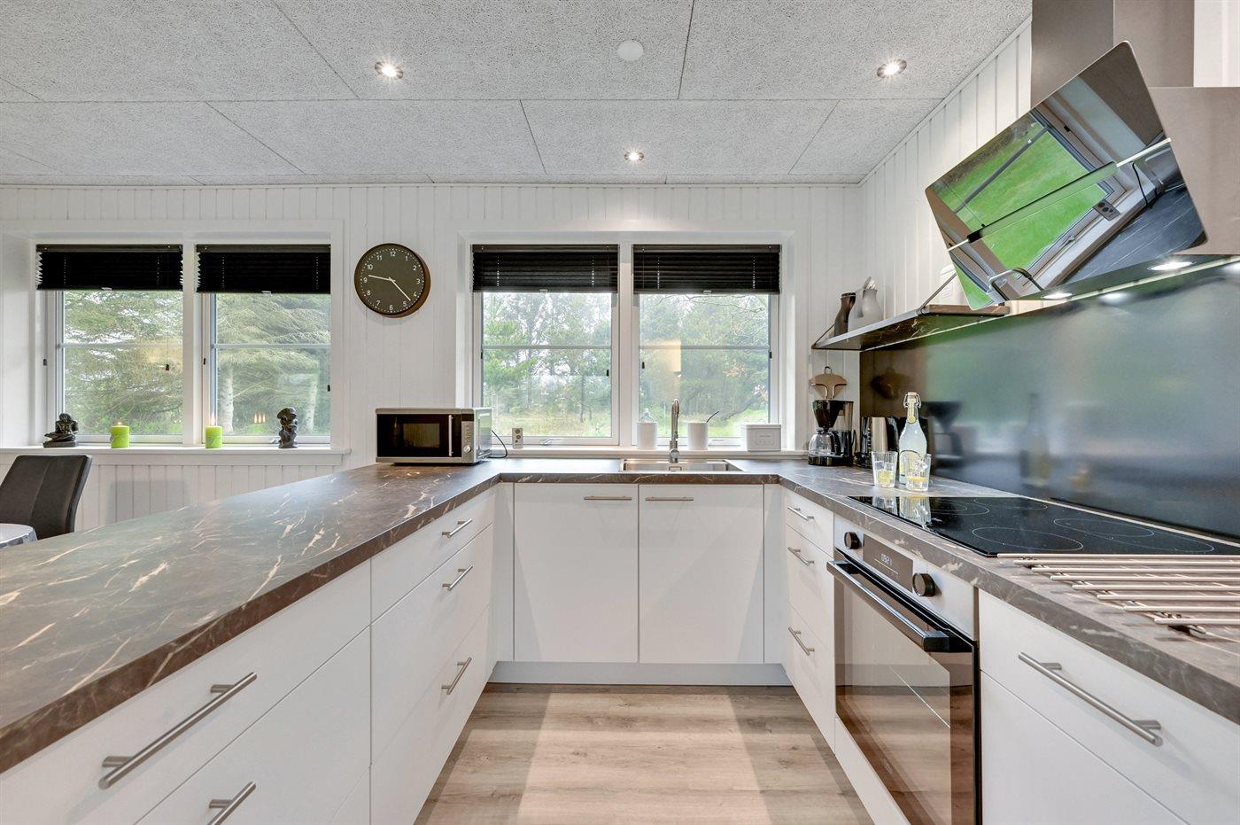 Køkkenet er udstyret med 1 køleskab. Der er 4 keramiske kogeplader, varmluftovn, mikrobølgeovn samt opvaskemaskine.