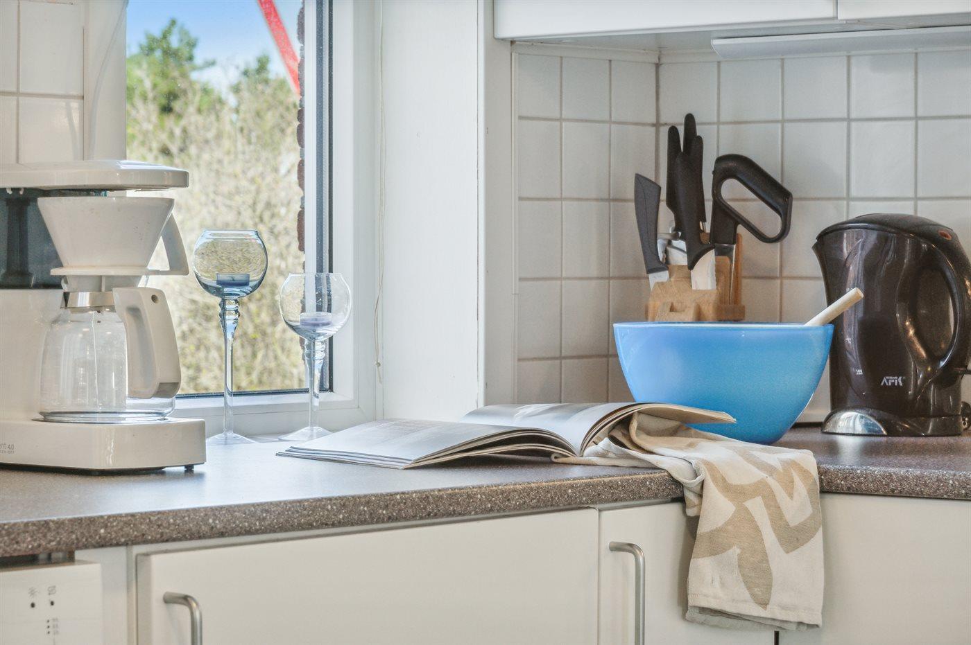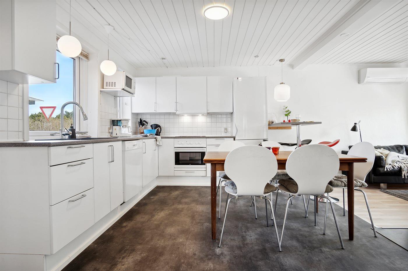 Køkkenet er udstyret med 1 køleskab. Der er 4 keramiske kogeplader, varmluftovn, mikrobølgeovn samt opvaskemaskine.