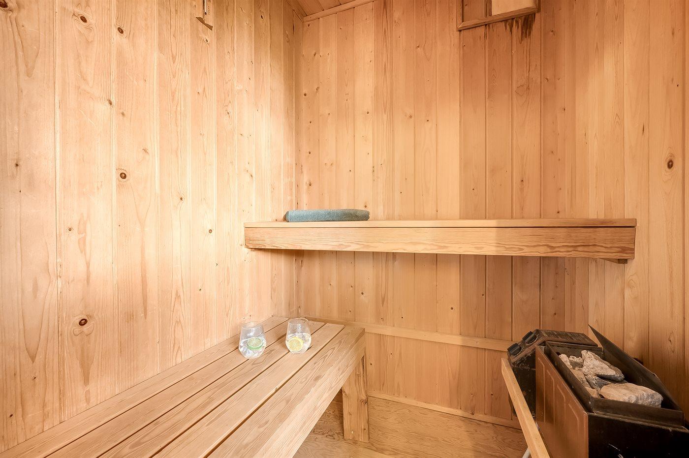 Der er 1 badeværelse med bruseniche og 1 toilet.. Der er gulvvarme på 1 badeværelse. I saunaen er der mulighed for afslapning.