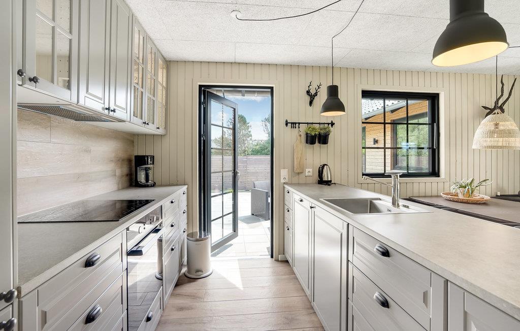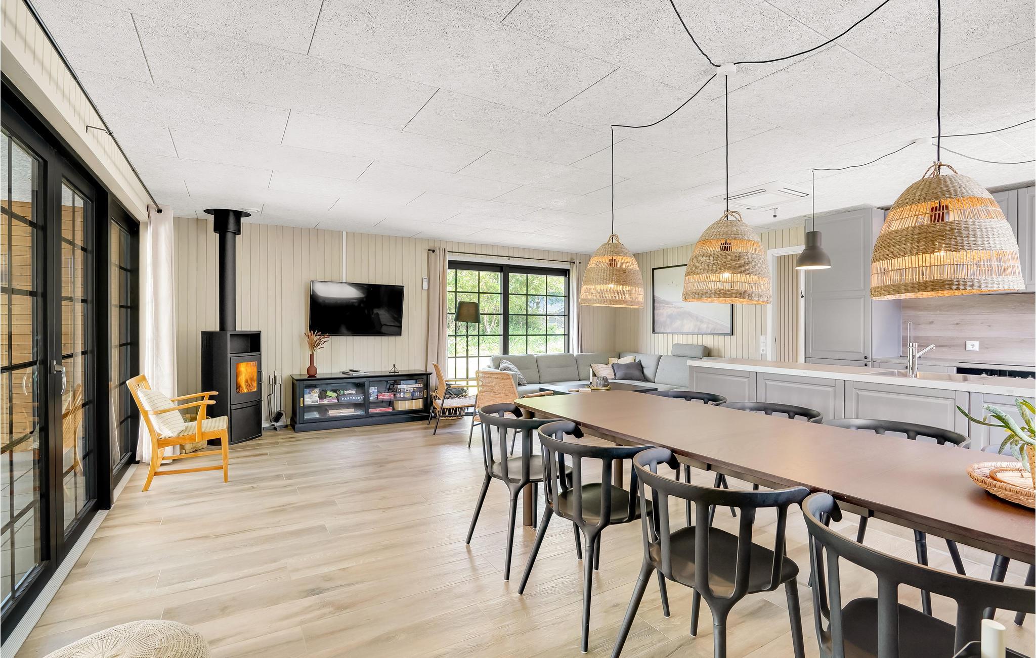 Tilbring en dejlig ferie i dette indbydende sommerhus, som er komfortabelt og smagfuldt indrettet og giver jer ideelle rammer om et ophold. Der er fem soveværelser, så huset kan rumme ni personer. Badeværelset har behagelig gulvvarme. og om aftenen kan I sætte jer foran brændeovnen og slappe af til lyden af de knitrende flammer i brændeovnen.