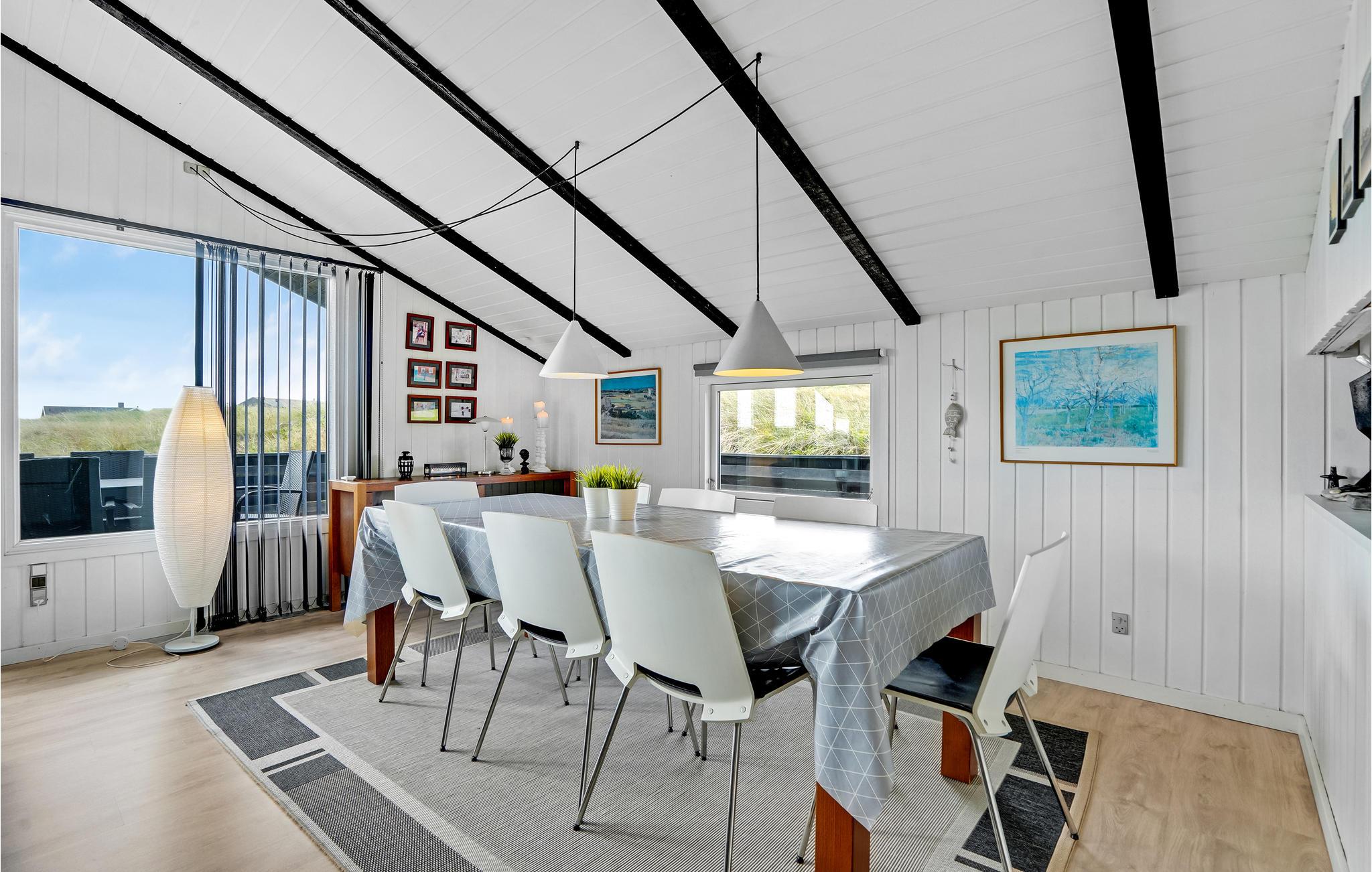 Sæt jer godt til rette i sofaerne i den lyse stue og lyt til den knitrende ild i brændeovnen. Dæk op på spisebordet til fælles måltider og nyd udsigten over klitterne gennem de store vinduer. Tilbered jeres måltider i køkkenet, hvor der er godt med albuerum og god forbindelse til opholdsstuen. Efter en lang dag med udflugter, er det hyggeligt at snuppe en dyst i aktivitetsrummet, som har poolbord, shuffleboard, bordfodbold og en boksemaskine.