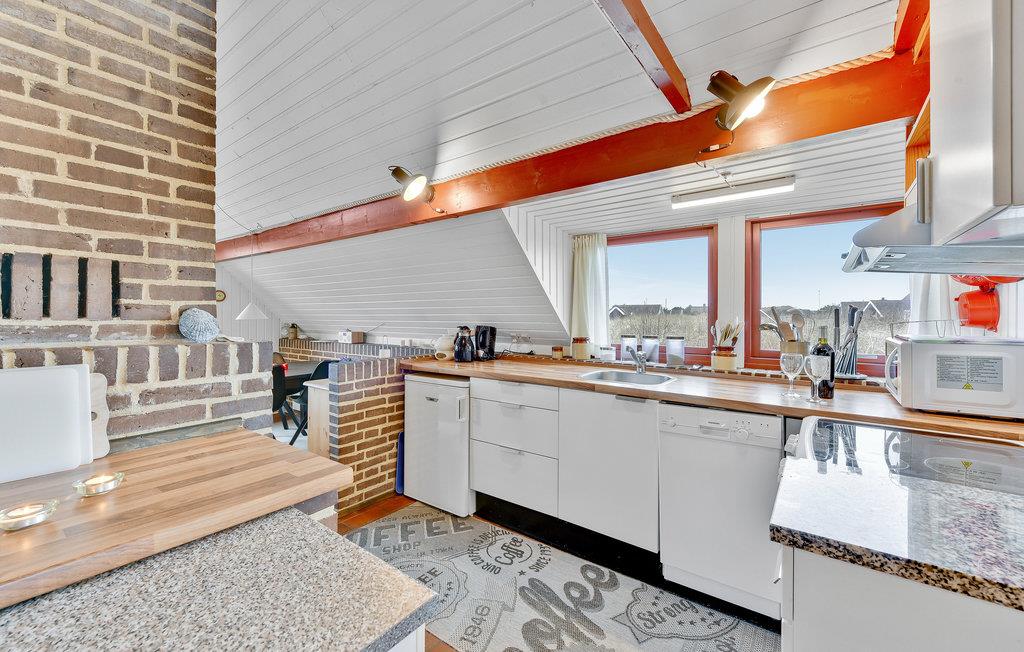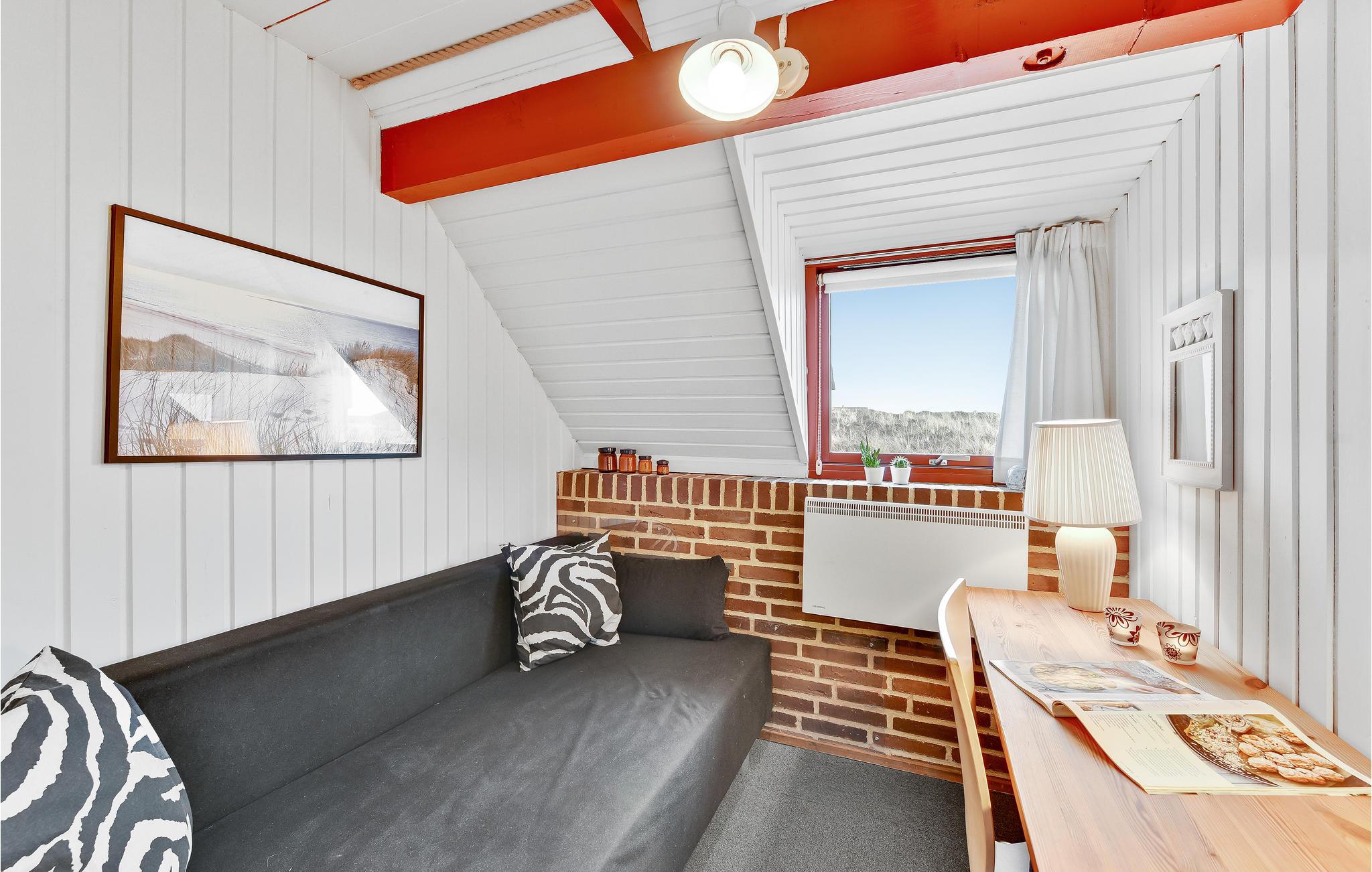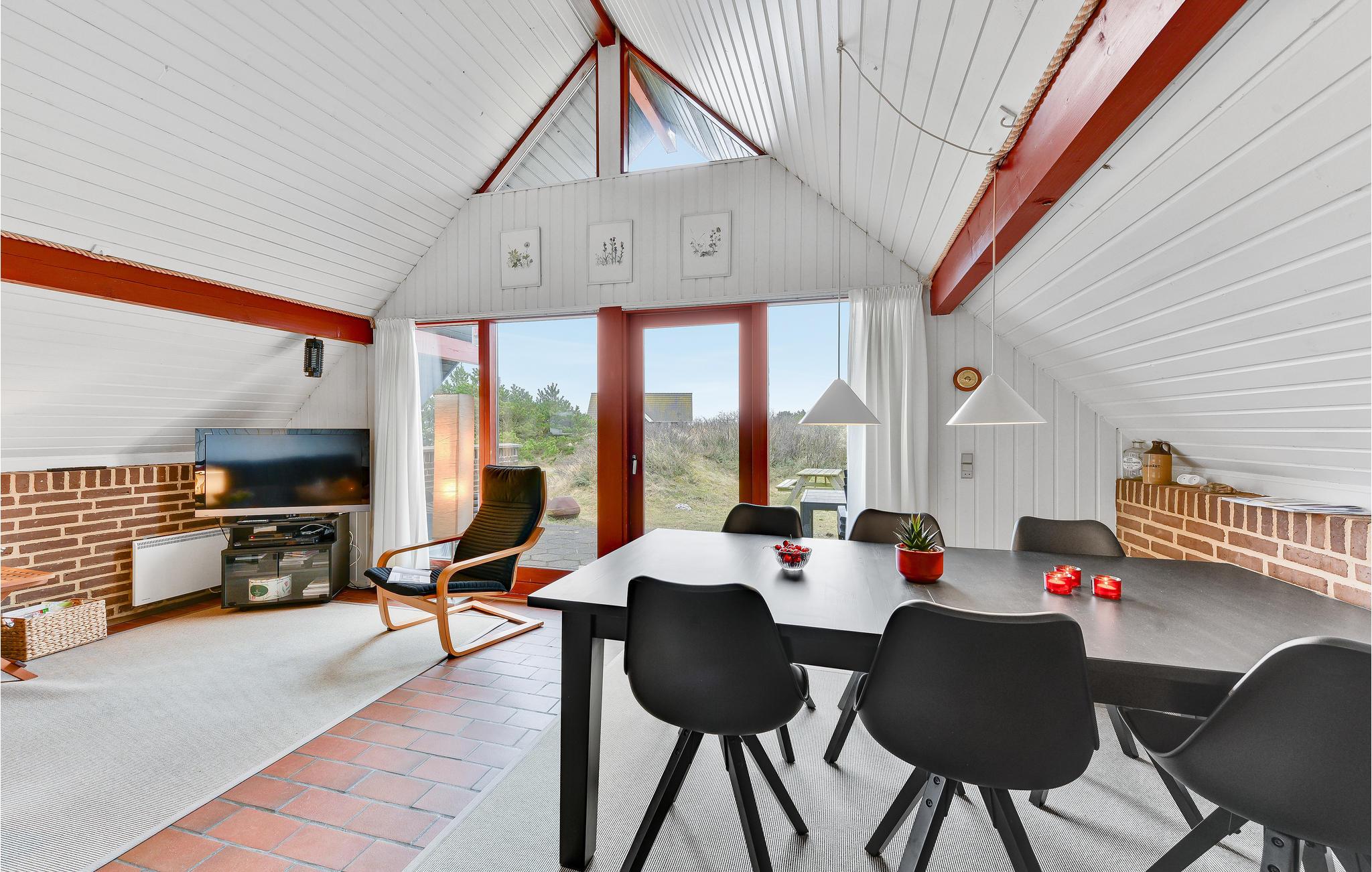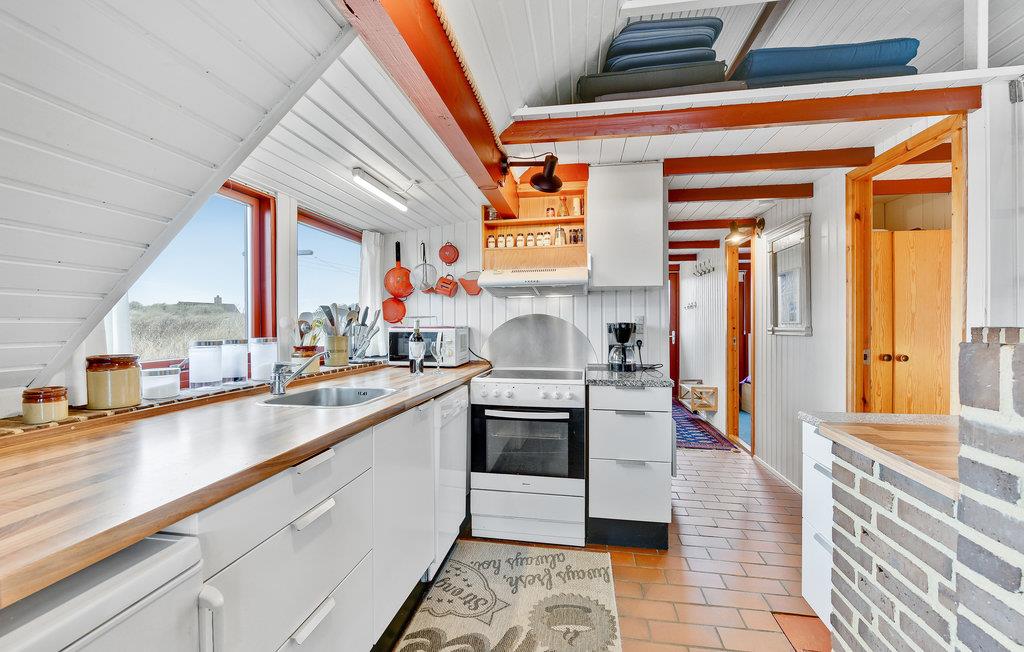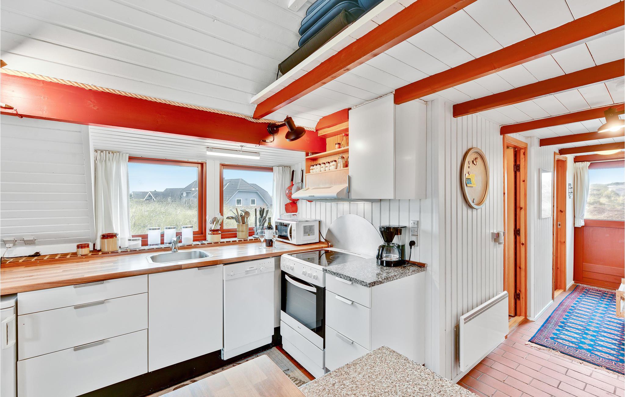 Der er en skøn og hyggelig atmosfære i dette stråtækte sommerhus beliggende på en dejlig naturgrund i Bjerregård. Her, lige midt i mellem Ringkøbing Fjord og Vesterhavet, mærkes for alvor vindens sus og bølgernes brus. Nyd naturen direkte fra en af husets to terrasser, eller tag på opdagelse i det skønne klitlandskab. Der er vandre- og cykelruter i området, som går hele vejen fra Nymindegab i syd til Søndervig i nord. Huset er hyggeligt indrettet med køkken og stuen i åben forbindelse med hinanden, og danner rammen om husets samlingspunkt. Der er et dejligt lysindfald fra det store vinduesparti, direkte udgang til terrassen, og brændeovnen der skaber den rette sommerhusstemning. De seks sovepladser er fordelt i tre værelser; et med dobbeltseng og to mindre soveværelser med køjesenge og sovesofa. Nærmeste by er Hvide Sande, som byder på et spændende handelsliv, med mange forskellige butikker, caféer og restauranter, museer og ikke mindst det skønne havnemiljø.