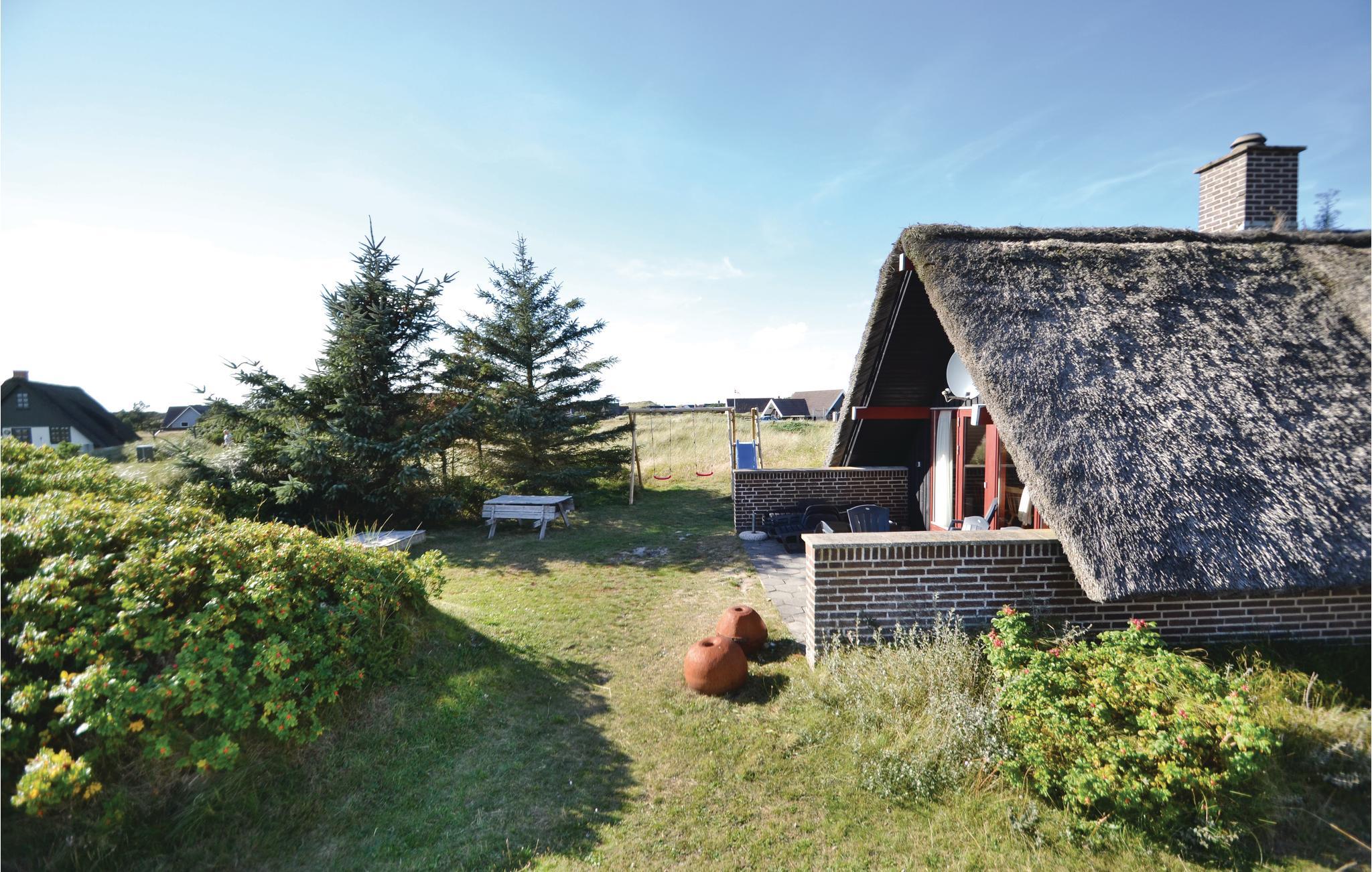 Hyggeligt stråtækt sommerhus i Bjerregård nær Ringkøbing Fjord og Vesterhavet med to terrasser og smuk natur.