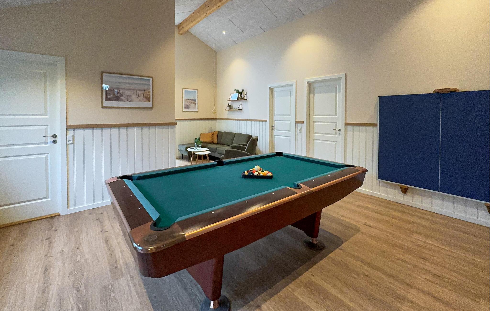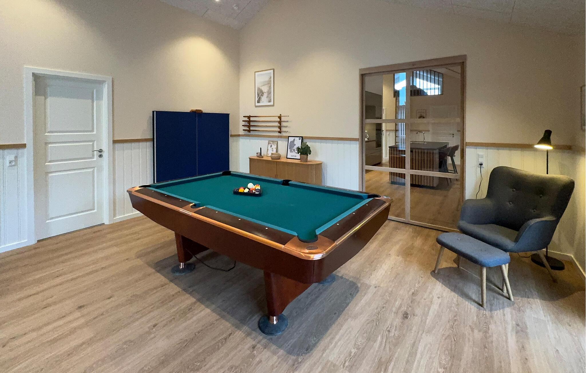 Træd ind i det åbne opholdsrum, og nyd den varme atmosfære. Tag plads i de komfortable sofaer, og brug det store spisebord til fælles måltider eller lange aftener i hyggeligt samvær. Tilbered jeres måltider i det moderne køkken med kogeø, og glæd jer over masser af bordplads samt kvalitetsapparater. I aktivitetsrummet venter et billardbord. Slap af i saunaområdet, og lad dagen gå på hæld i rolige omgivelser.