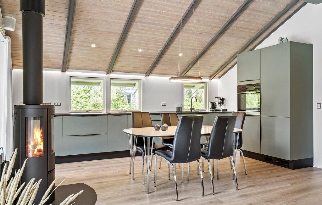 Hold en afslappende ferie i dette hyggelige træhus, som byder på ro og dejlig natur. Huset ligger idyllisk på en delvis lukket grund ud til en rolig vej. Indretningen er hyggelig og hjemlig med et tvist af moderne indretningsvalg. I alrummet er der lagt op til afslappende stunder i sofaerne eller alkoven med brændeovnens knitrende lyd i baggrunden. I det moderne og åbne køkken kan I lave alle døgnets måltider.
