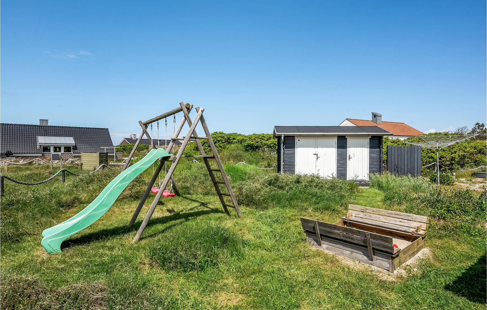 Den store terrasse ved feriehuset er lukket helt af, så her kan hunden eller jeres små børn løbe frit. De små kan også se frem til legeredskaber og en sandkasse. På grunden er der også en bålplads med flisebelægning.