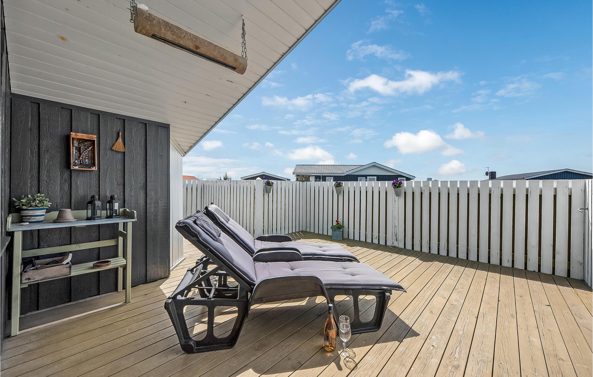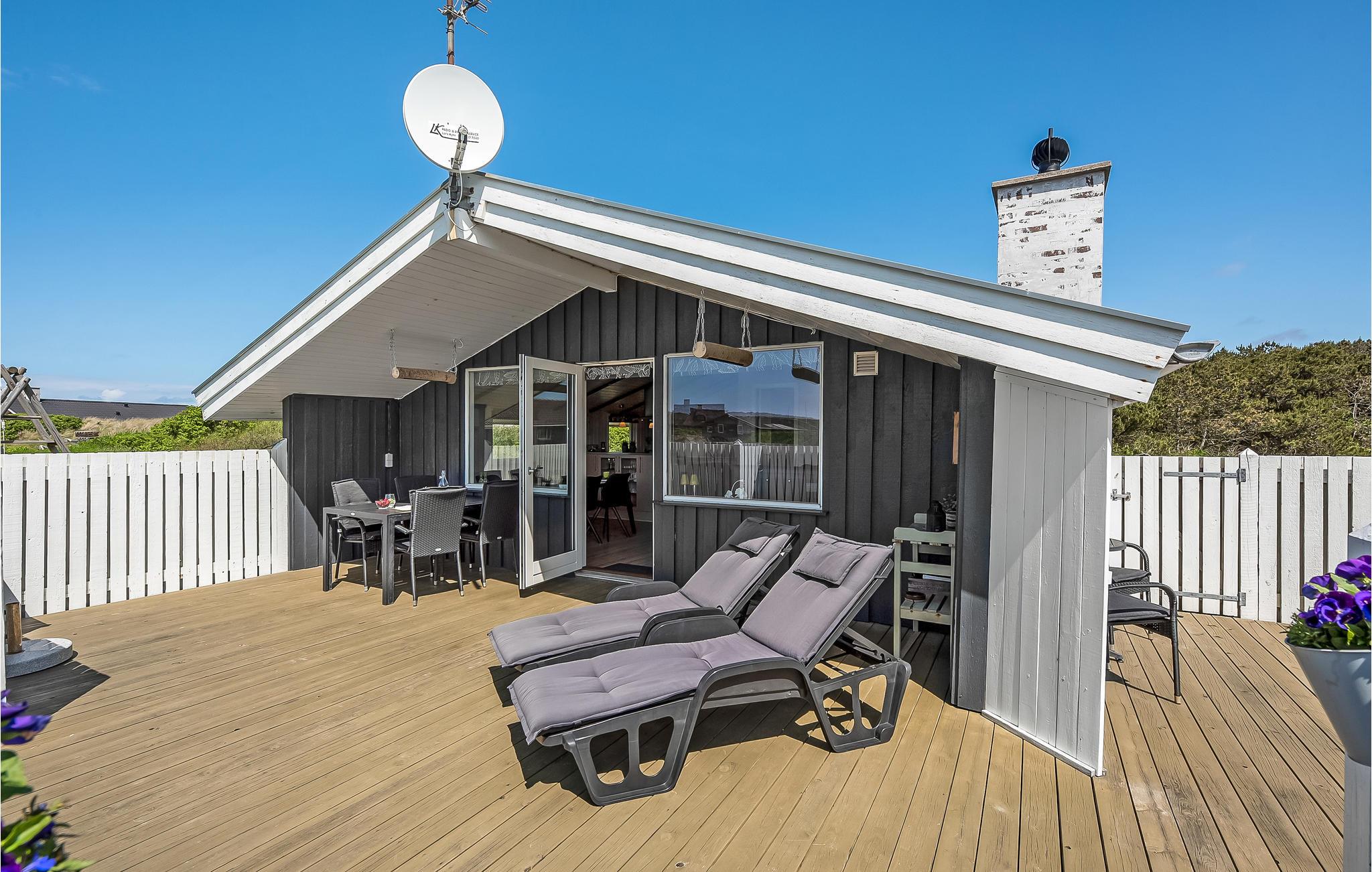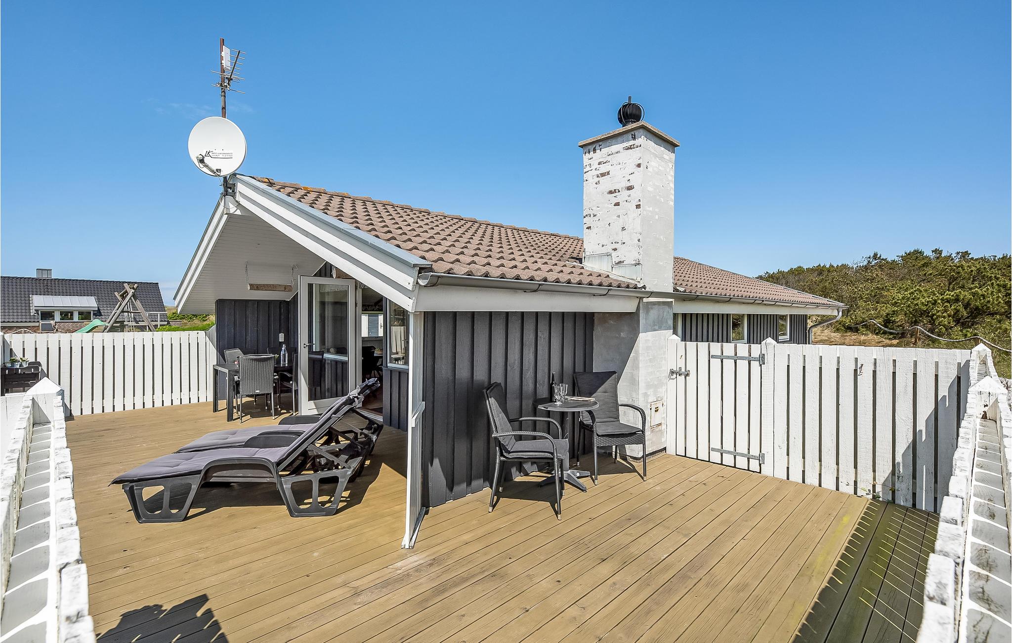 Hyggeligt sommerhus i Bjerregård tæt på Vesterhavet og Ringkøbing Fjord med stor terrasse og bålplads.