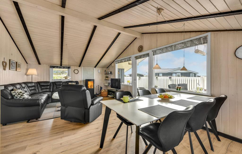 Huset er lyst og åbent med flotte, markede spær under taget. Det er ideelt til en ferie med hele familien, og jeres hund er også velkommen. Badeværelset har gulvvarme. Se frem til hyggelige aftener ved brændeovnen i stuen, hvilket skaber en behagelig atmosfære.