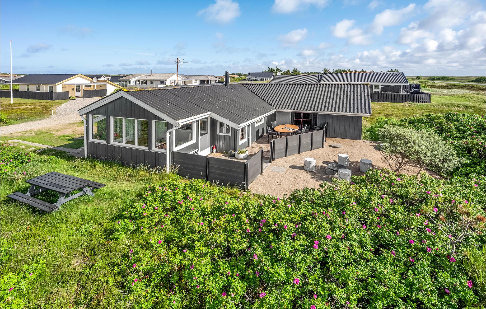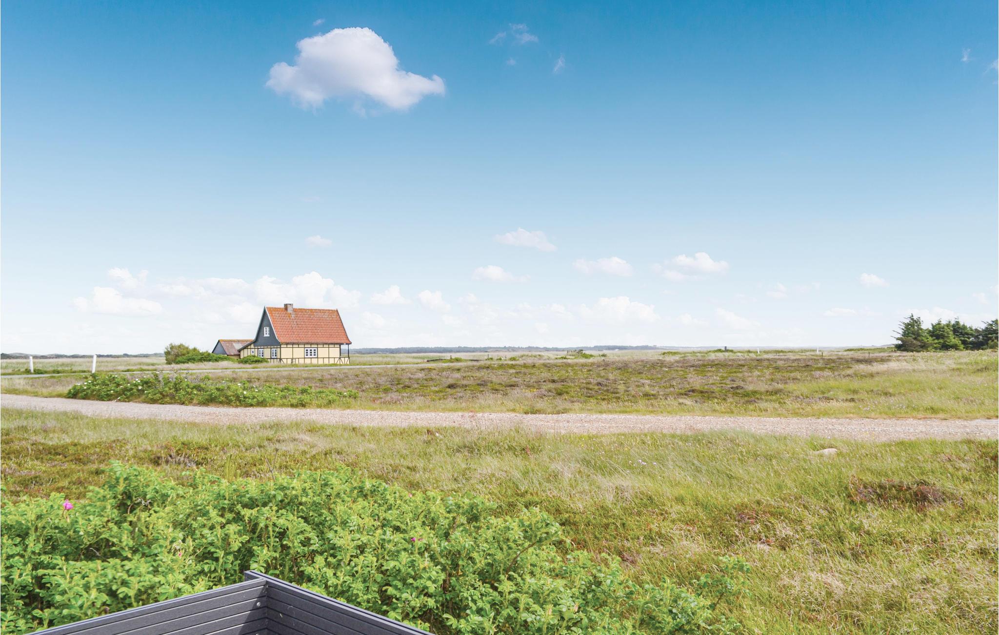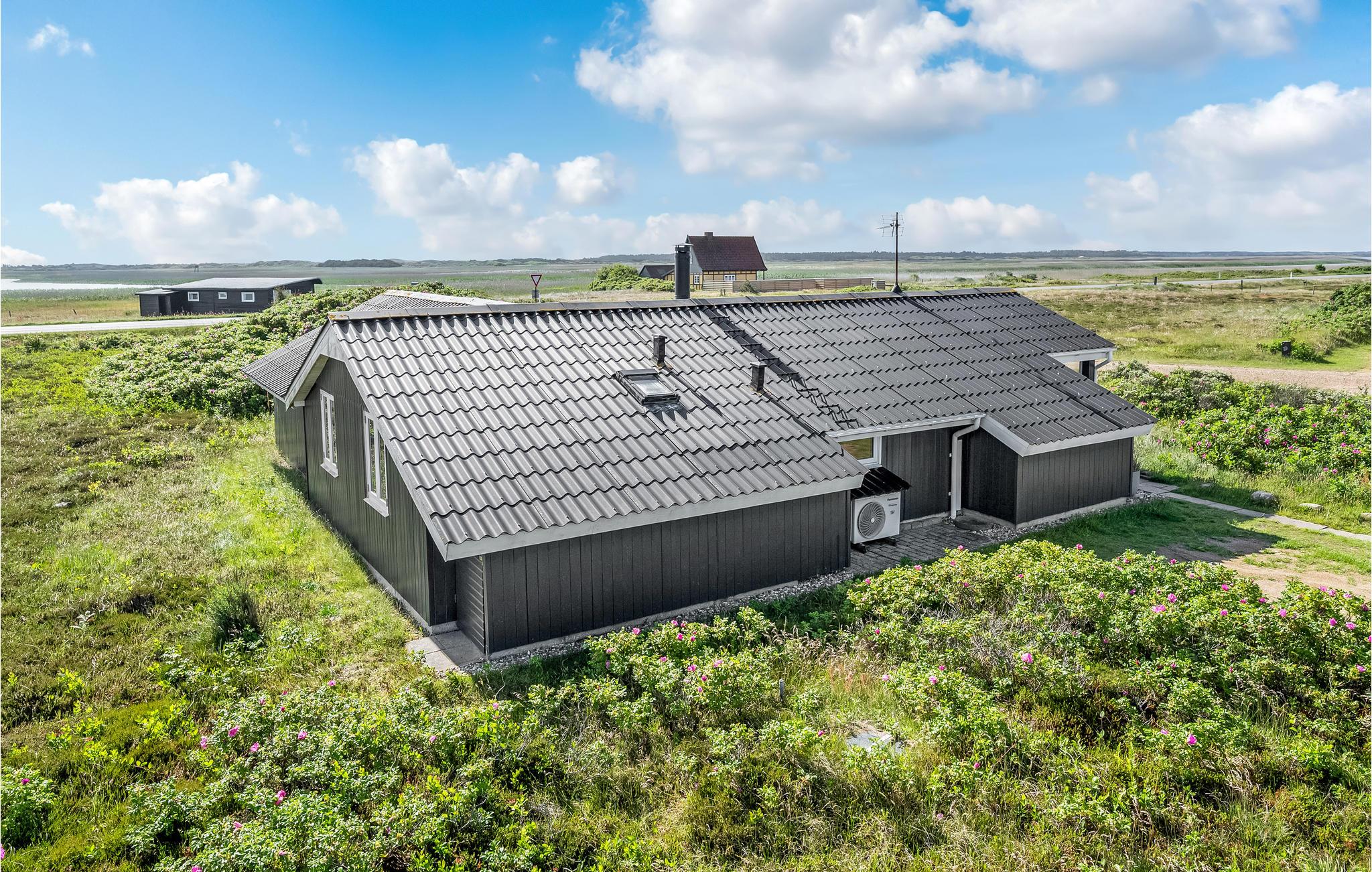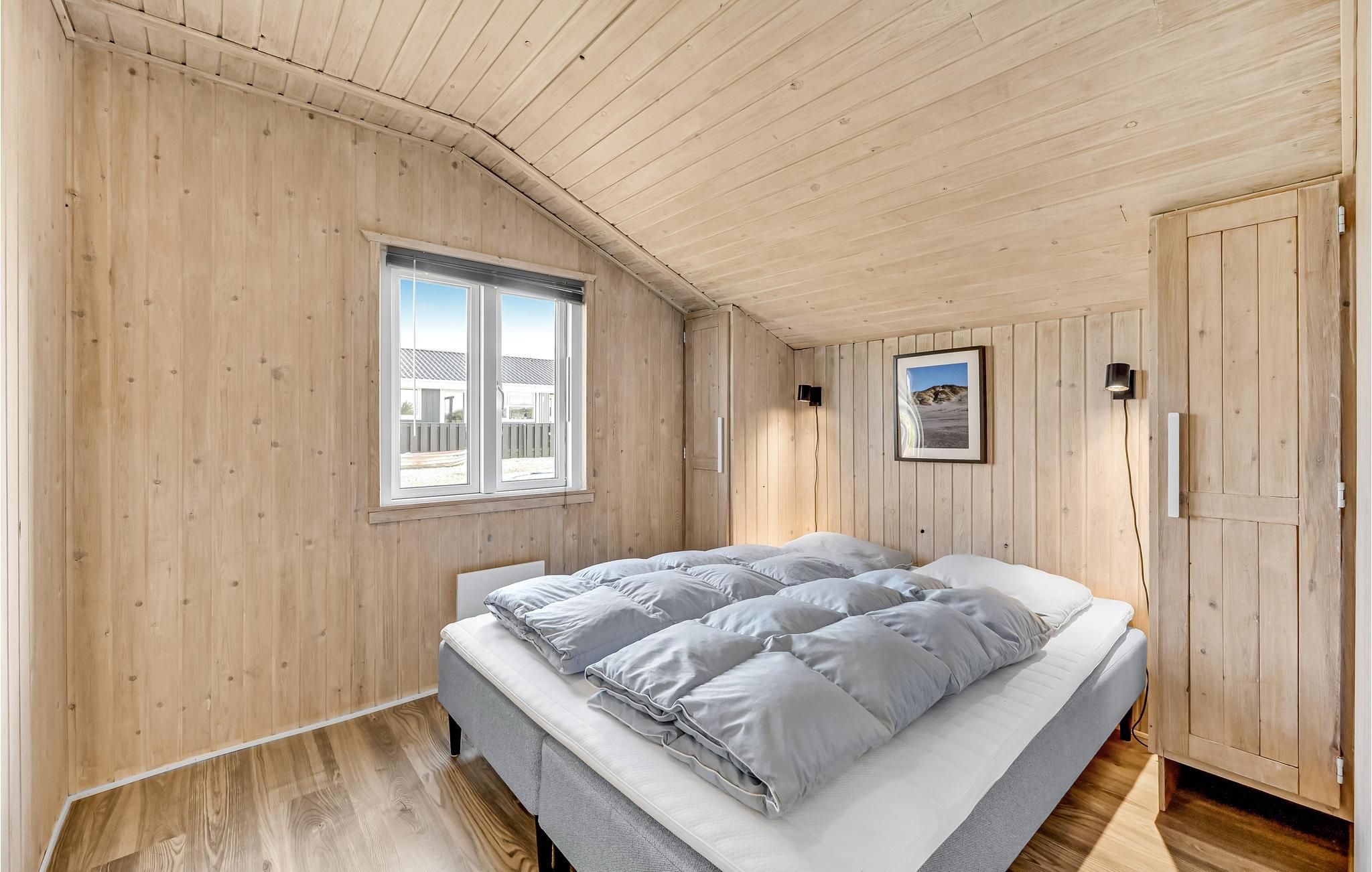 Dette hyggelige træhus med sauna ligger i Bjerregård på en smal jordstrækning mellem Nordsøen og Ringkøbing Fjord.
