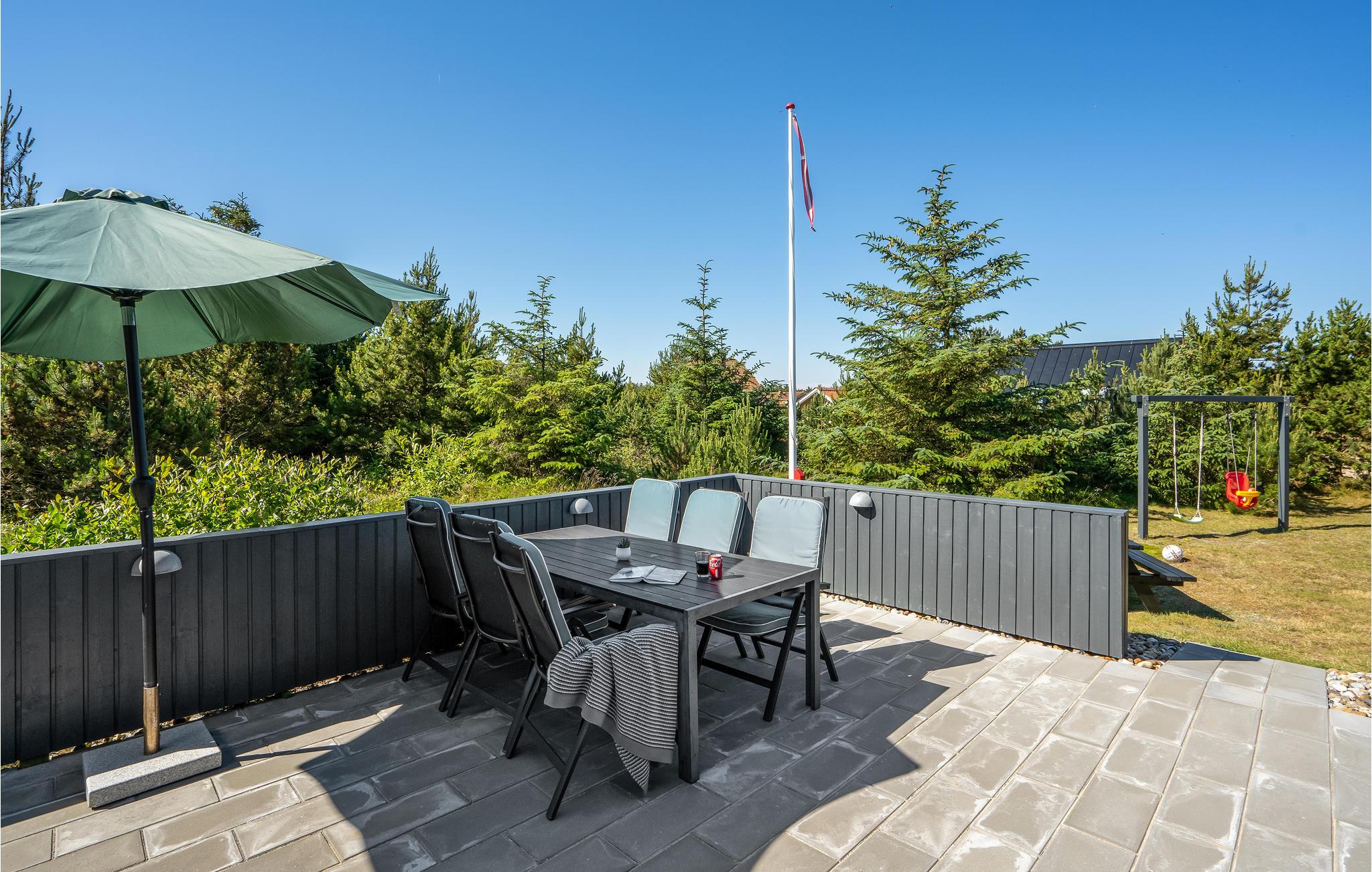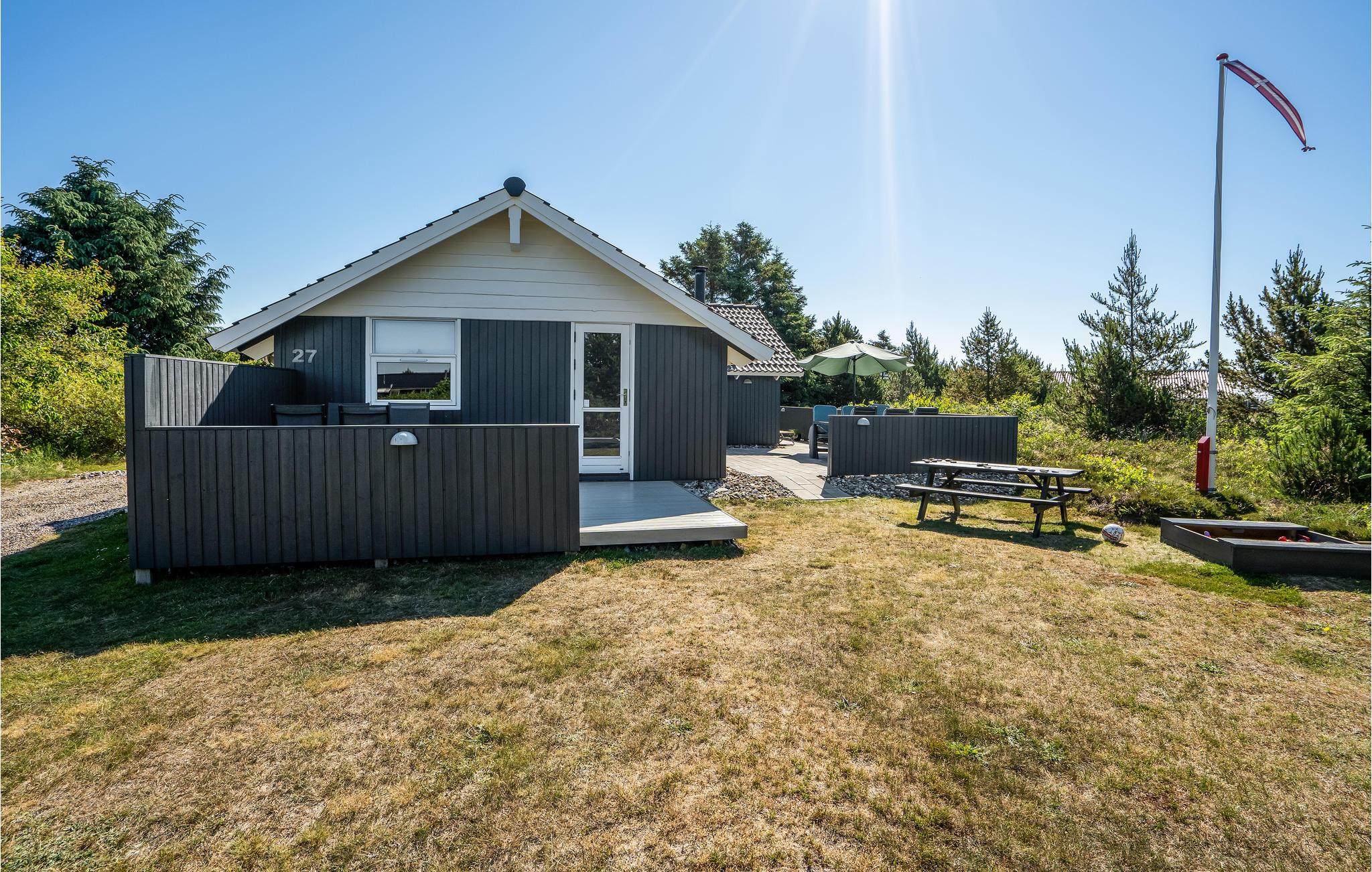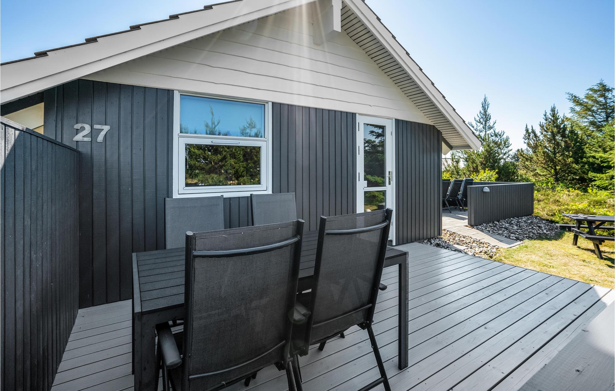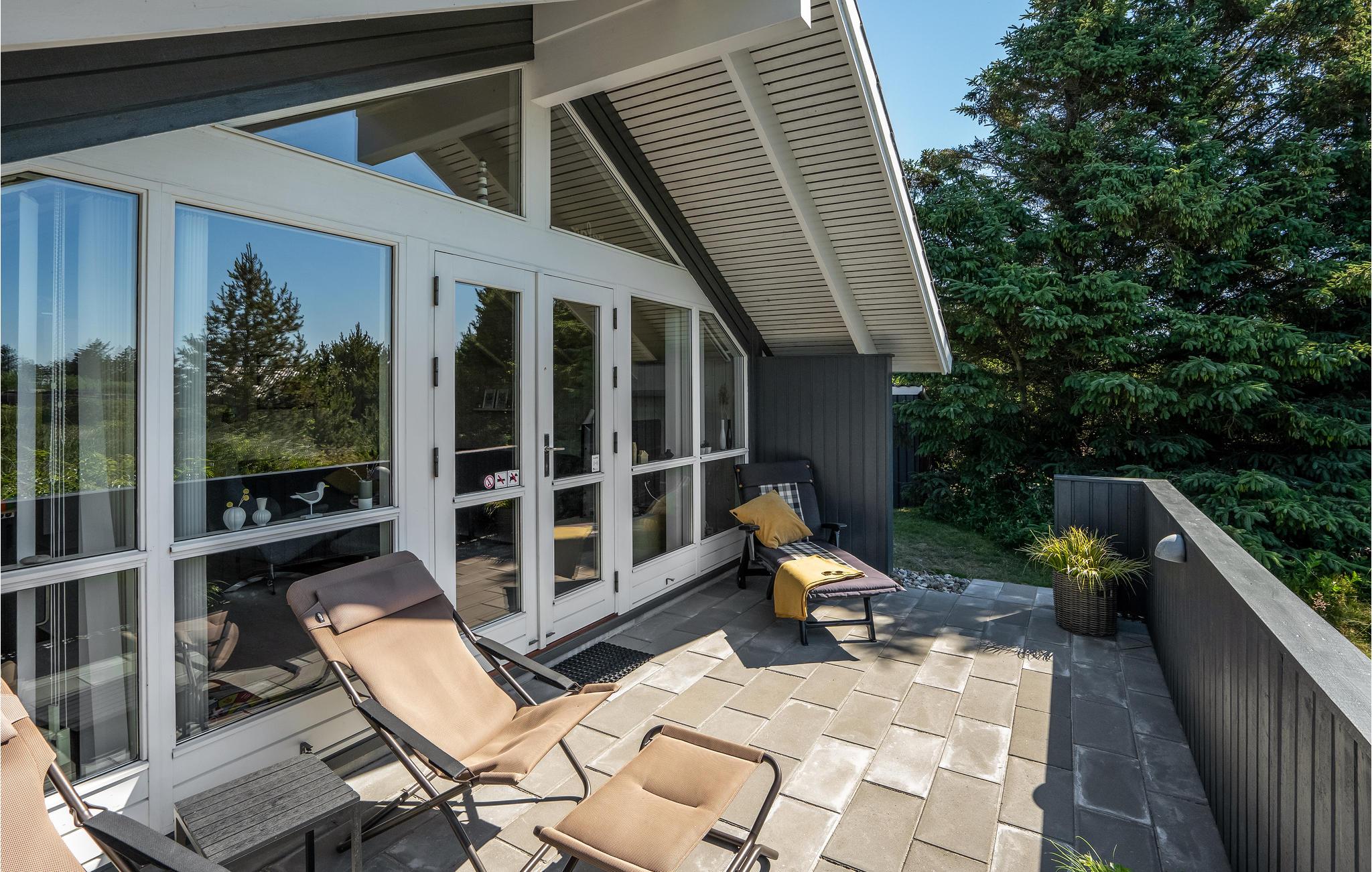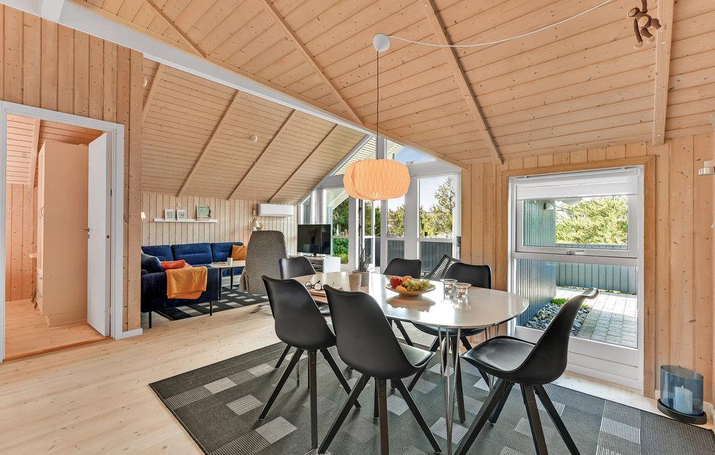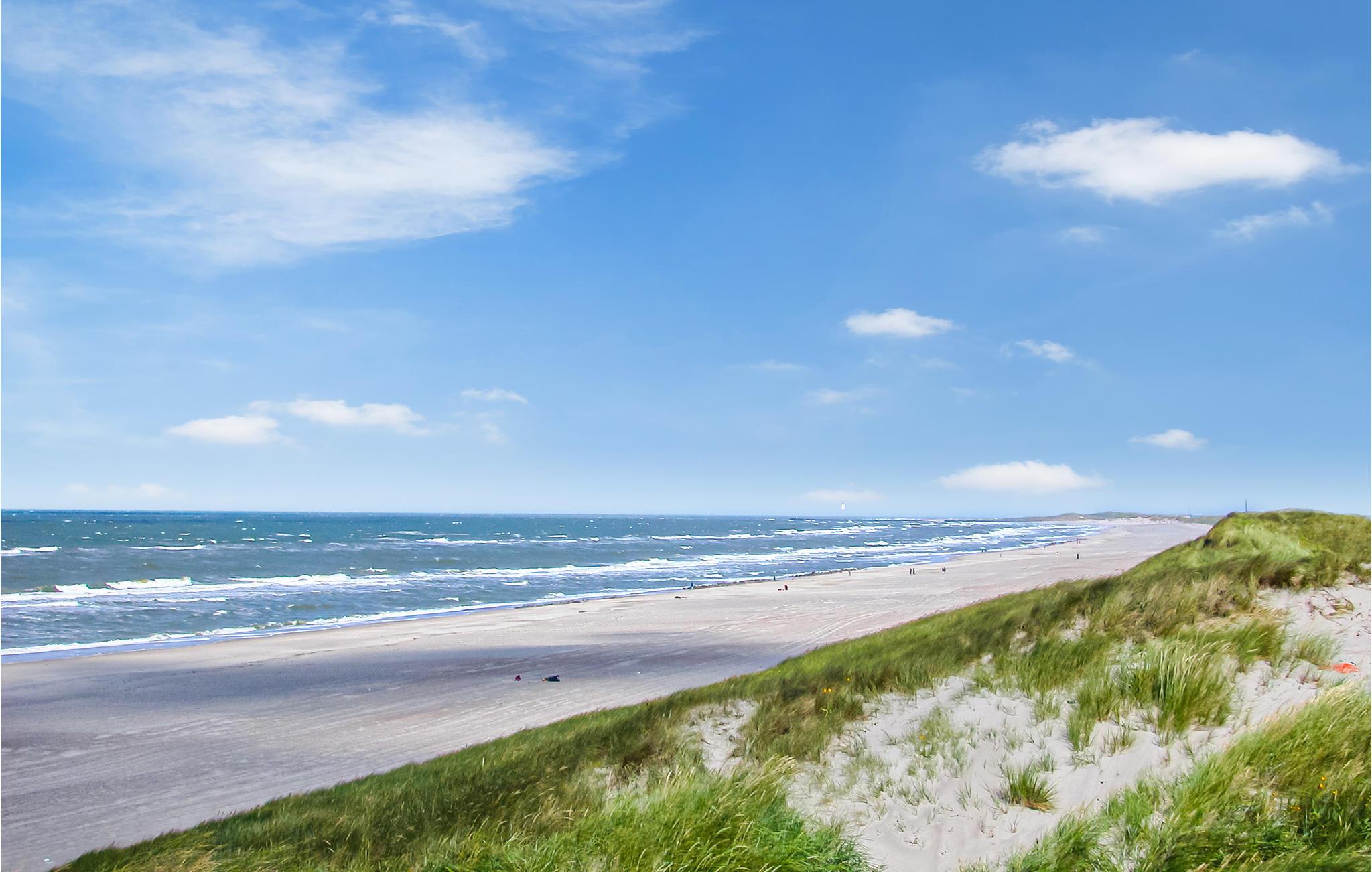 På en dejlig stor naturgrund ligger dette moderne og velholdte feriehus, som er smagfuldt og hyggeligt indrettet. I haven er der legeredskaber til børnene, ligesom det er skønt at sidde på terrassen, der er afskærmet af et hegn. Her er udendørs belysning, til de lange lune sommeraftner, hvor det er svært at rive sig løs og gå indendørs. Huset ligger i gåafstand af badestrand, fjorden og den lokale købmand. Området indbyder til lange gåture langs stranden eller i det uberørte klitlandskab.