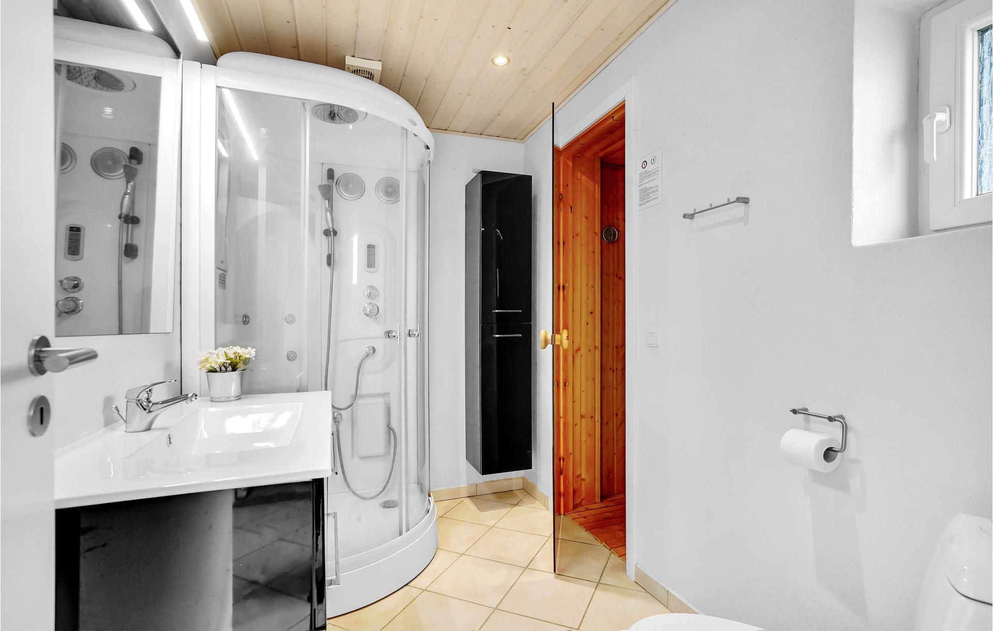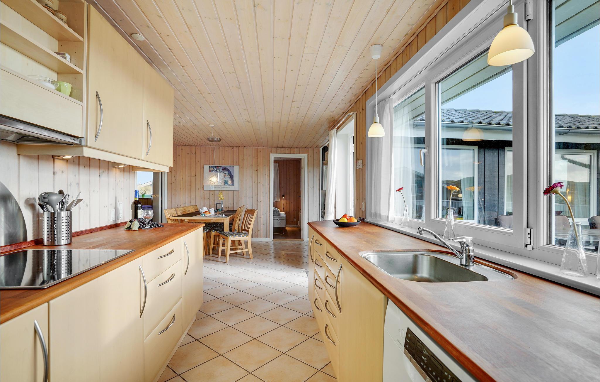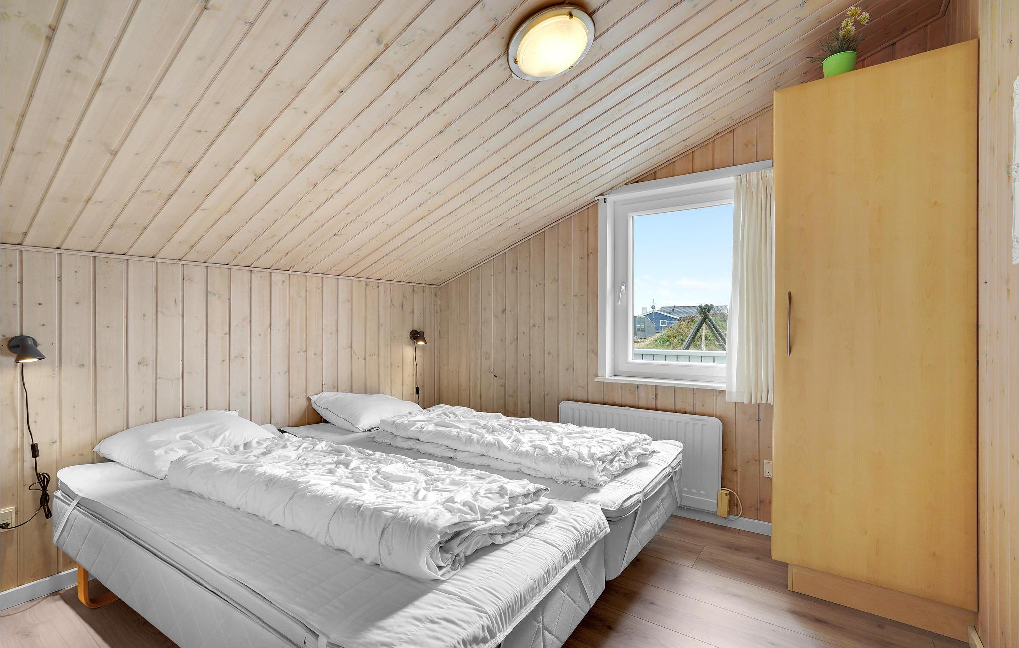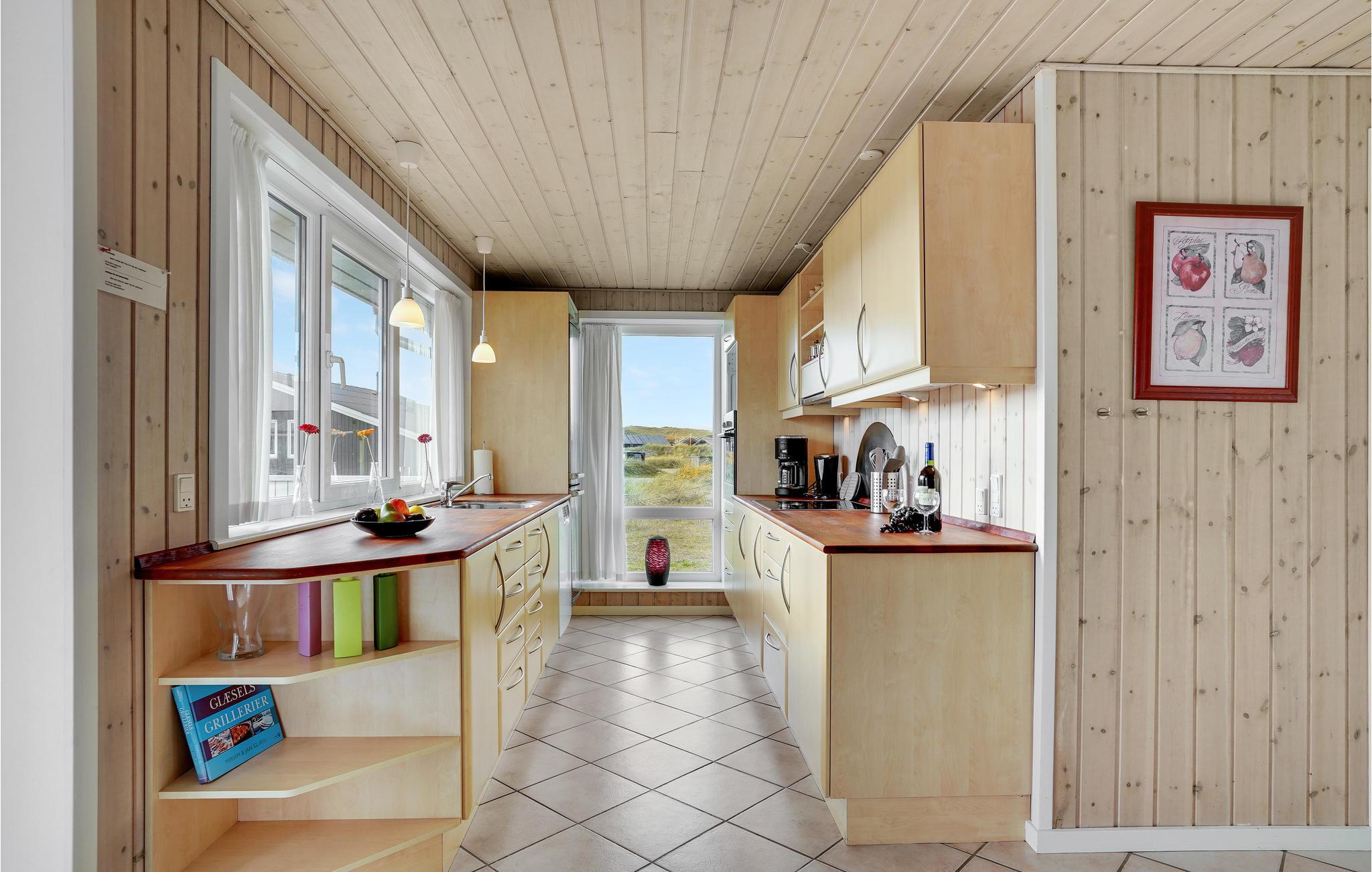 Et stort og praktisk køkken/alrum støder op til husets dagligstue, hvor de store vinduespartier giver et godt lys samt udsigt til området og klitterne. Lige bag klitterne venter stranden og det til alle årstider fascinerende Vesterhav. I huset er der træ- og klinkegulve overalt samt fire gode værelser alle med dobbeltsenge og i det ene værelse et ekstra tv. De to komplette badeværelser er smart indrettede, således at der er sauna i det ene og spabad i det andet. Husets store terrasse med en integreret sandkasse er helt lukket og derfor perfekt til de mindre børn eller hunden, og da terrassen går næsten hele vejen rundt om huset, kan I altid finde en god lækrog. Her er desuden et aflåst skur, til f.eks. cykler, brænde og lignende.