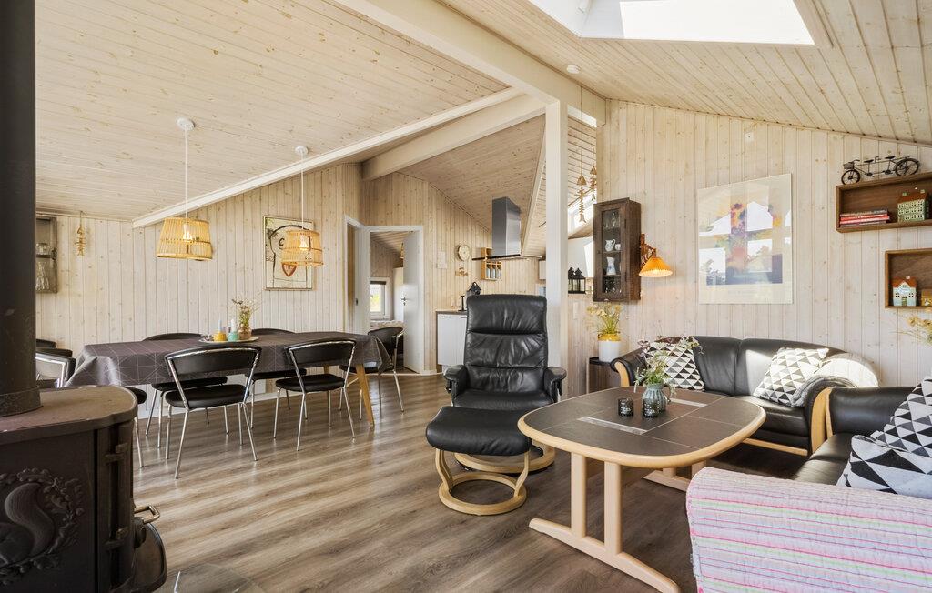 Velkommen til dette dejlige hus med store vinduer, der strækker sig helt til tagryggen og bader det åbne opholds- og spiseområde med naturligt lys og udsigt over klitterne. Sæt jer godt til rette i sofaen eller nyd en stille stund i den komfortable lænestol med fodskammel. Brug alkoven som et lille helle, når I skal læse videre i en spændende feriekrimi eller som en ekstra soveplads. På kølige aftener kan I tænde op i brændeovnen og mærke den behagelige varme brede sig, mens I samles omkring det store spisebord. Det åbne, moderne køkken med kogeø lægger op til at lave maden sammen og slappe af sidst på ??dagen. Efter en lang gåtur på stranden kan I hvile ud i spabadet.