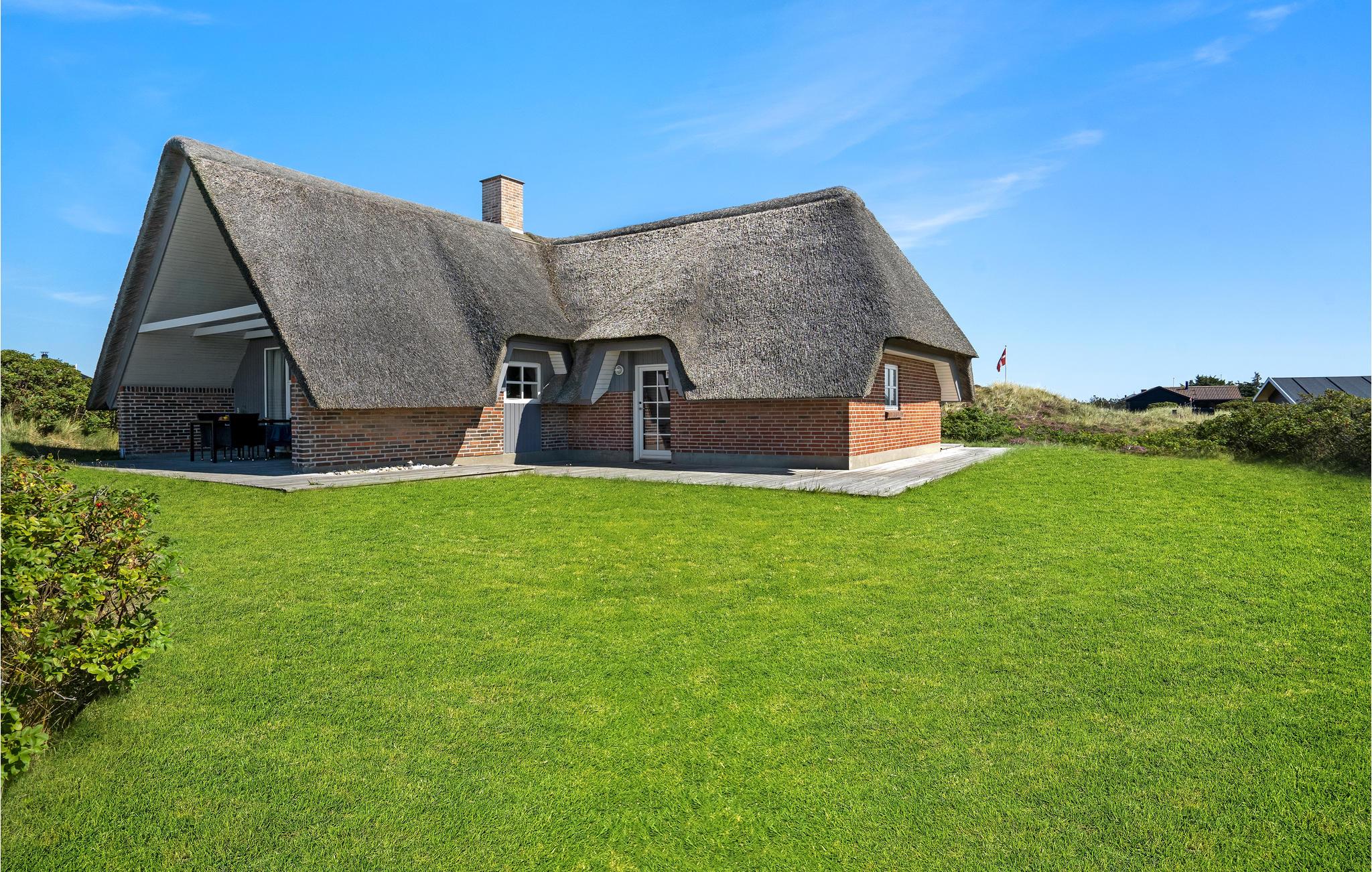 Et charmerende stråtækt sommerhus der ligger omgivet af en stor naturgrund kun 300 m fra Vesterhavet i Bjerregård. Huset er virkelig flot, velbygget og velholdt og vedligeholdes konstant, og overalt fremstår det lyst og moderne og ikke mindst hyggeligt. Huset er indrettet med en fin entre, et velindrettet køkken, som er i åben forbindelse med et dejligt opholdsrum, som er kombineret spisestue og stue med brændeovn, med dør ud til en af husets dejlige terrasser og trappe til 1. sal. I stueetagen er der 2 soveværelser med dobbeltsenge, og på 1. sal 1 med 2 enkeltsenge. På 1. sal er der en åben repos og et dejligt soveværelse med to enkeltsenge, herfra er der en skøn udsigt til Ringkøbing Fjord. I huset er der et indbydende badeværelse med bruser, spabad og adgang til sauna, og derudover også et ekstra toilet. Udenfor er der rig mulighed for at finde en hyggekrog med læ på en af husets terrasser, og det tager kun få minutters gang at komme til stranden, hvor I kan tage en svømmetur på en varm sommerdag eller en vandretur langs havet med skumsprøjt og bølgebrus om vinteren og året rundt lade jer betage af uforglemmelige solnedgange. Fra Bjerregård og op langs Holmsland Klit kan I cykle eller vandre på naturstien, som snor sig langs klitterne. Der er også gode muligheder for forskellig slags vandsport på Ringkøbing Fjord, rideture i naturen eller et spil minigolf for hele familien. Den nærmeste by er Hvide Sande, med mange butikker og hyggelige restauranter og cafeer.