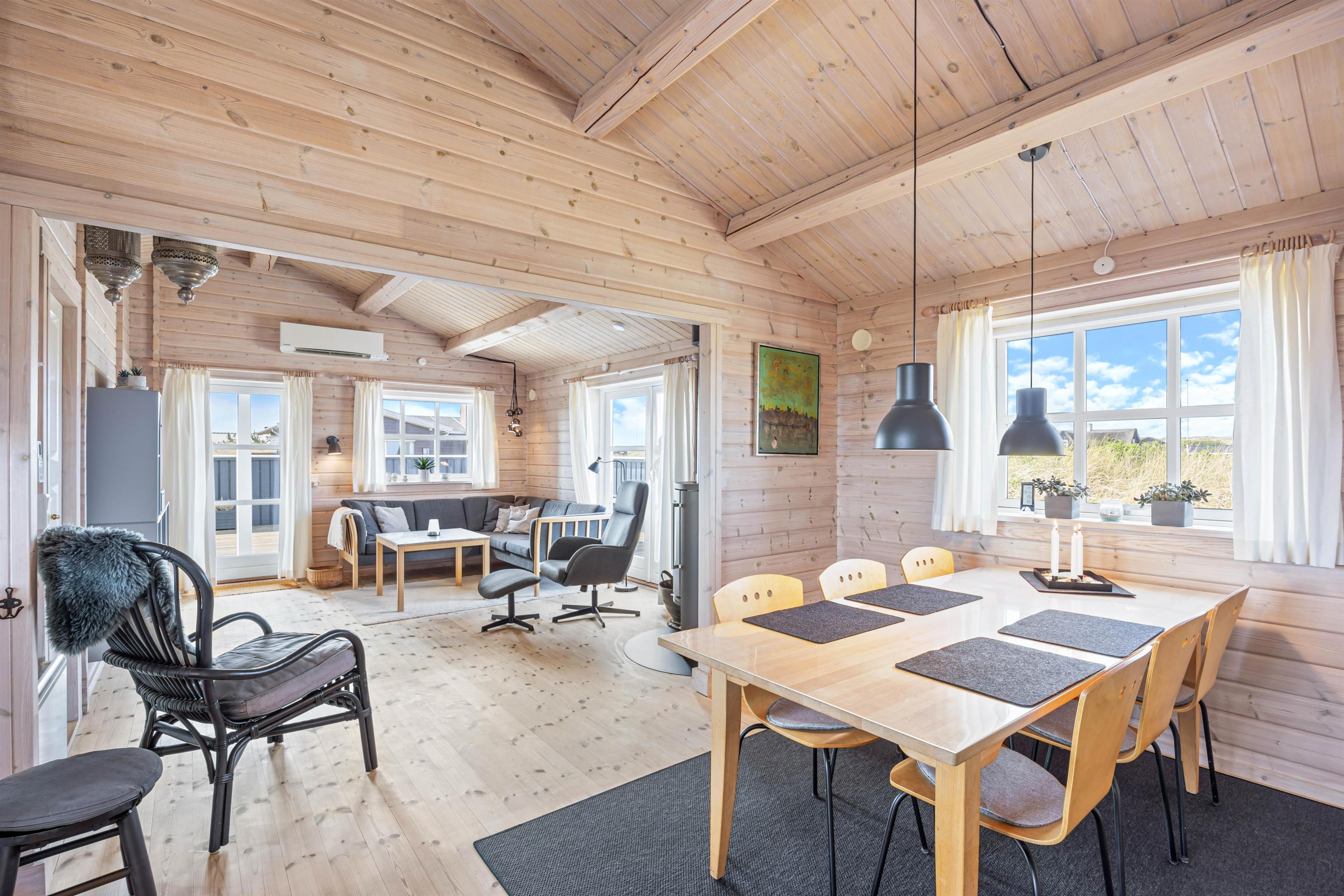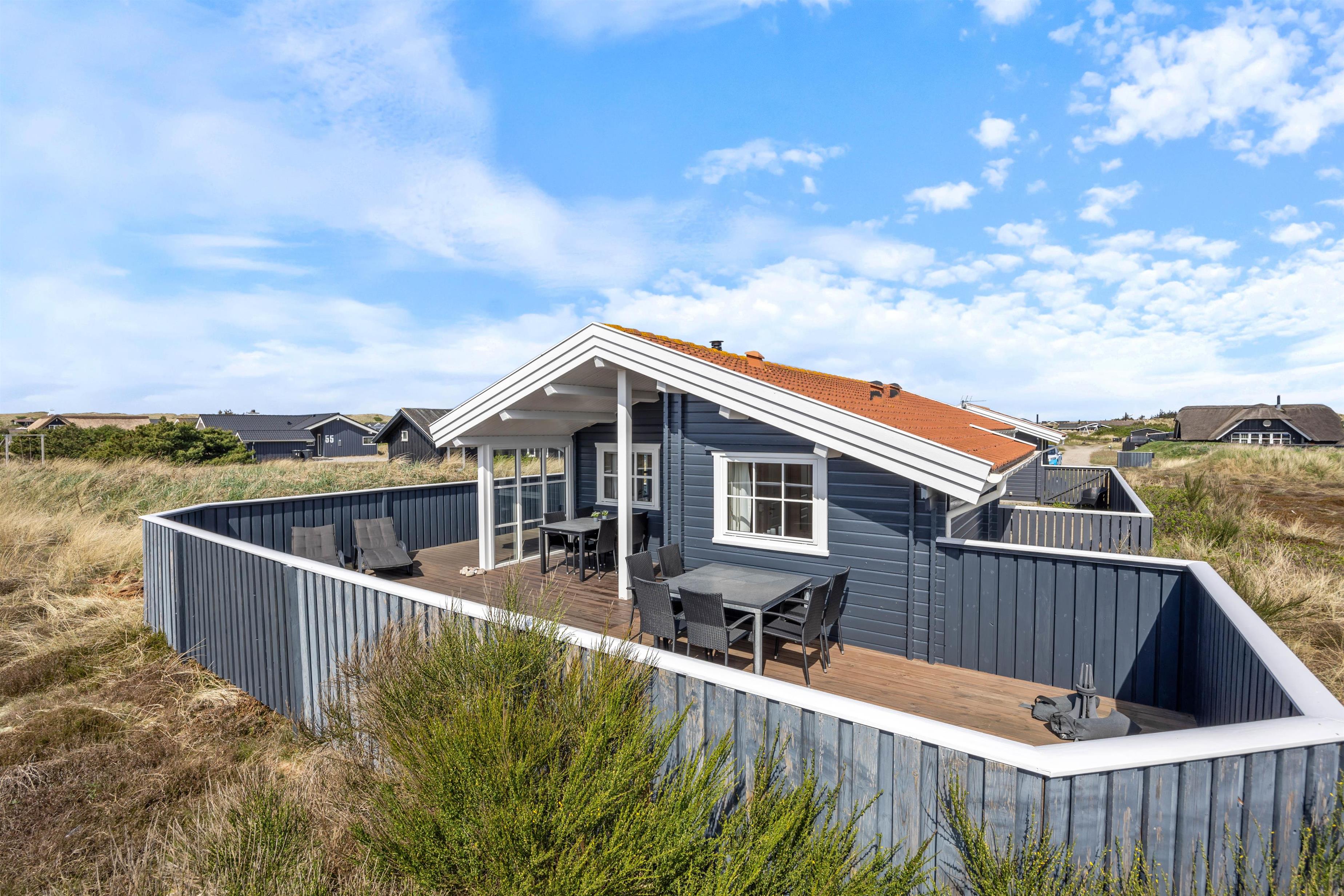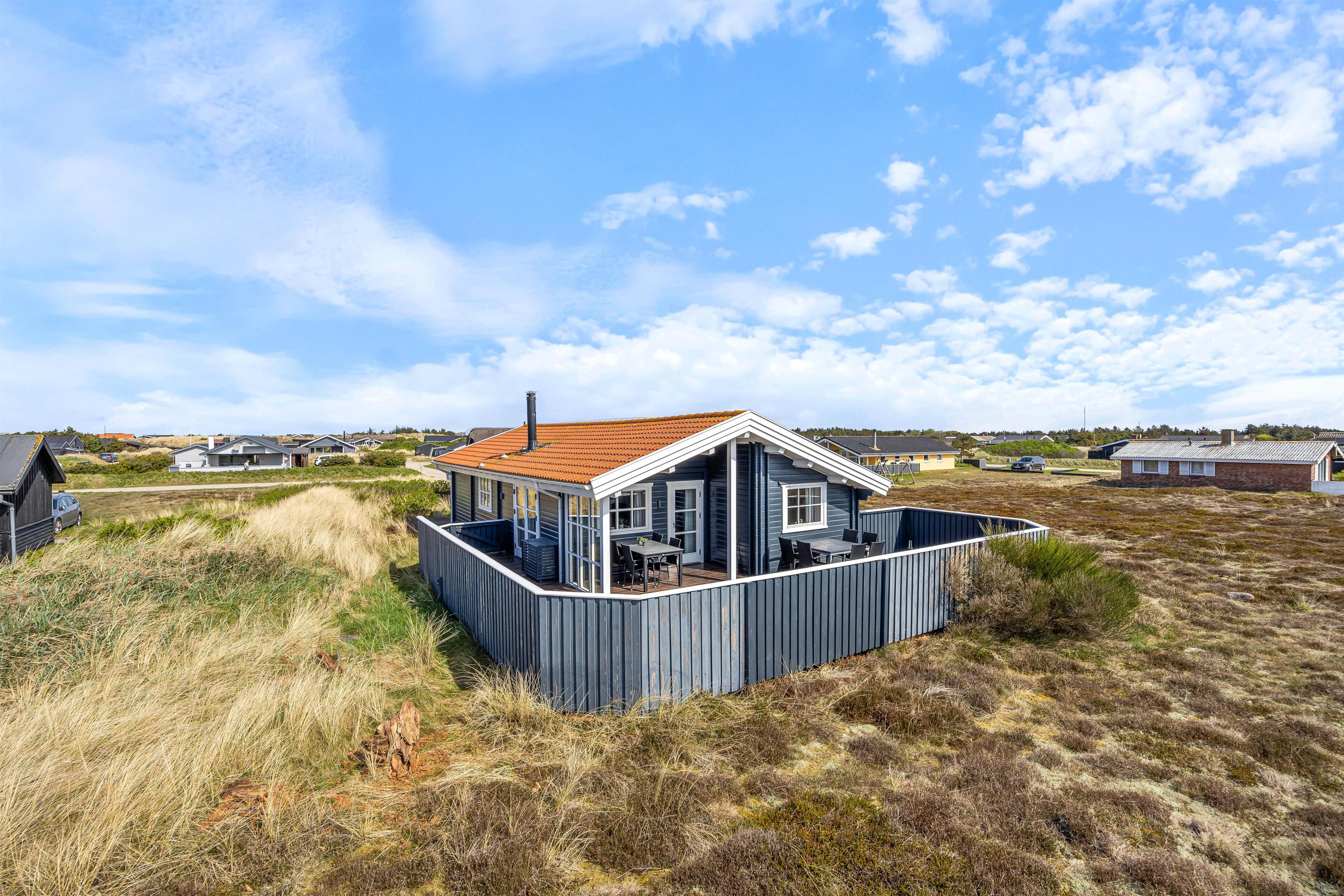 På en lyngklædt grund i Bjerregård står dette skønne feriehus og venter på jer. Træhuset udstråler ægte ferieidyl, og indenfor byder en venlig og indbydende indretning jer varmt velkommen i jeres feriehjem. De skønne, læfyldte terrasser giver jer mulighed for at nyde naturen helt tæt på, og kun 500 meter væk ligger det brusende Vesterhav.