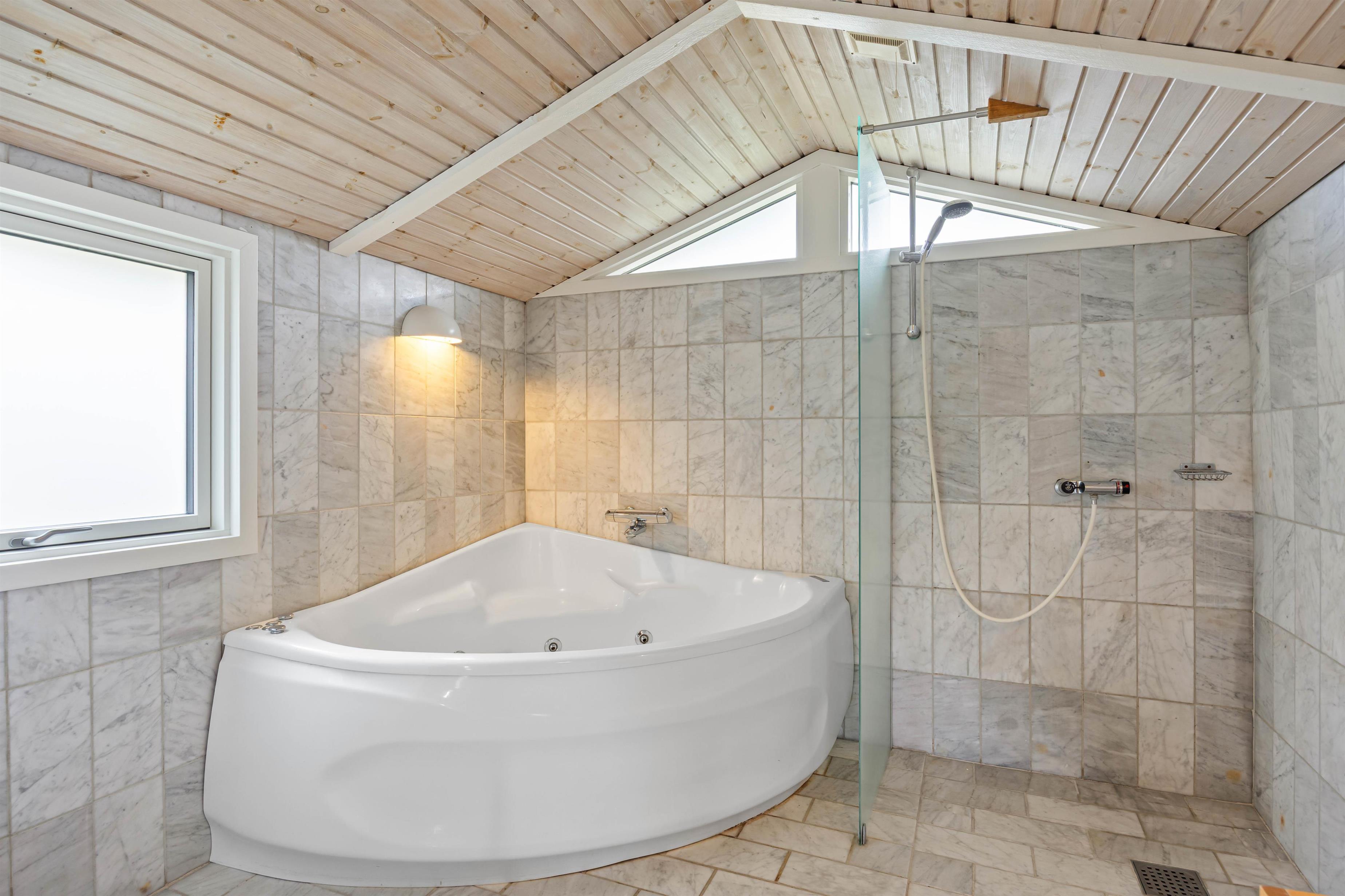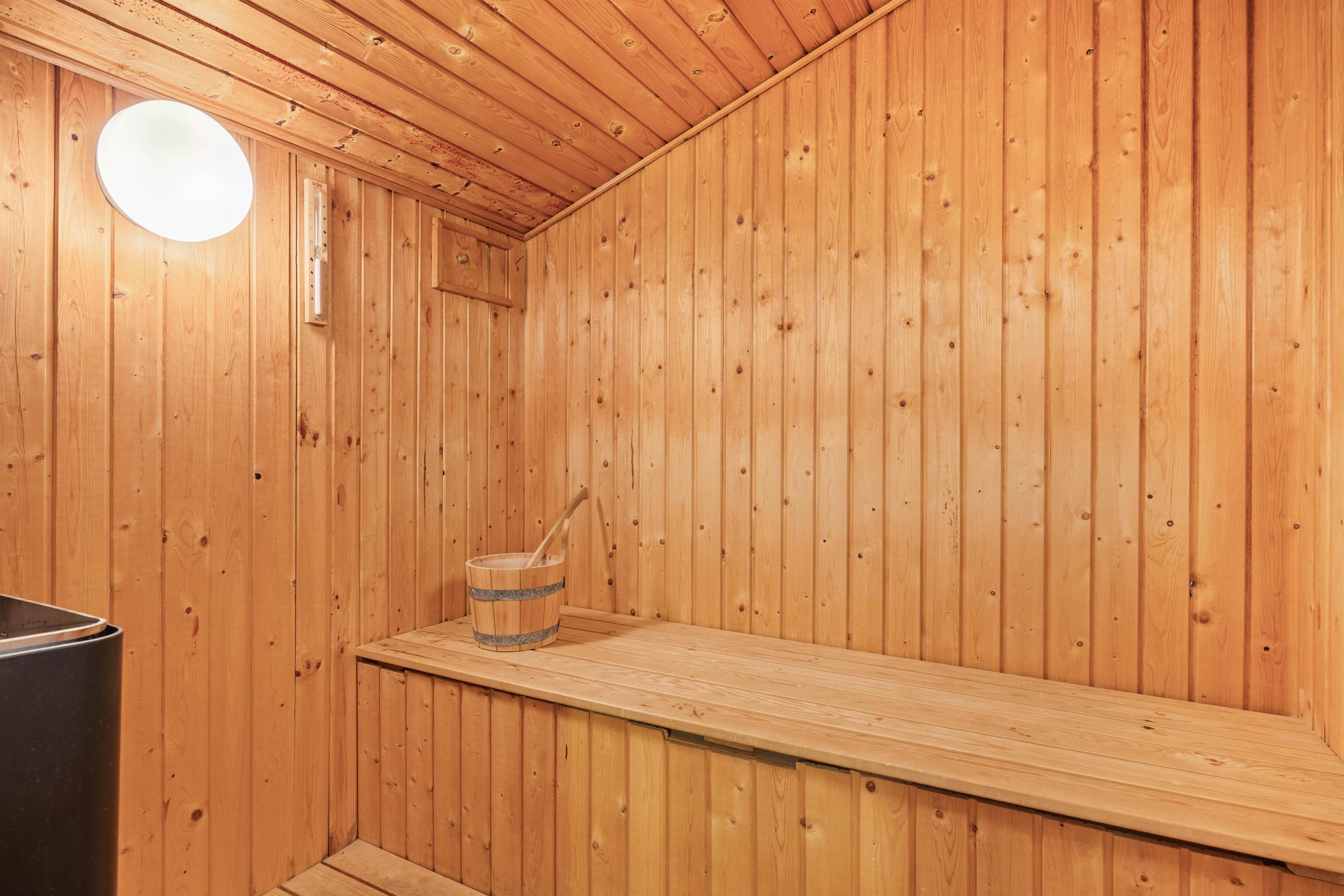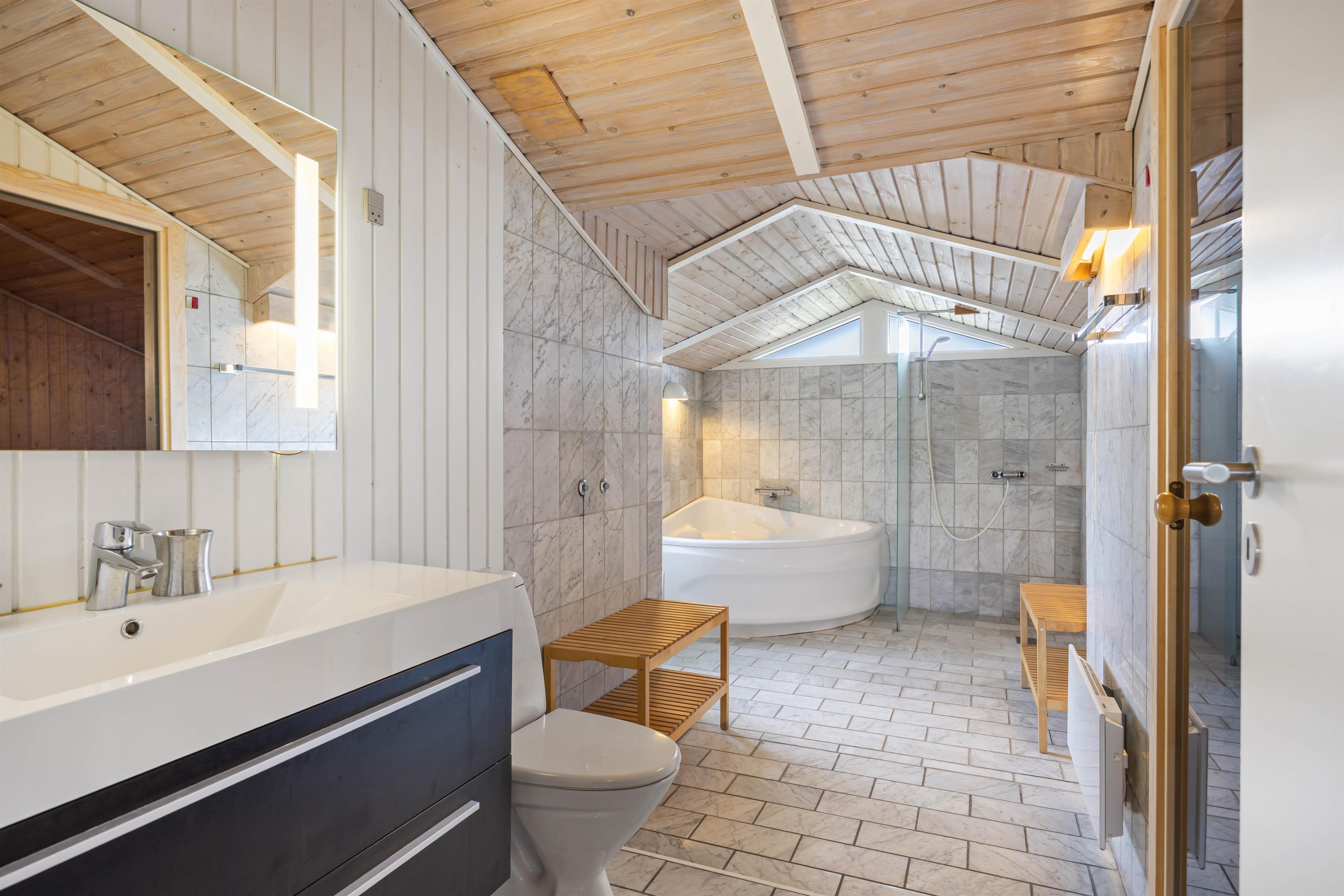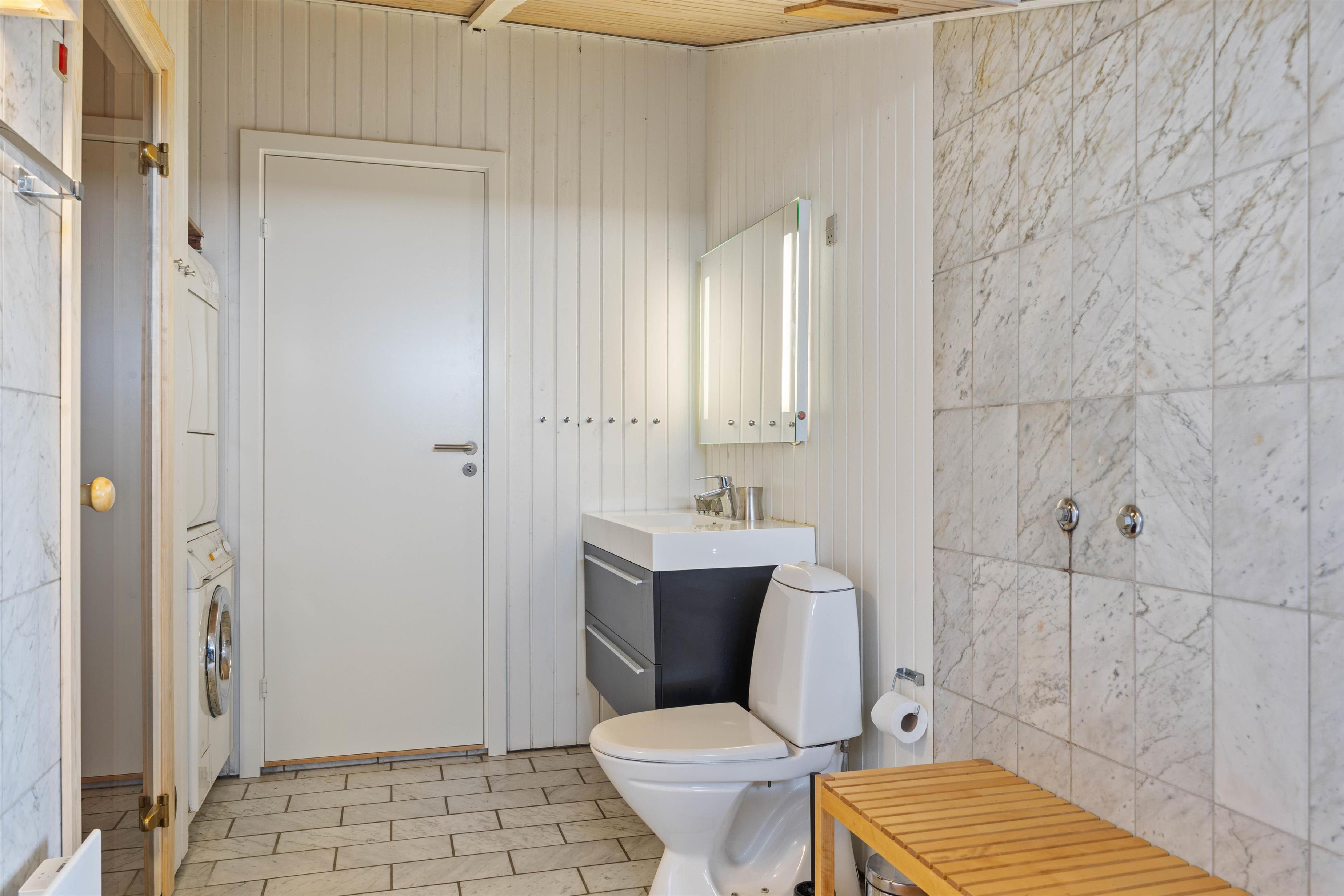 På det store badeværelse er der både spabad og sauna. Det er helt sikkert noget børnene vil nyde. Men mor og far kan sikkert også hurtigt blive fristet til en afslappet stund her. Desuden er der både vaskemaskine og tørretumbler i sommerhuset, så I har mulighed for at have rene håndklæder efter en tur i spabad og sauna.