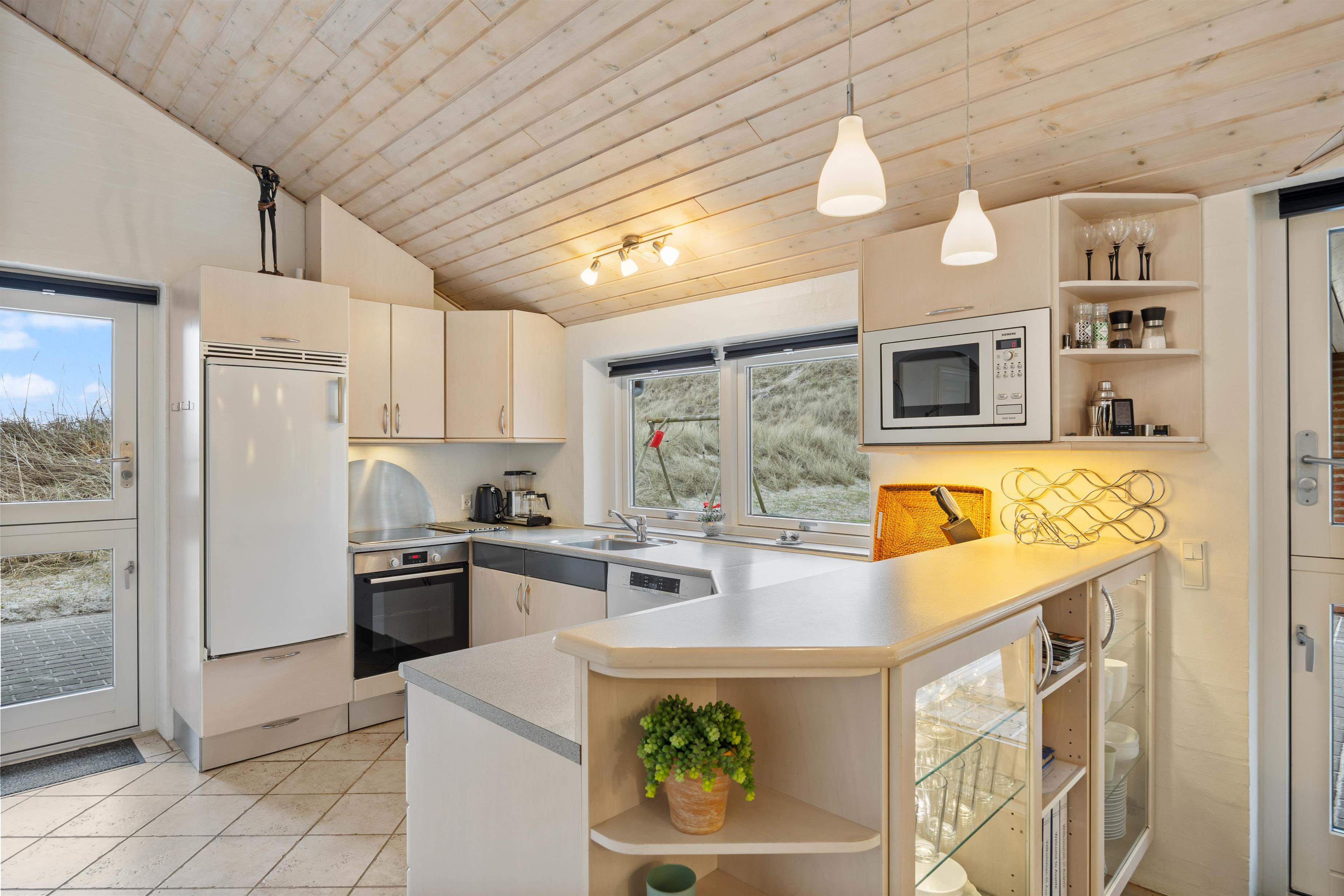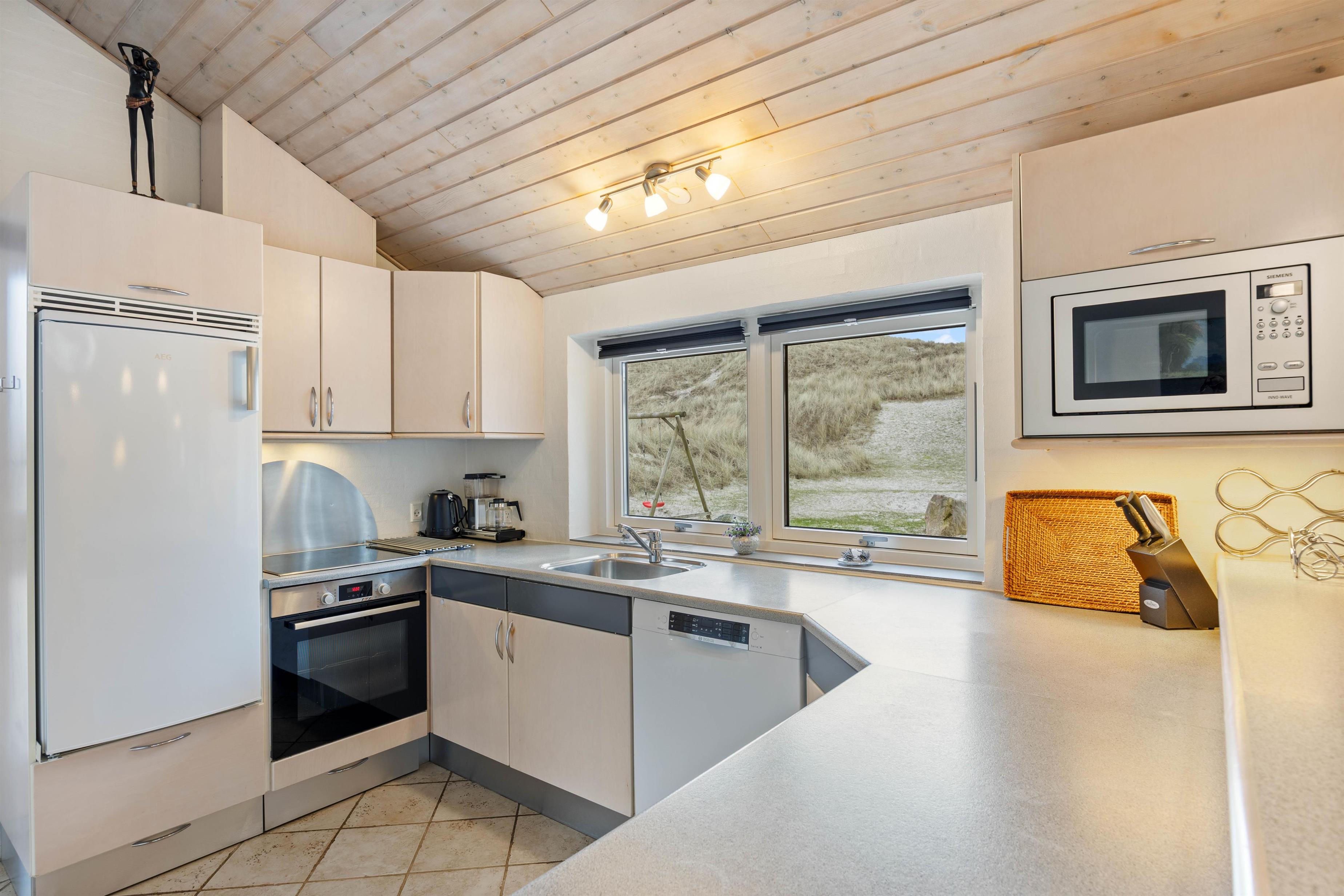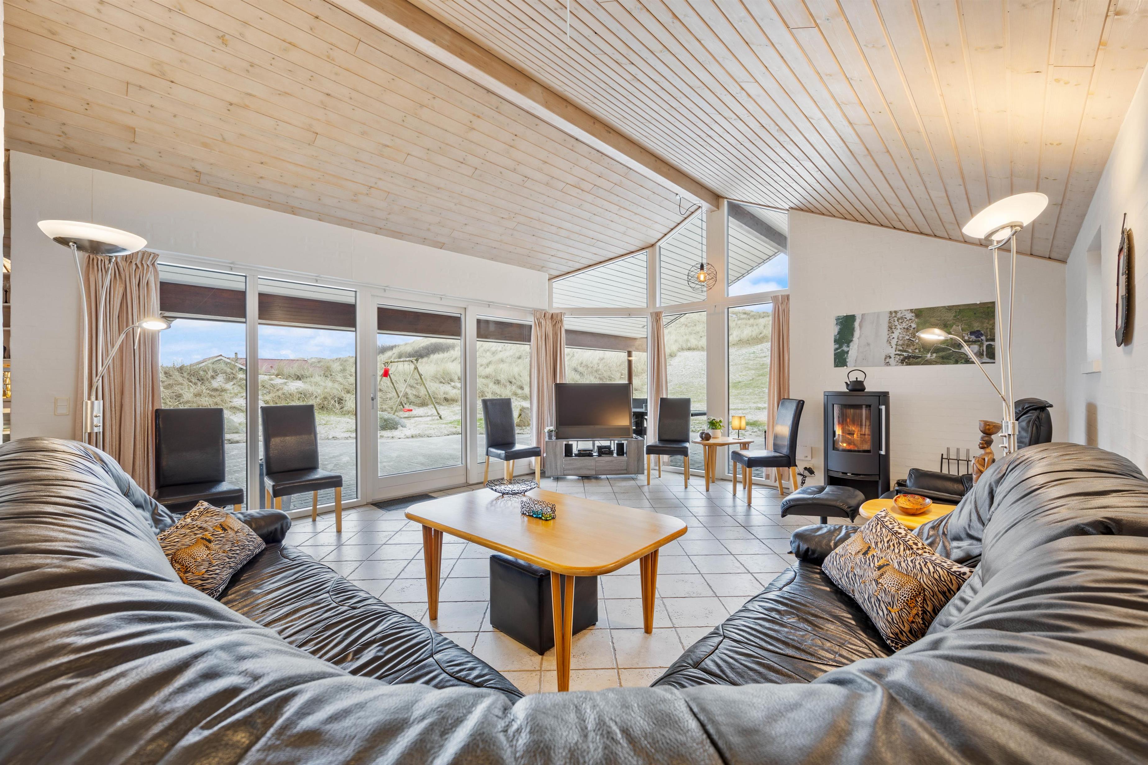 Fra de store panoramavinduer i opholdsstuen er der et flot lysindfald og herfra er der smuk udsigt til klitterne. Overalt i huset er der klinkegulve med gulvvarme, og opvarmningen sker med en energivenlig luft-til-vand varmepumpe.