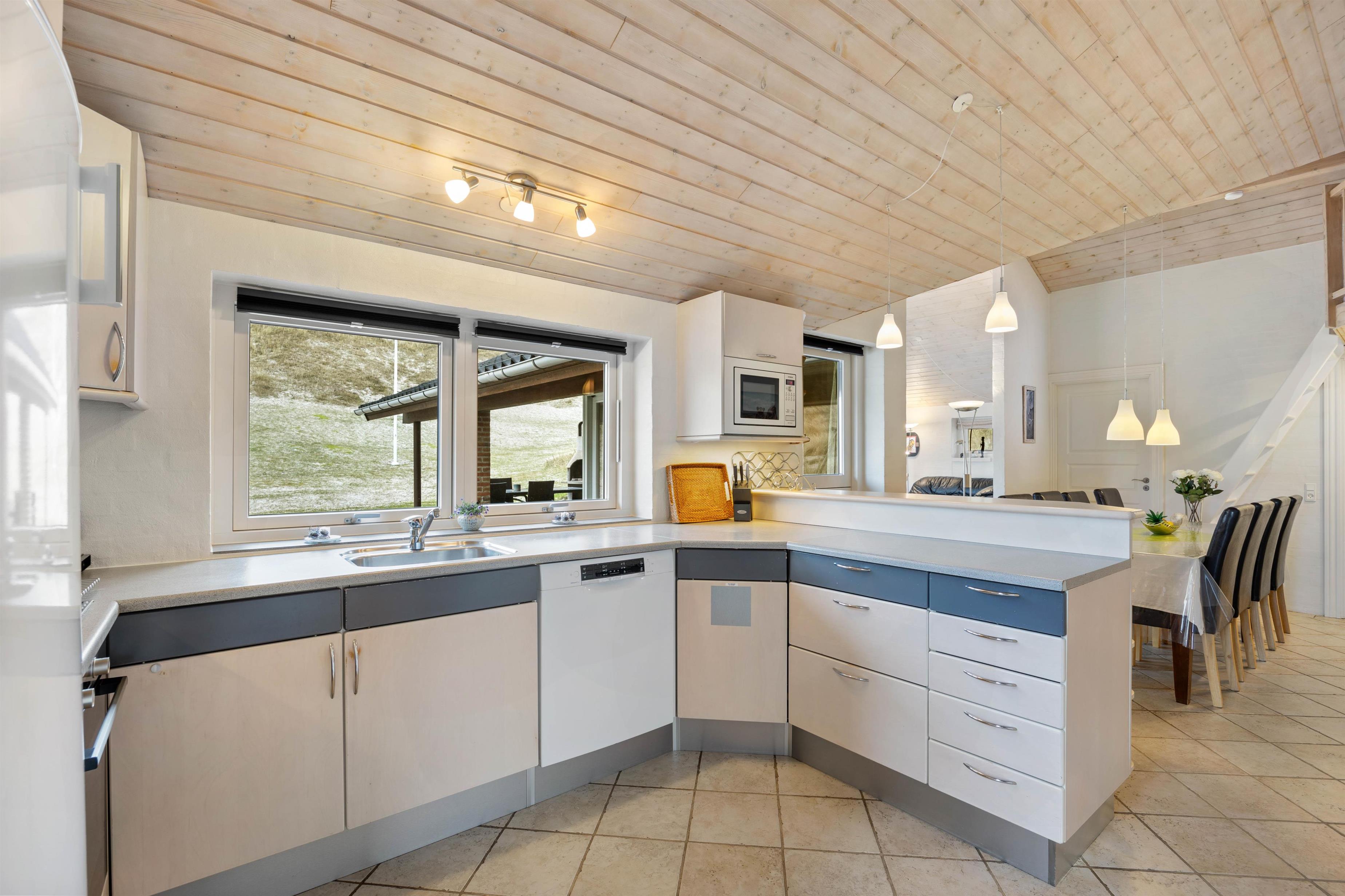 Køkkenet er velindrettet og meget veludstyret. Spisestuen ligger i åben forlængelse af køkkenet og fra spisestuen er der åbent ind til den store flotte opholdsstue, som er smagfuldt møbleret.