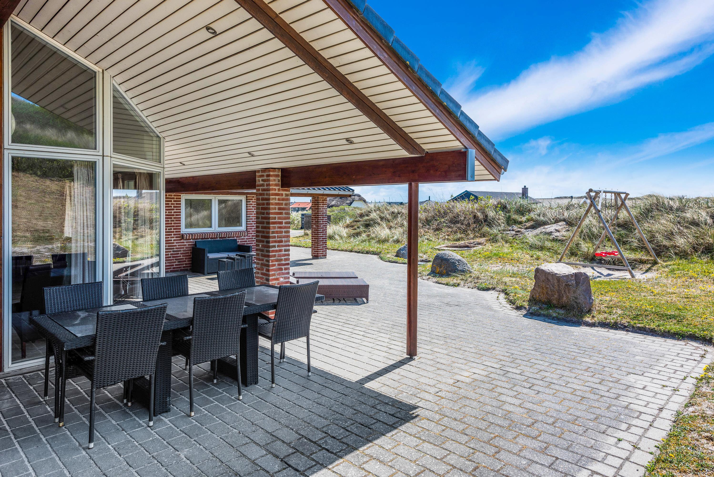 Terrassen er delvist overdækket og indrettet med udekamin, havemøbler, liggestole og grill. Til ungerne er der masser af plads at boltre sig på og her er opstillet gynger og sandkasse.