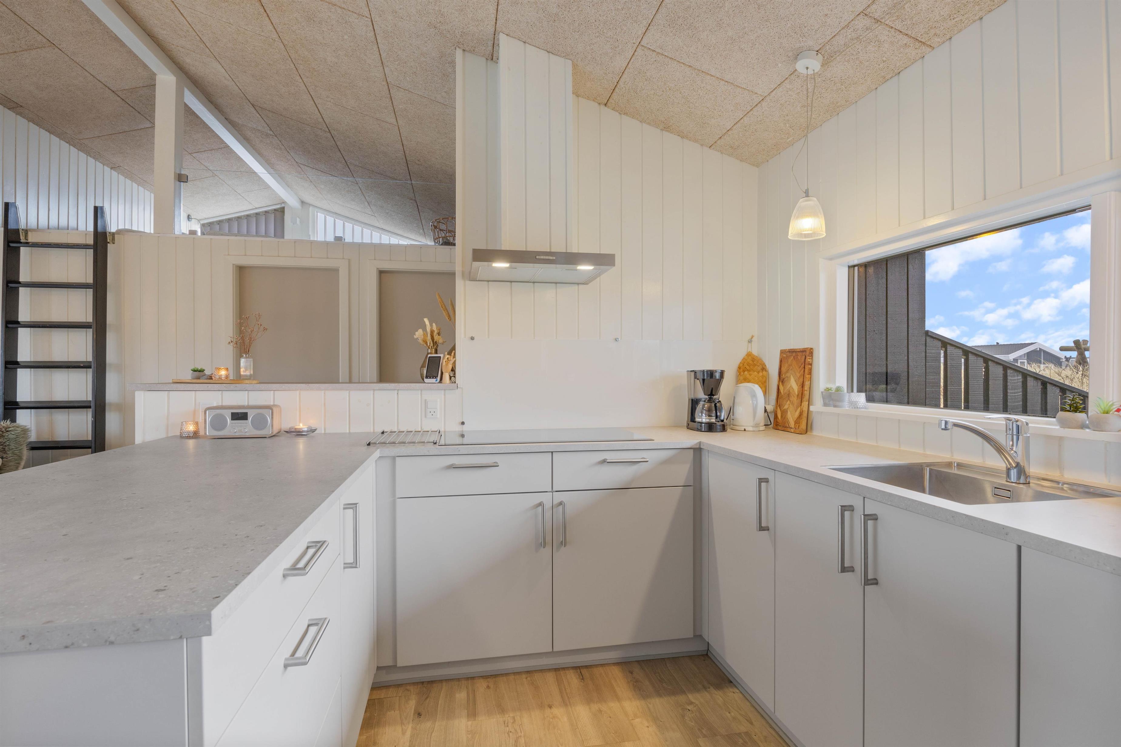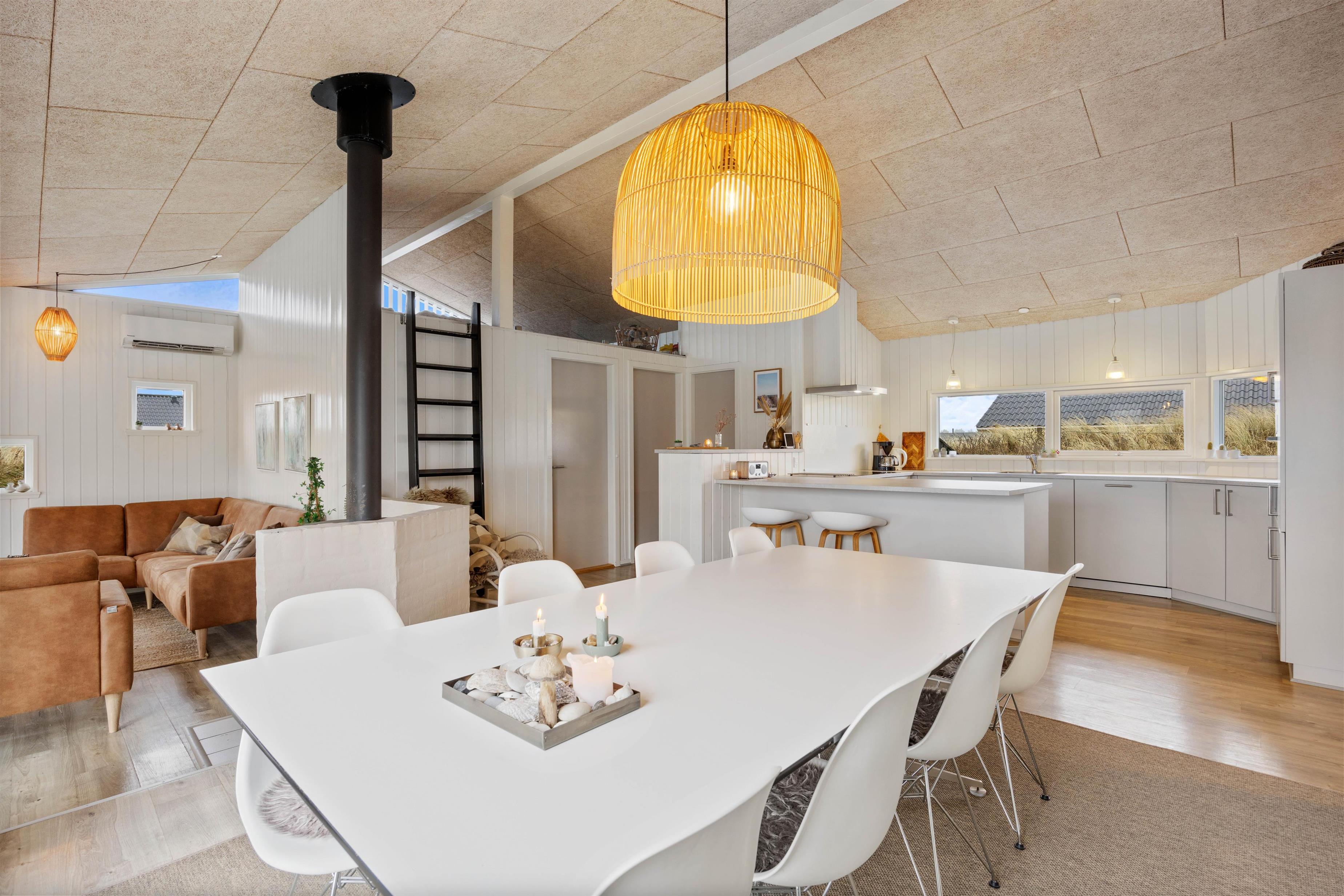 Den lyse, moderne stue med de store vinduer og den lækre indretning lægger op til masser af hygge foran fjernsynet eller med spil og leg imens brændeovnen udståler varme og forstærker den gode stemning. Køkkenet er topmoderne og godt indrettet med alle faciliteter til at gøre køkkentjansen i ferien sjov og nem.