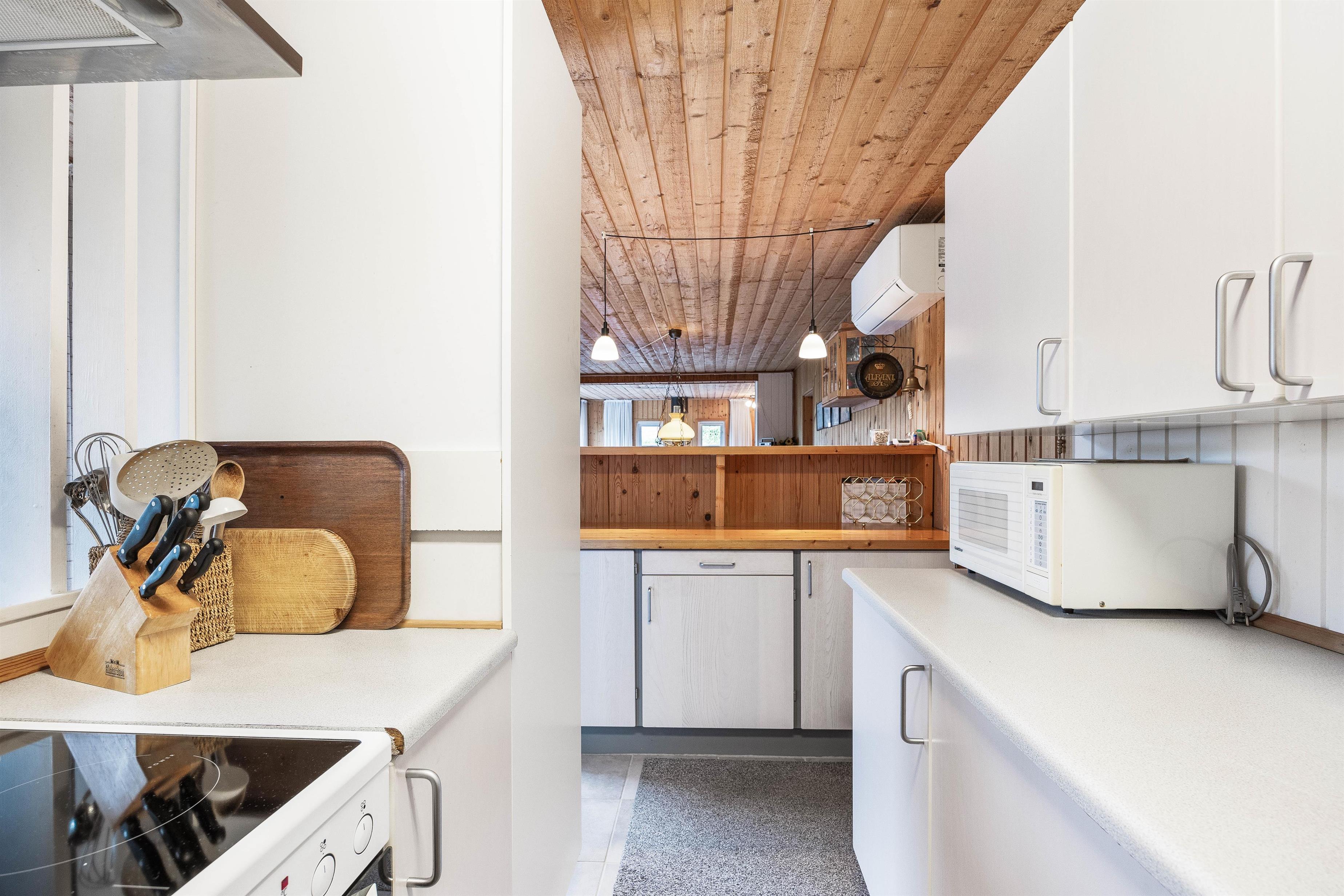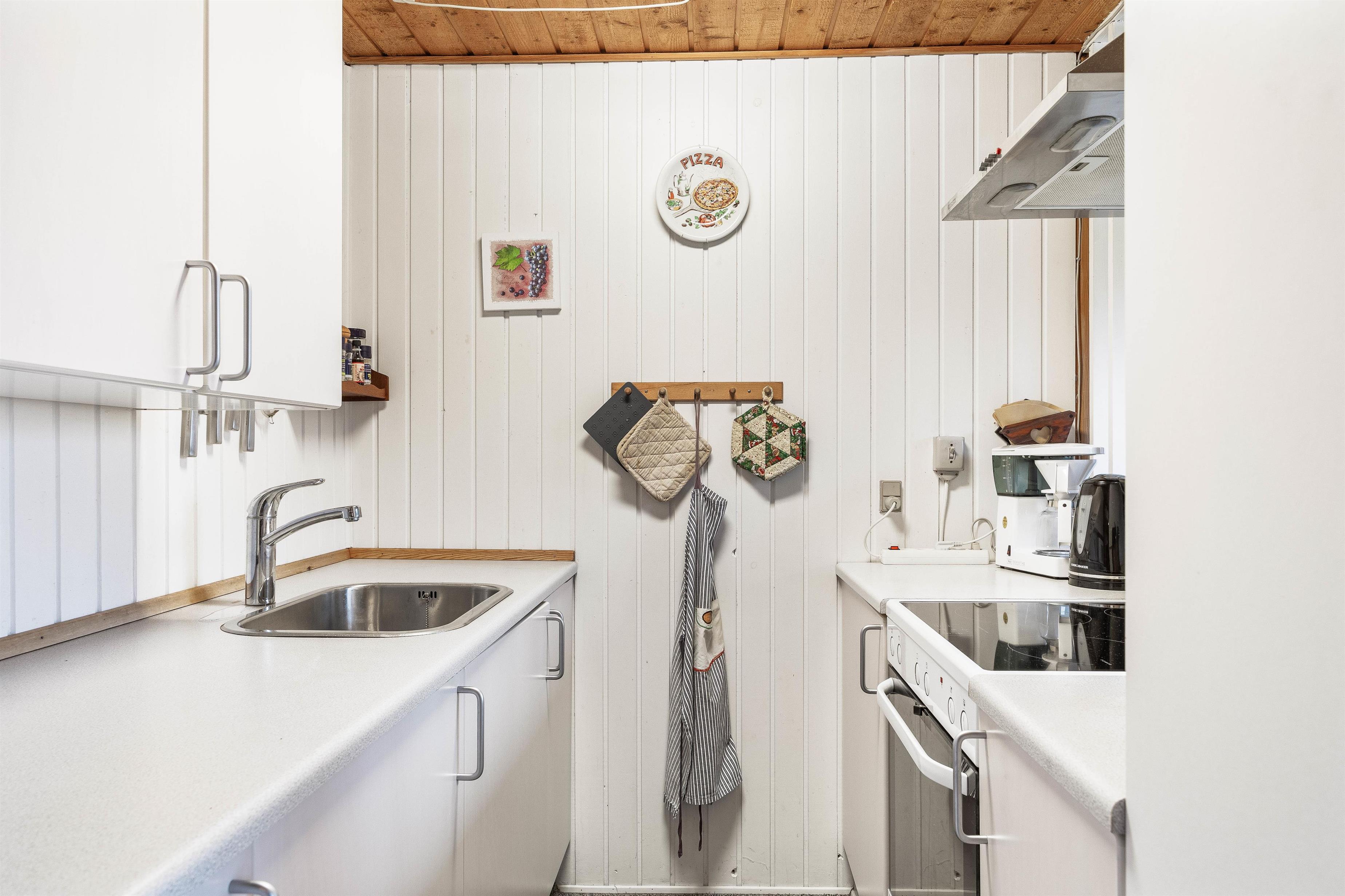 Sommerhusets alrum er enkelt indrettet med komfortable møbler, der indbyder til afslapning foran brændeovnen. Find din yndlingsbog frem og slap af, eller lad blikket vandre ud i naturen. Den energibesparende varmepumpe sørger desuden for behagelig temperatur.