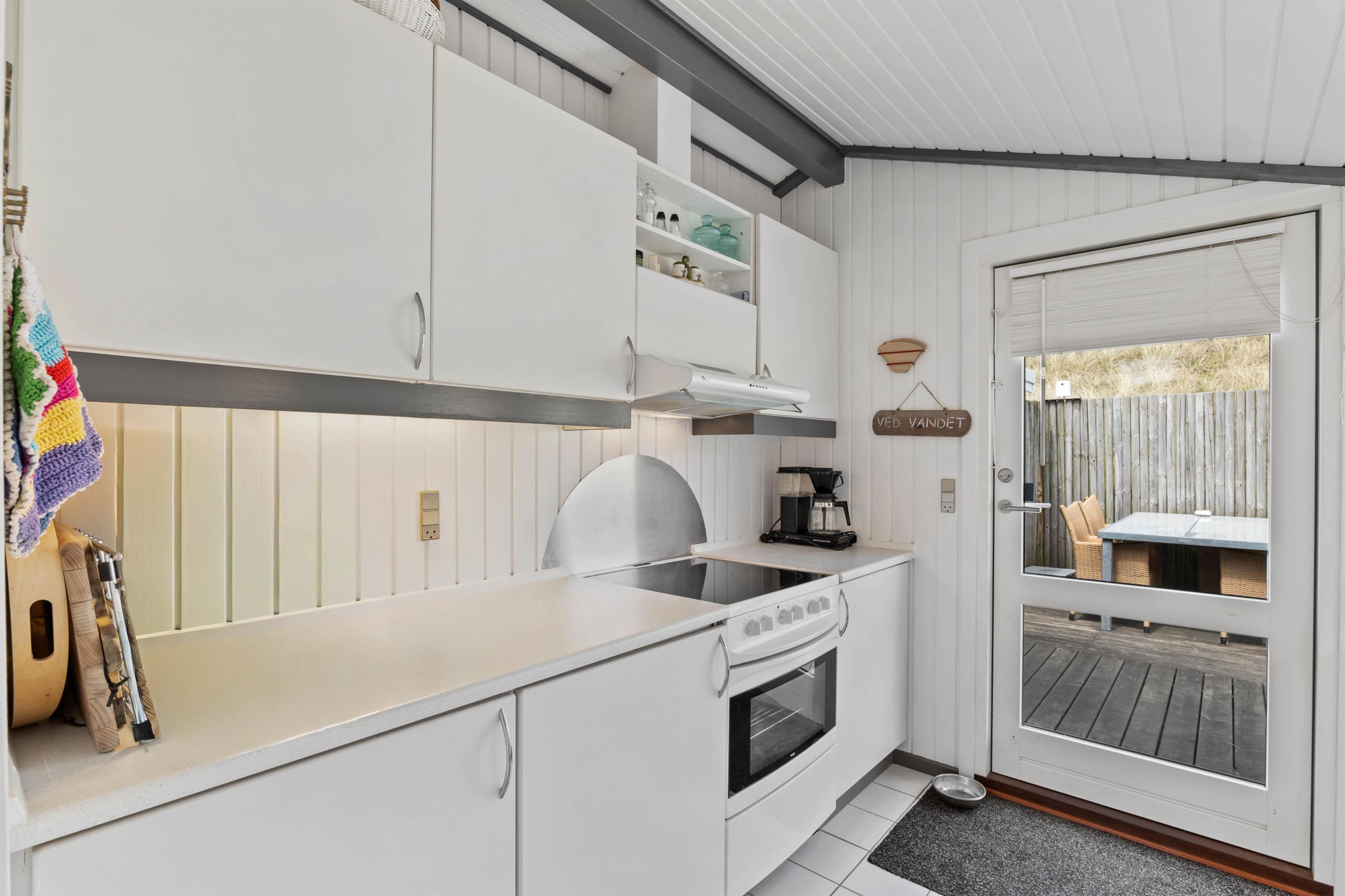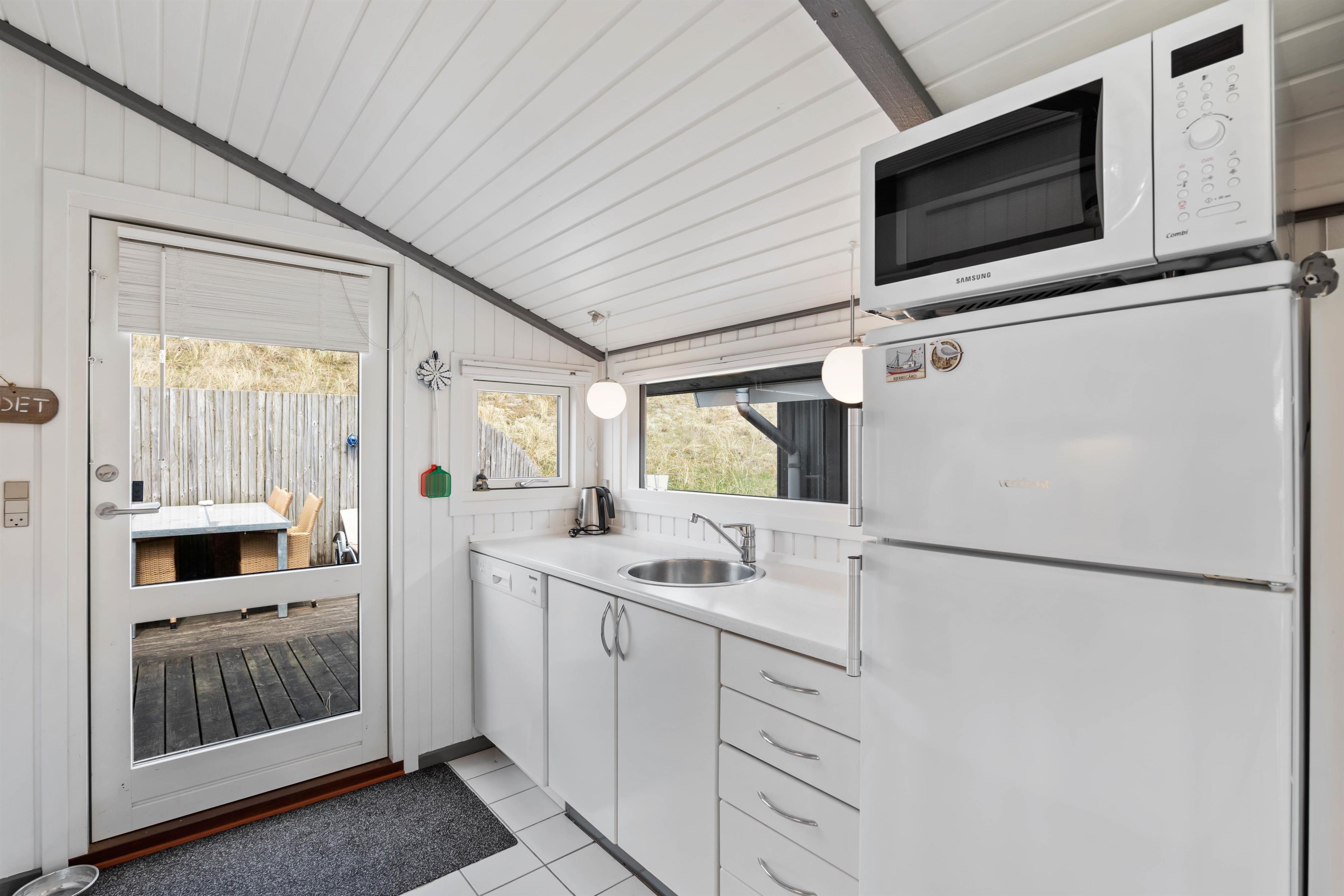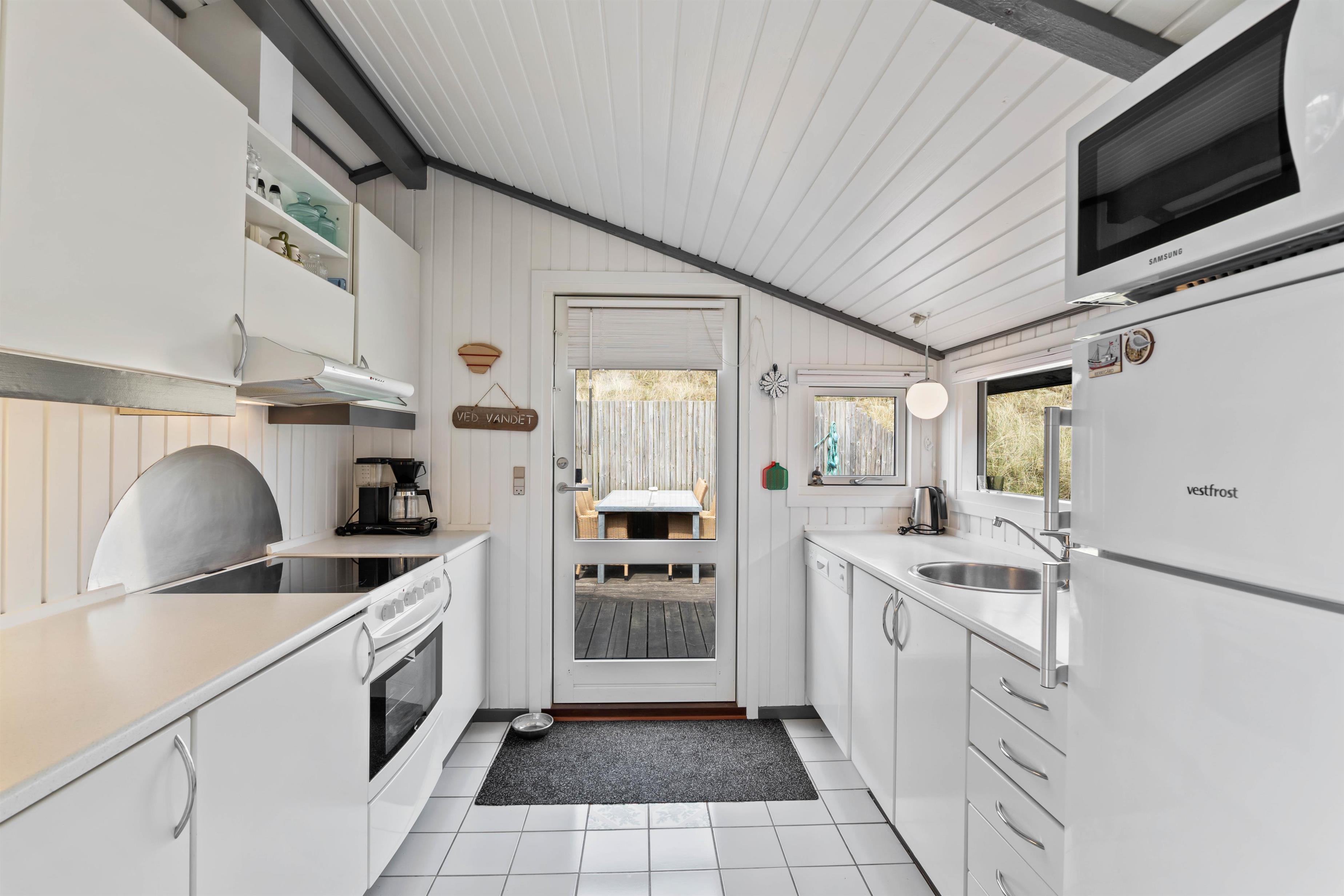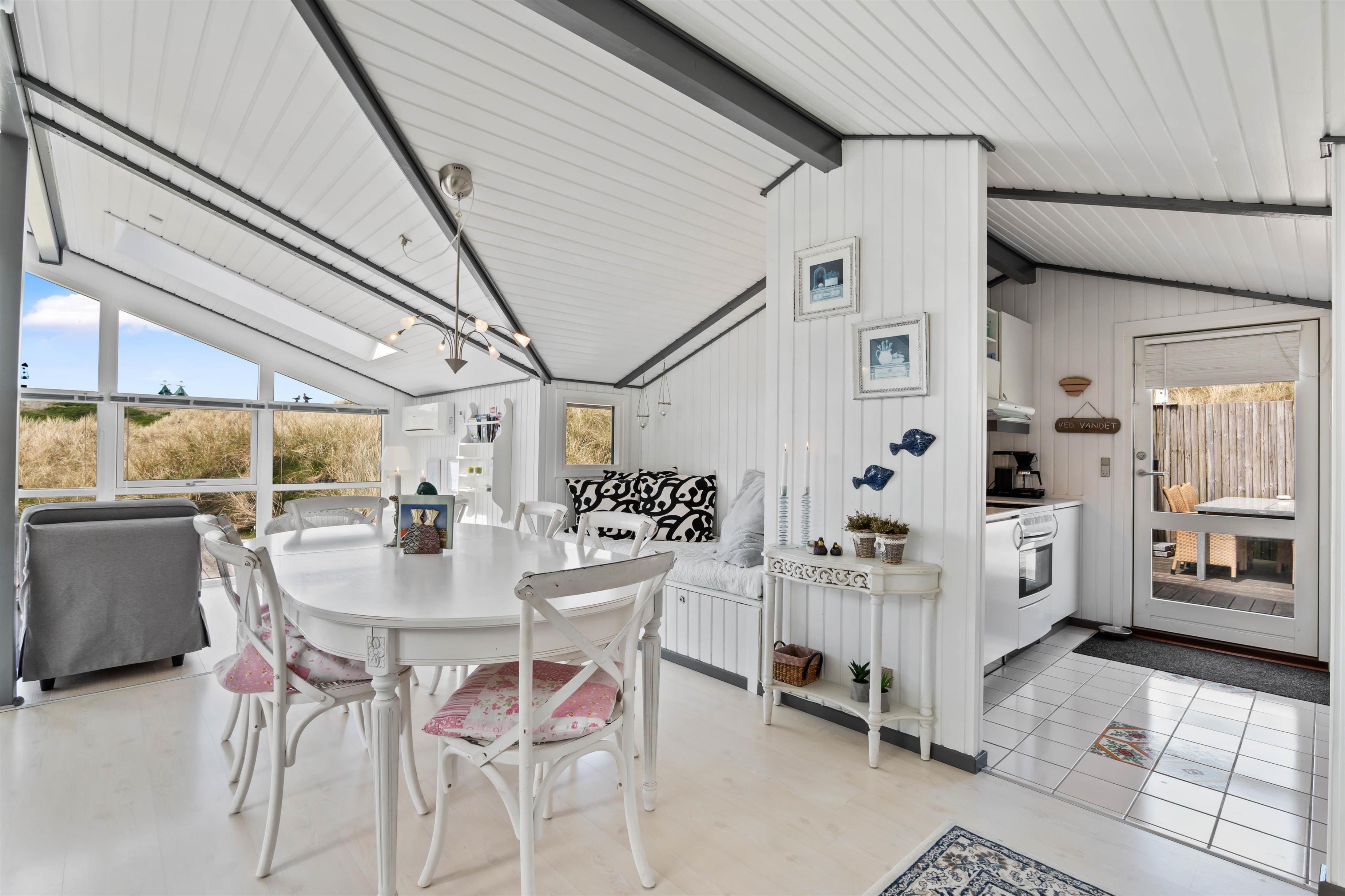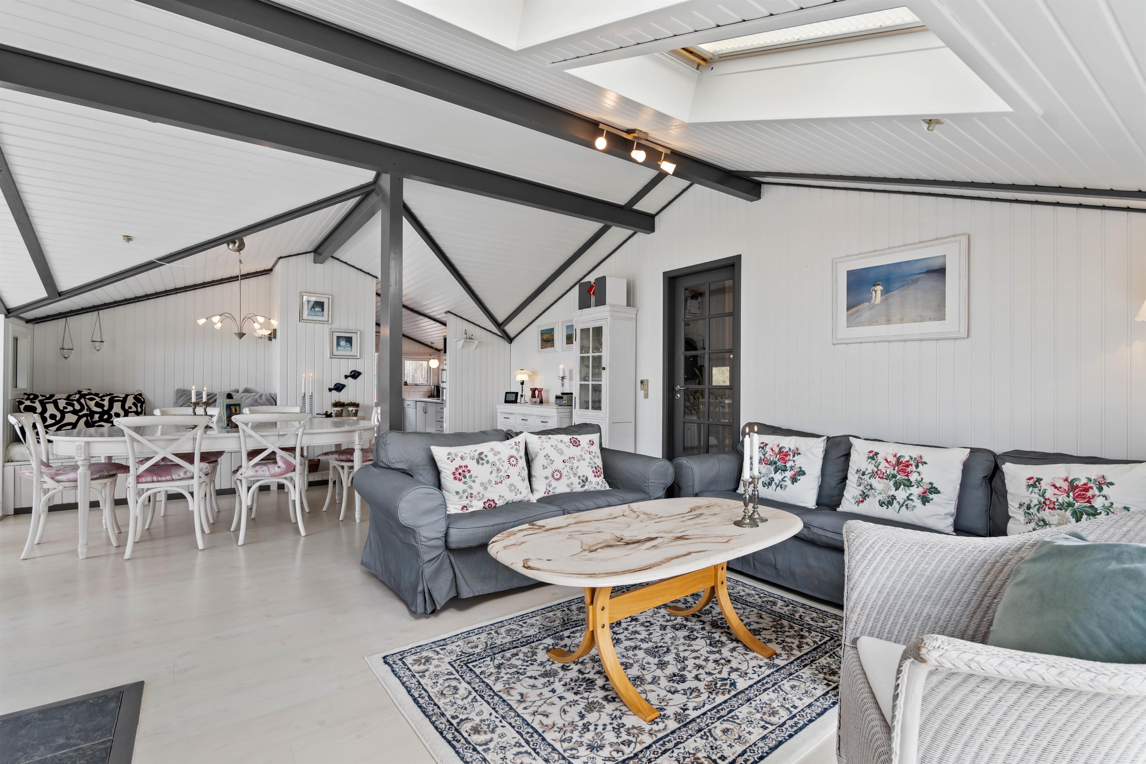 I forbindelse med det åbne og praktisk indrettede køkken finder du opholdsstuen med spiseplads. Alkoven kan fint benyttes som daybed, eller børnene kan opholde sig der, når de bliver trætte. Praktiske hjælpere som opvaskemaskine, vaskemaskine og tørretumbler gør hverdagens gøremål lettere i sommerhuset på Julianevej 71, hvilket er med til at give familien kvalitetstid sammen.