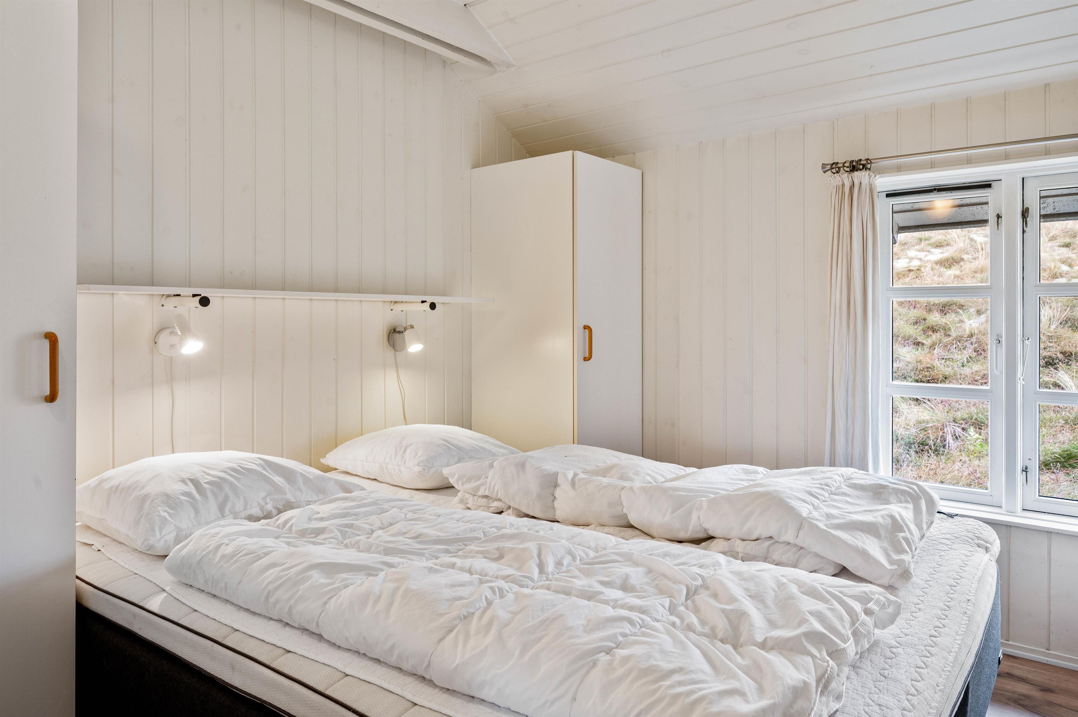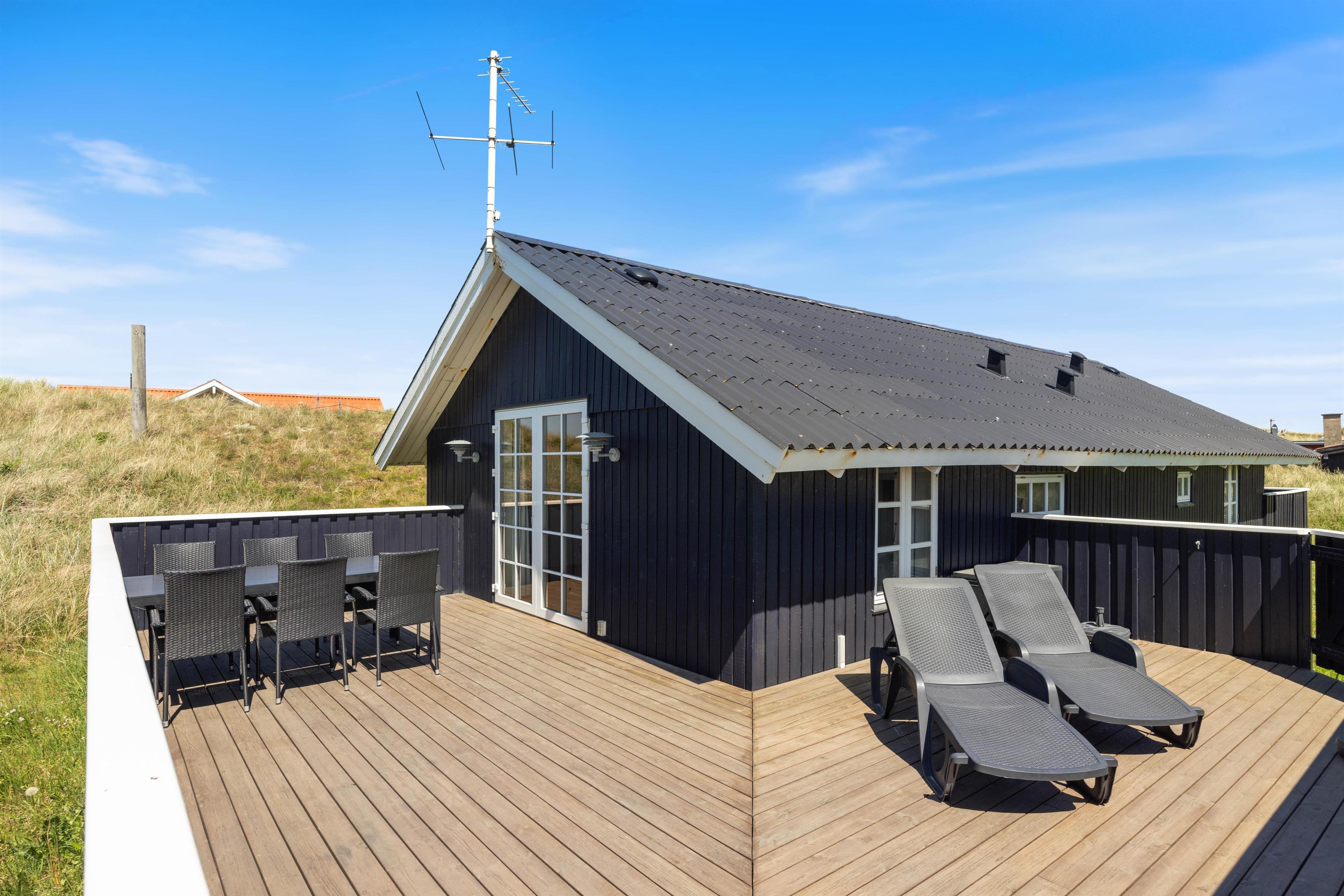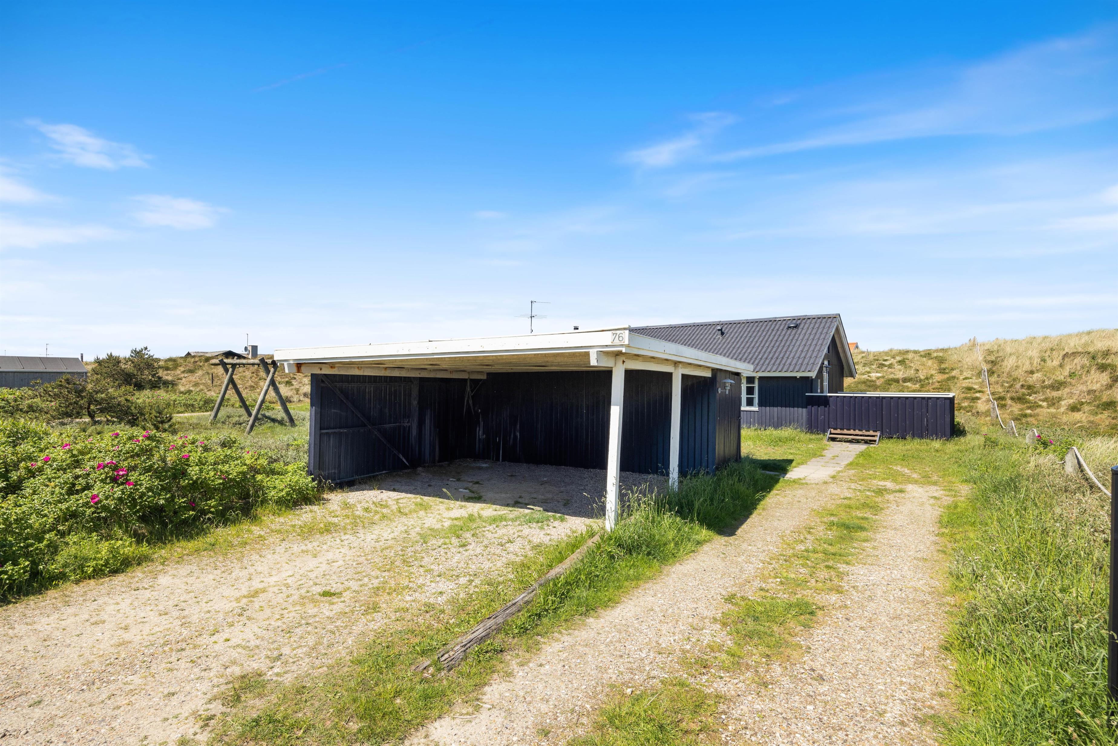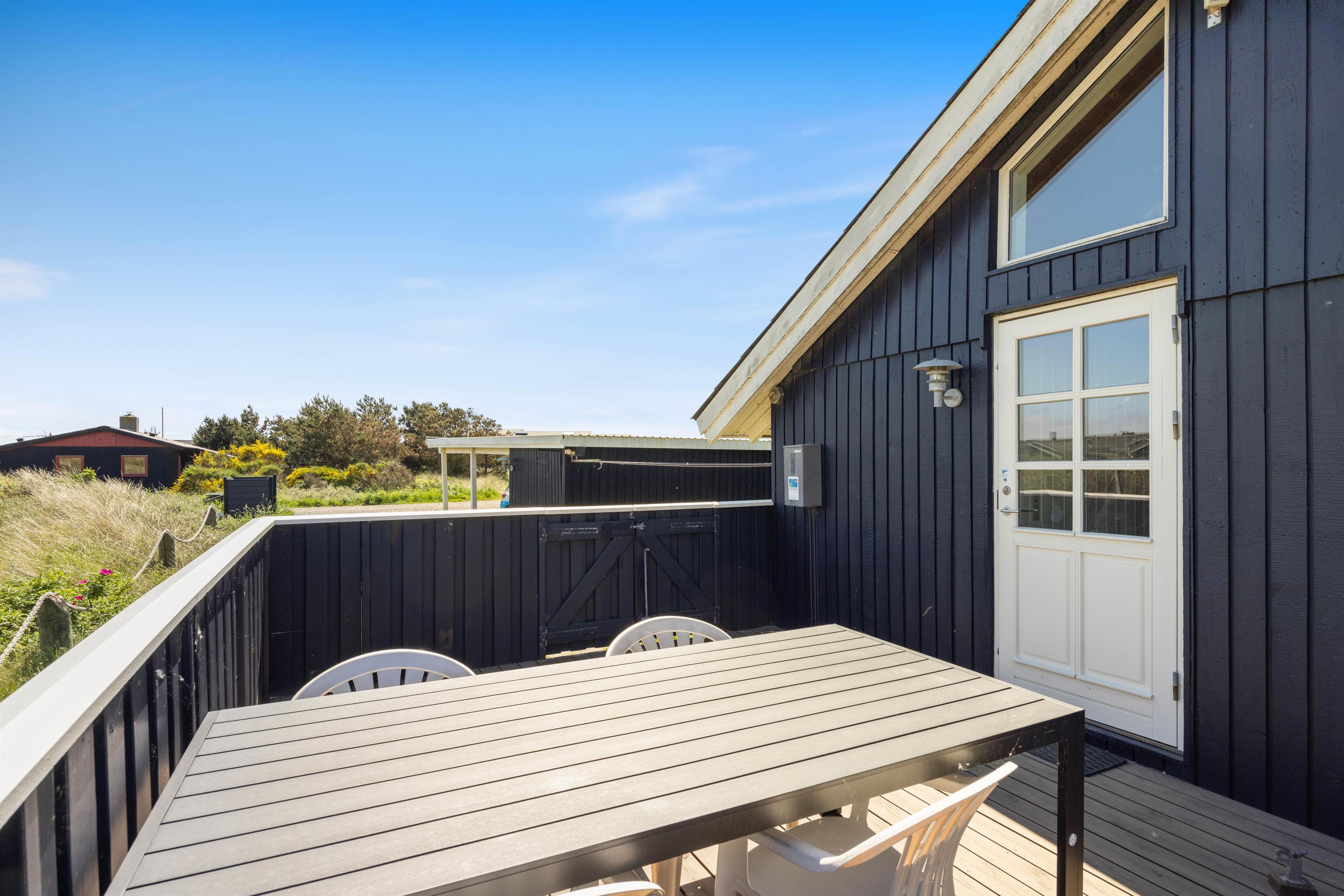 I dette feriehus har man naturen og stranden på nærmeste hold. Huset ligger på en stor kuperet naturgrund med læ fra en stor klit, så den dejlige møblerede og helt lukkede terrasse virkelig kommer til sin ret som afslapningssted på ferien. Her kan altid findes en læfyldt plet til grillaftener og solbadning i den friske salte luft fra Vesterhavet, som ligger i gåafstand kun 450m væk.Den lukkede terrasse gør, at man kan lade hunden løbe frit og lade de små lege for sig selv, mens man kan nyde solens stråler og den smukke natur, som man altid er omgivet af ved Vestkysten. For de mindste er der også et gyngestativ til rådighed, og I kan parkere bilen i husets carport.