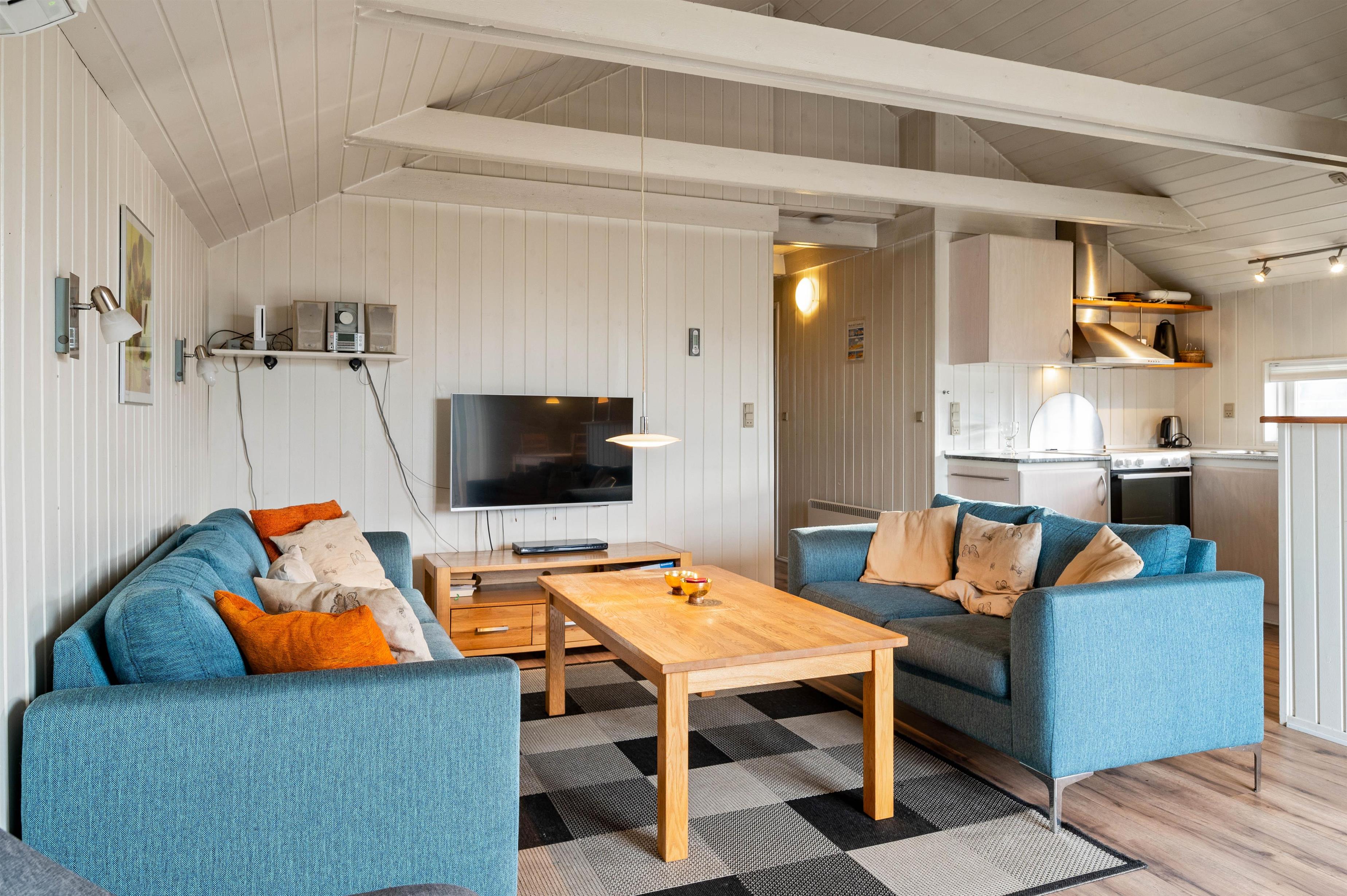 Fra sommerhusets køkken er der direkte forbindelse til spiseafdeling og den virkelig hyggelige opholdsstue med komfortable møbler, en dejlig brændeovn og den energibesparende varmepumpe. Her er et rigtig godt lysindfald og loft til kip med fritlagte spær, der giver den helt rette rustikke feriehusfornemmelse. Her kan I samles hele familien om spil og filmhygge, mens brændeovnen knitrer i baggrunden - Det er da ægte sommerhusferie.