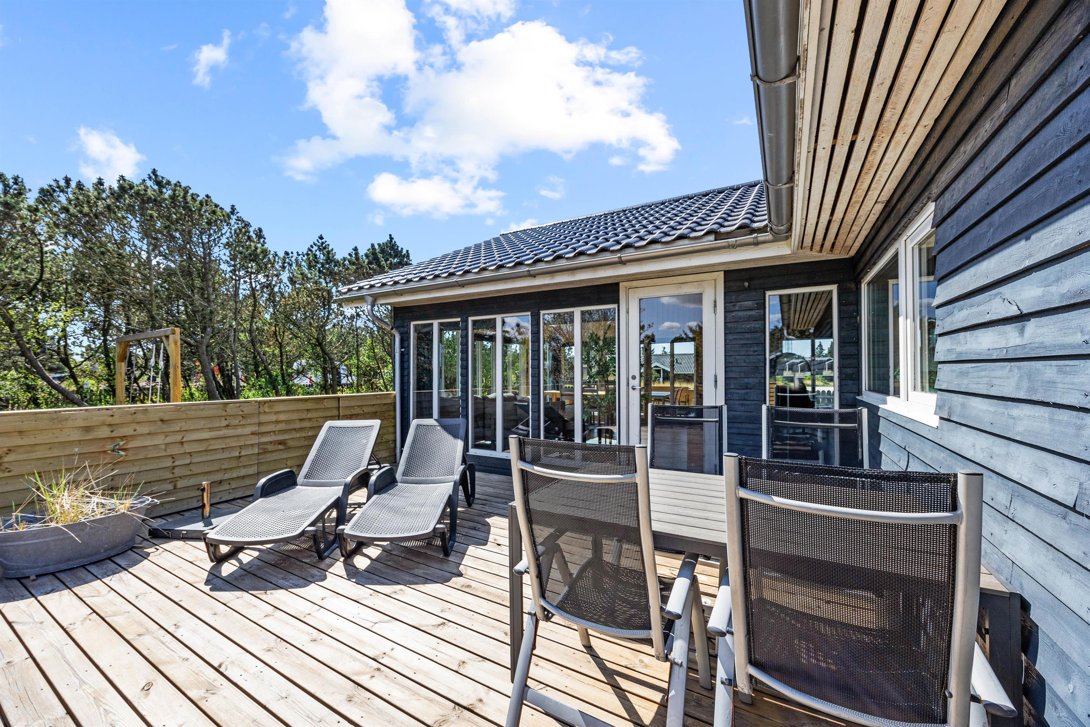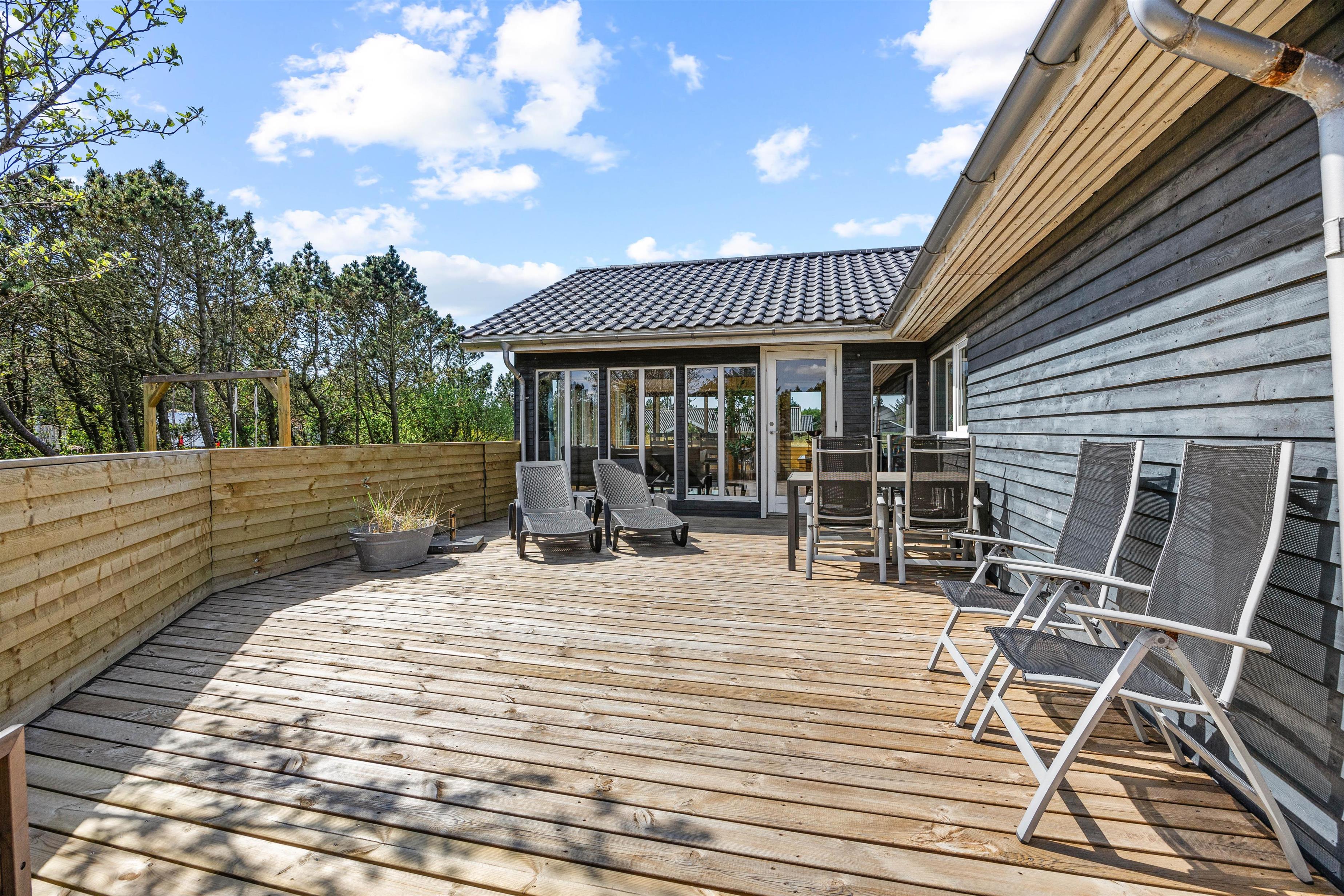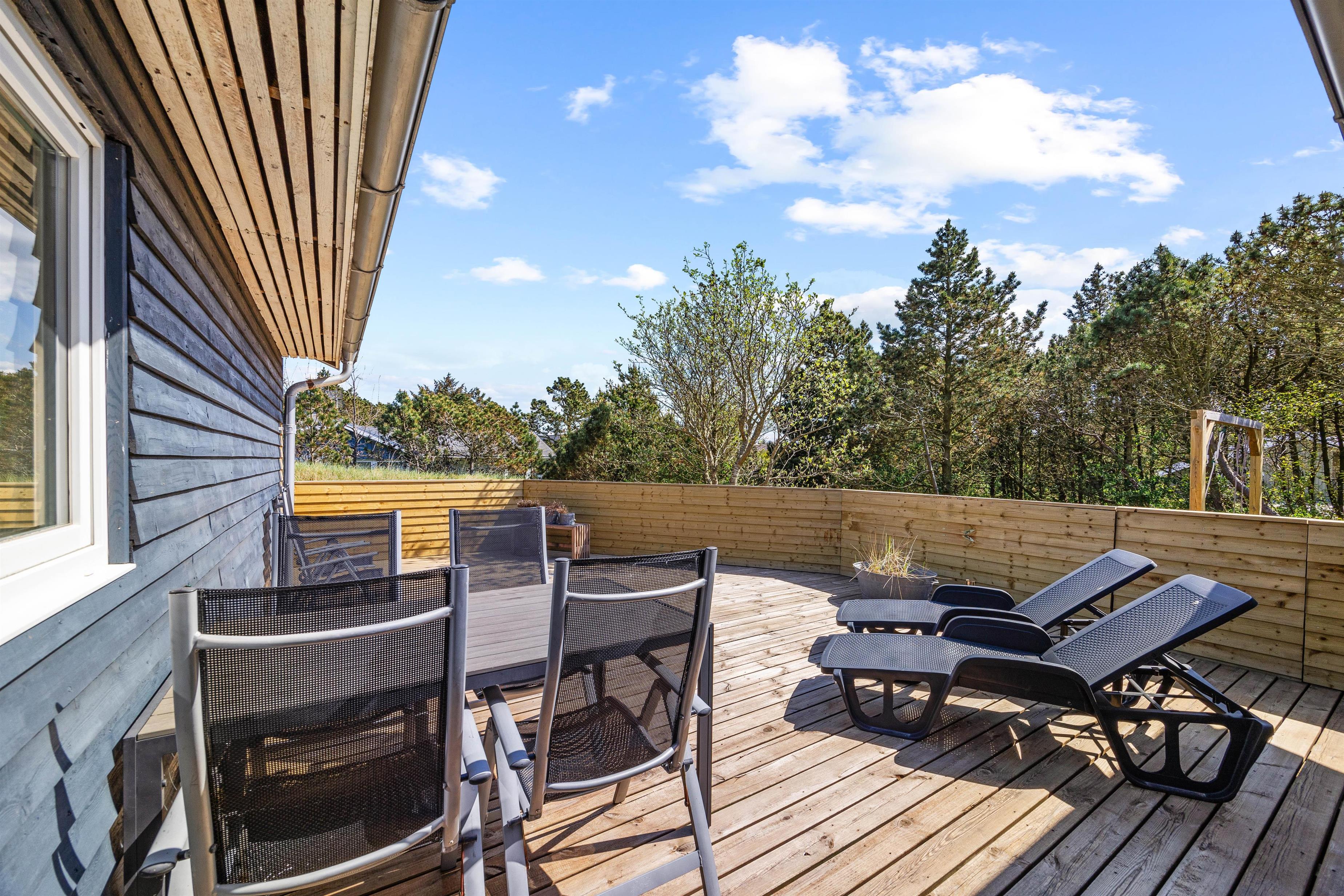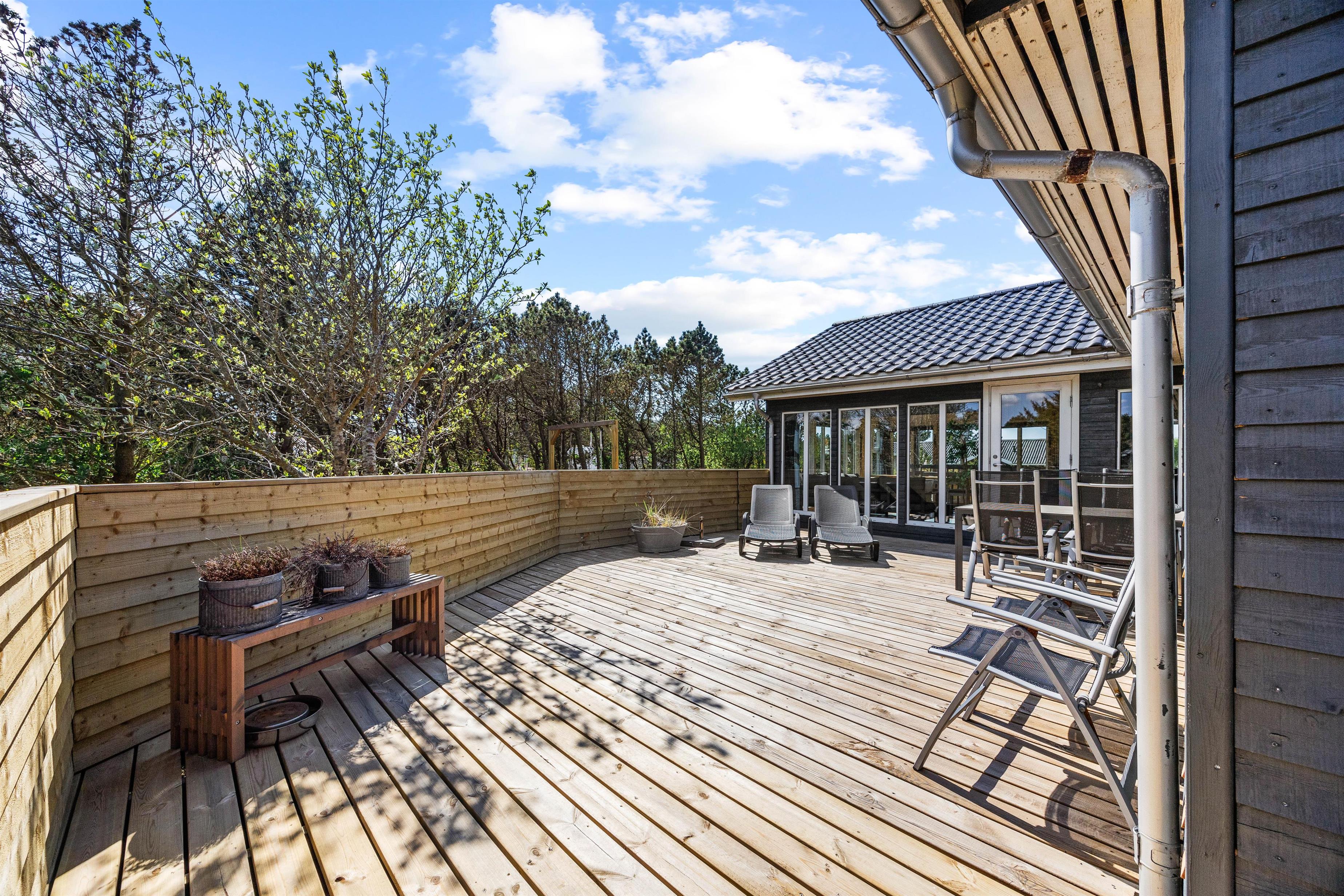 Fra udestuen er der udgang til de lukkede terrasser med mulighed for altid at kunne finde læ. Vestterrassen er delvist overdækket, den øst og sydøst-vendte er noget større og strækker sig på hele sommerhusets bagside. På naturgrunden er der gynge og sandkasse. Den rummelige garage er til disposition.