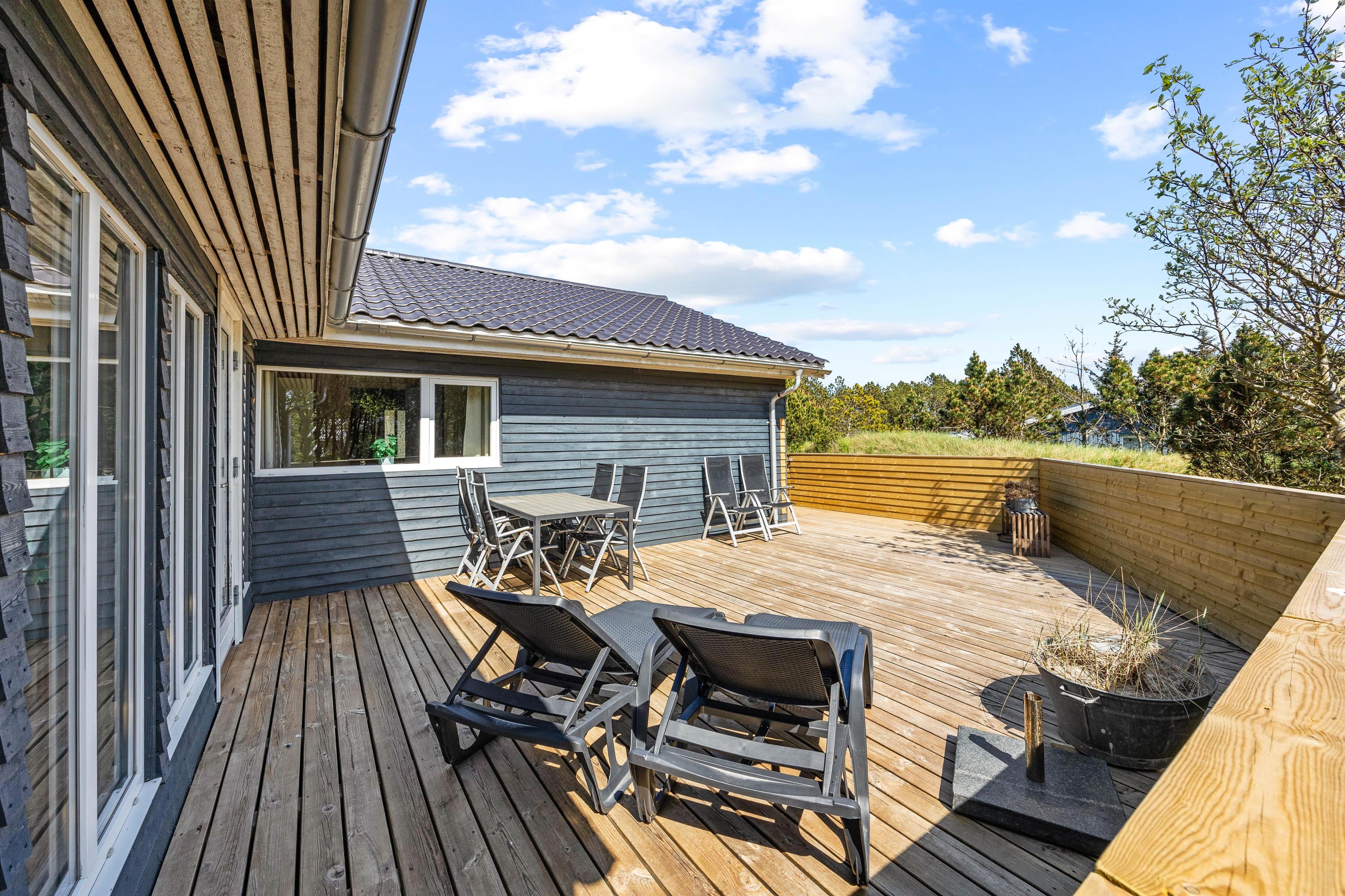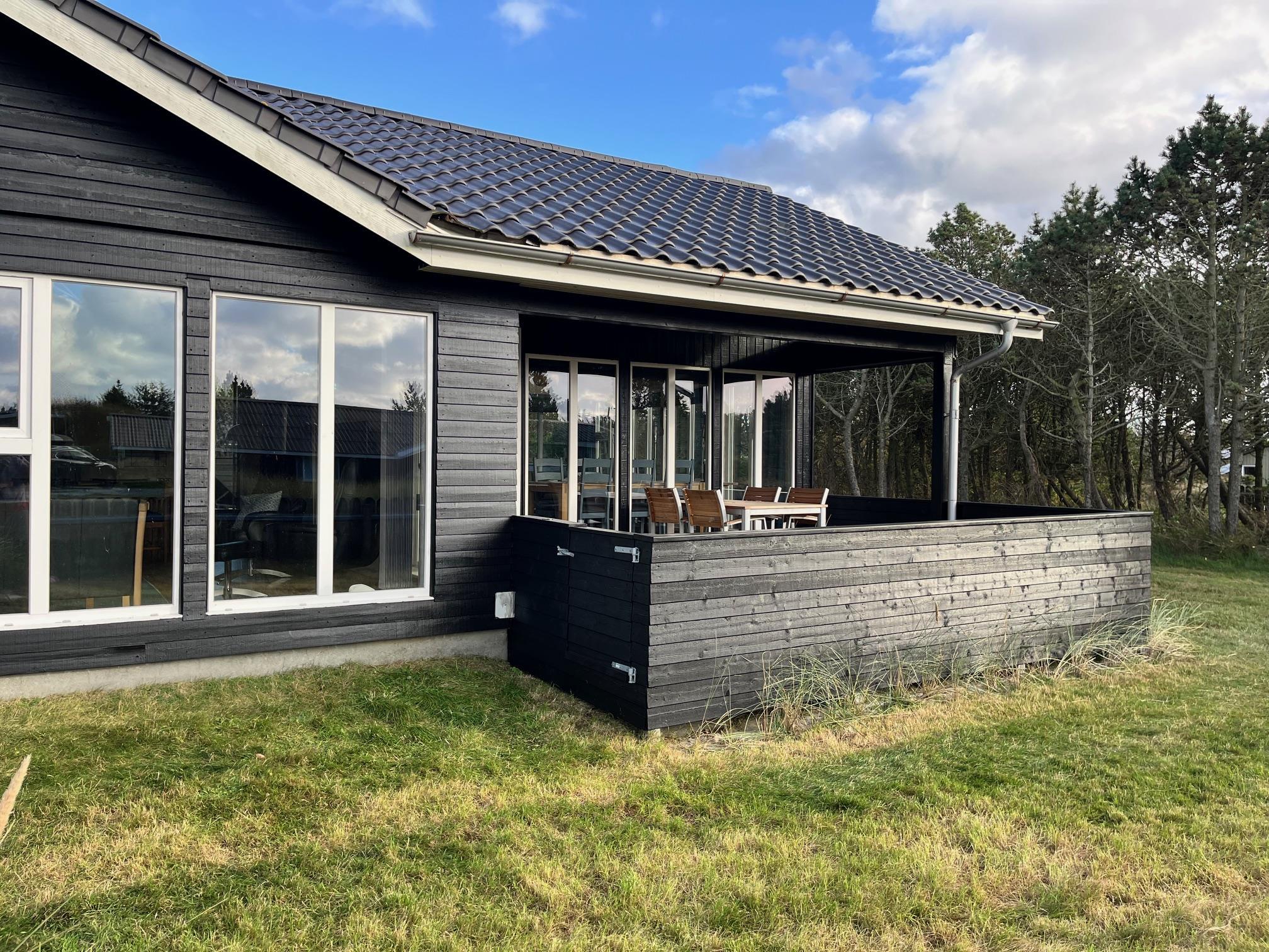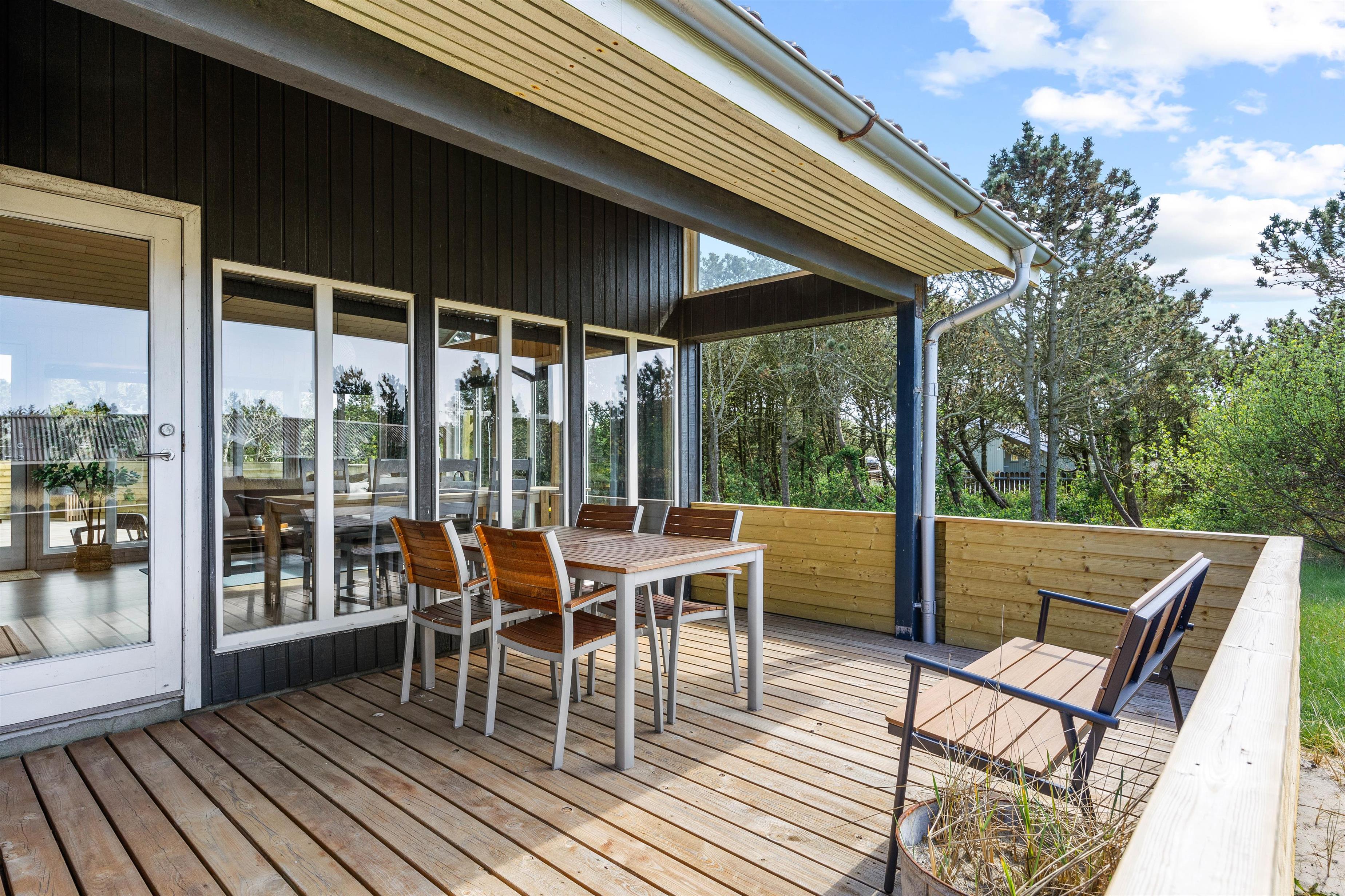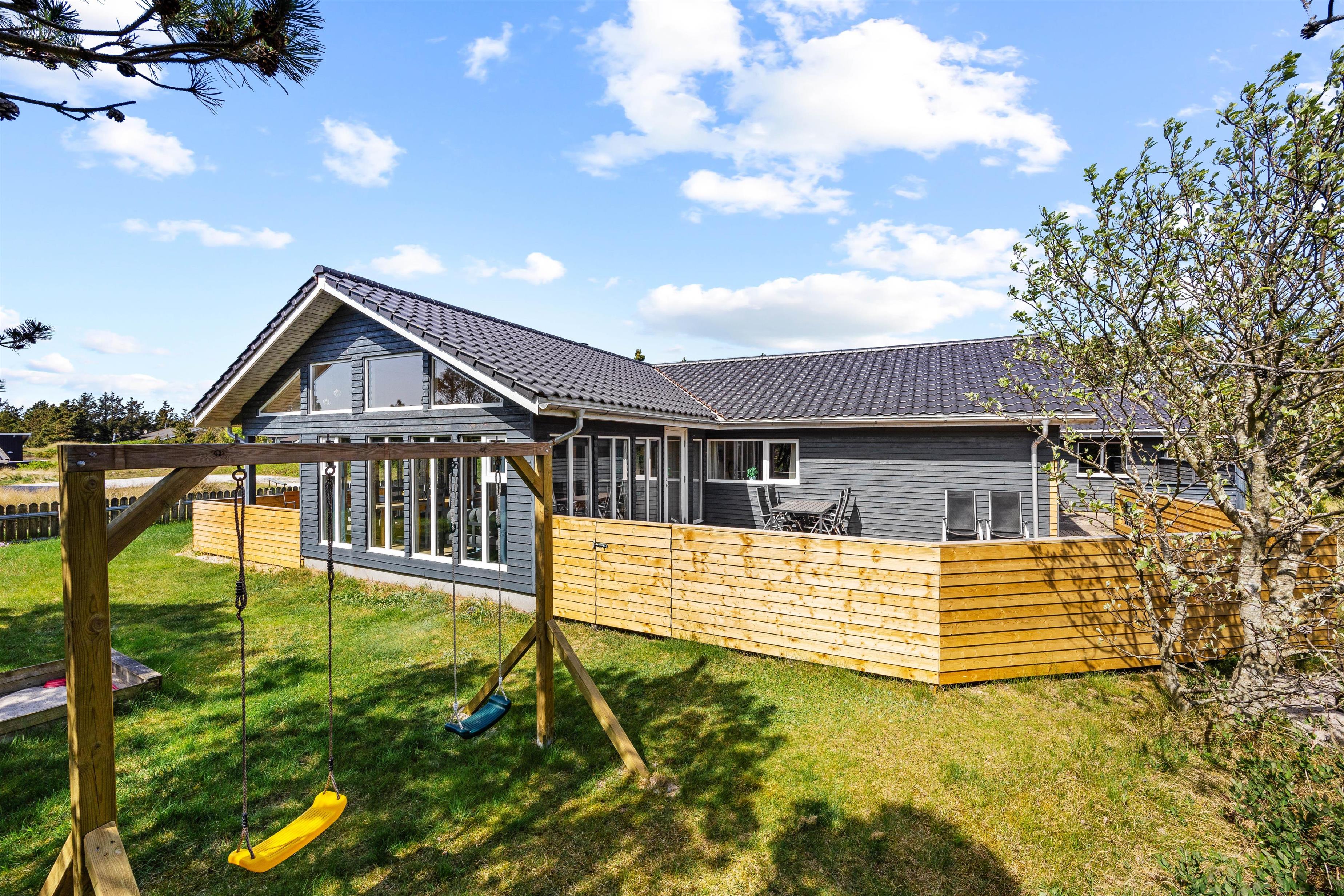 Fra udestuen er der udgang til de lukkede terrasser med mulighed for altid at kunne finde læ. Vestterrassen er delvist overdækket, den øst og sydøst-vendte er noget større og strækker sig på hele sommerhusets bagside. På naturgrunden er der gynge og sandkasse. Den rummelige garage er til disposition.
