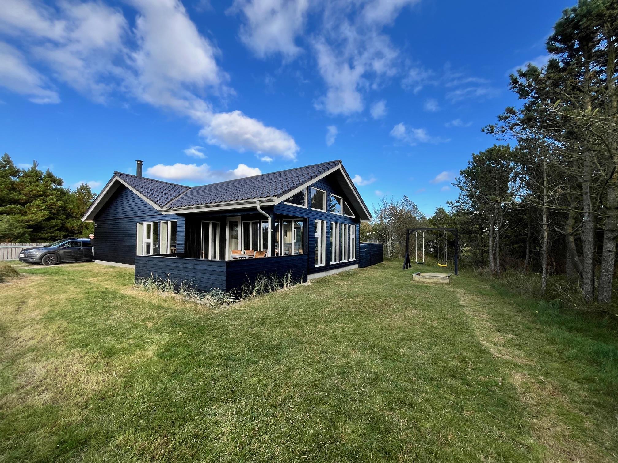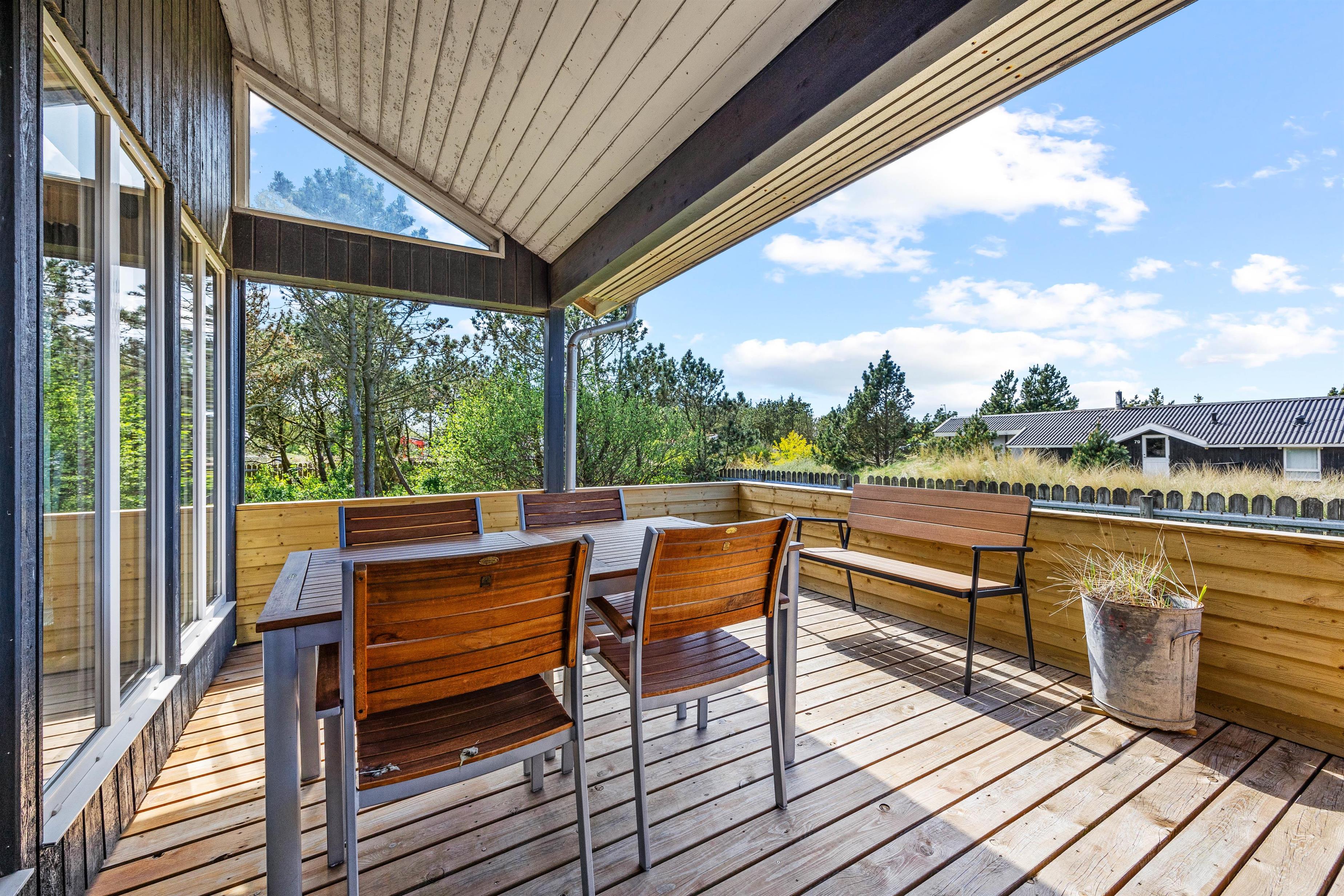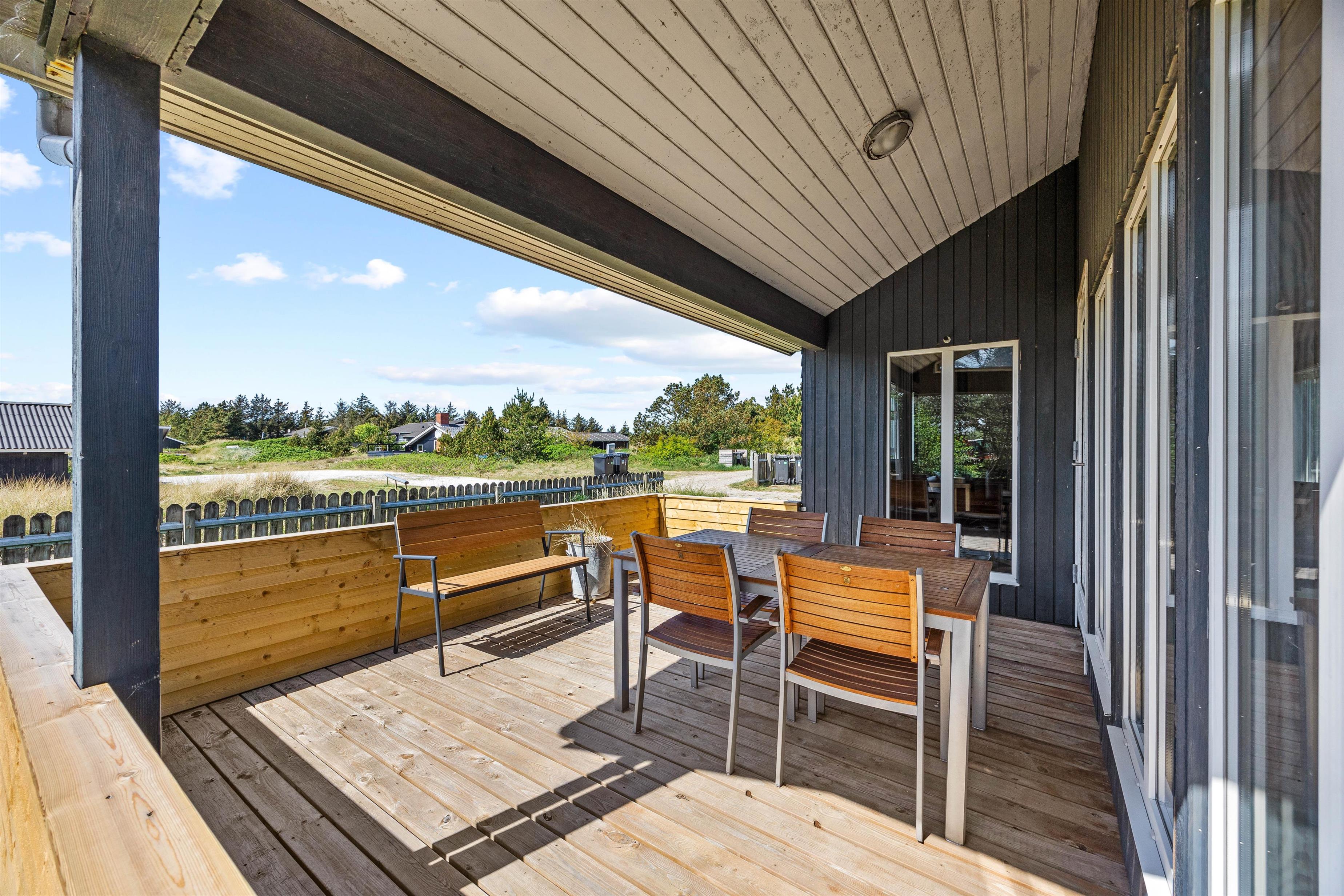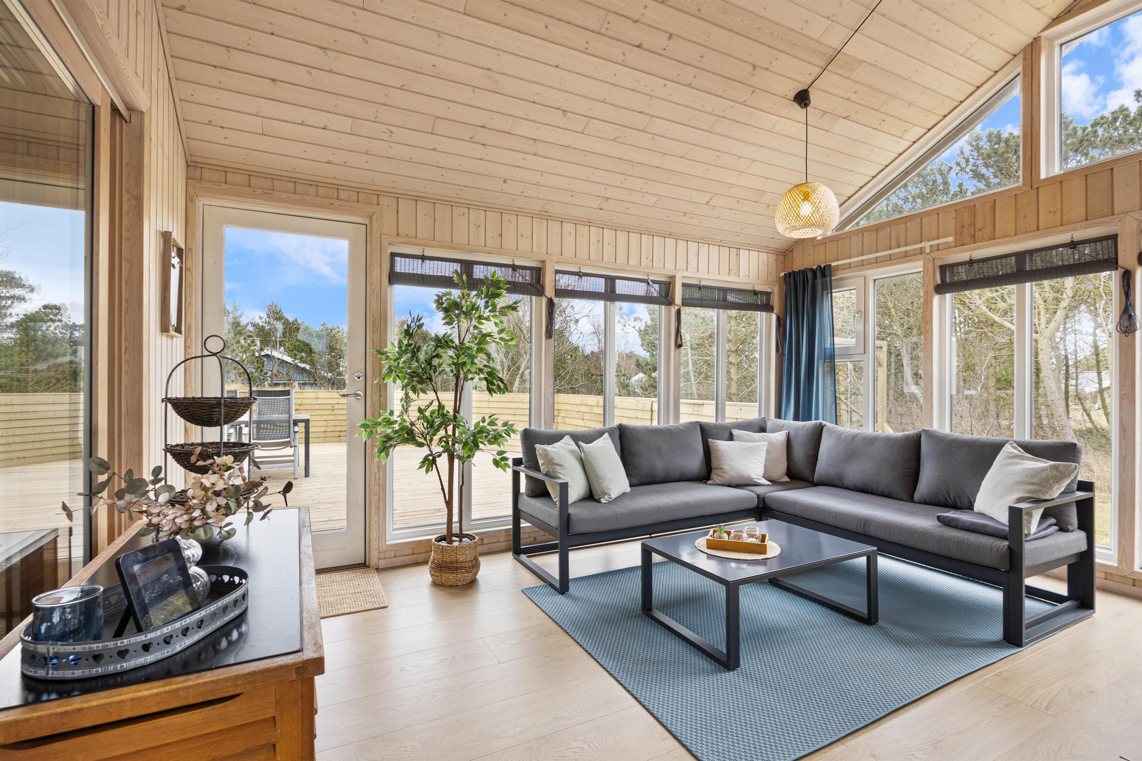 Fra udestuen er der udgang til de lukkede terrasser med mulighed for altid at kunne finde læ. Vestterrassen er delvist overdækket, den øst og sydøst-vendte er noget større og strækker sig på hele sommerhusets bagside. På naturgrunden er der gynge og sandkasse. Den rummelige garage er til disposition.