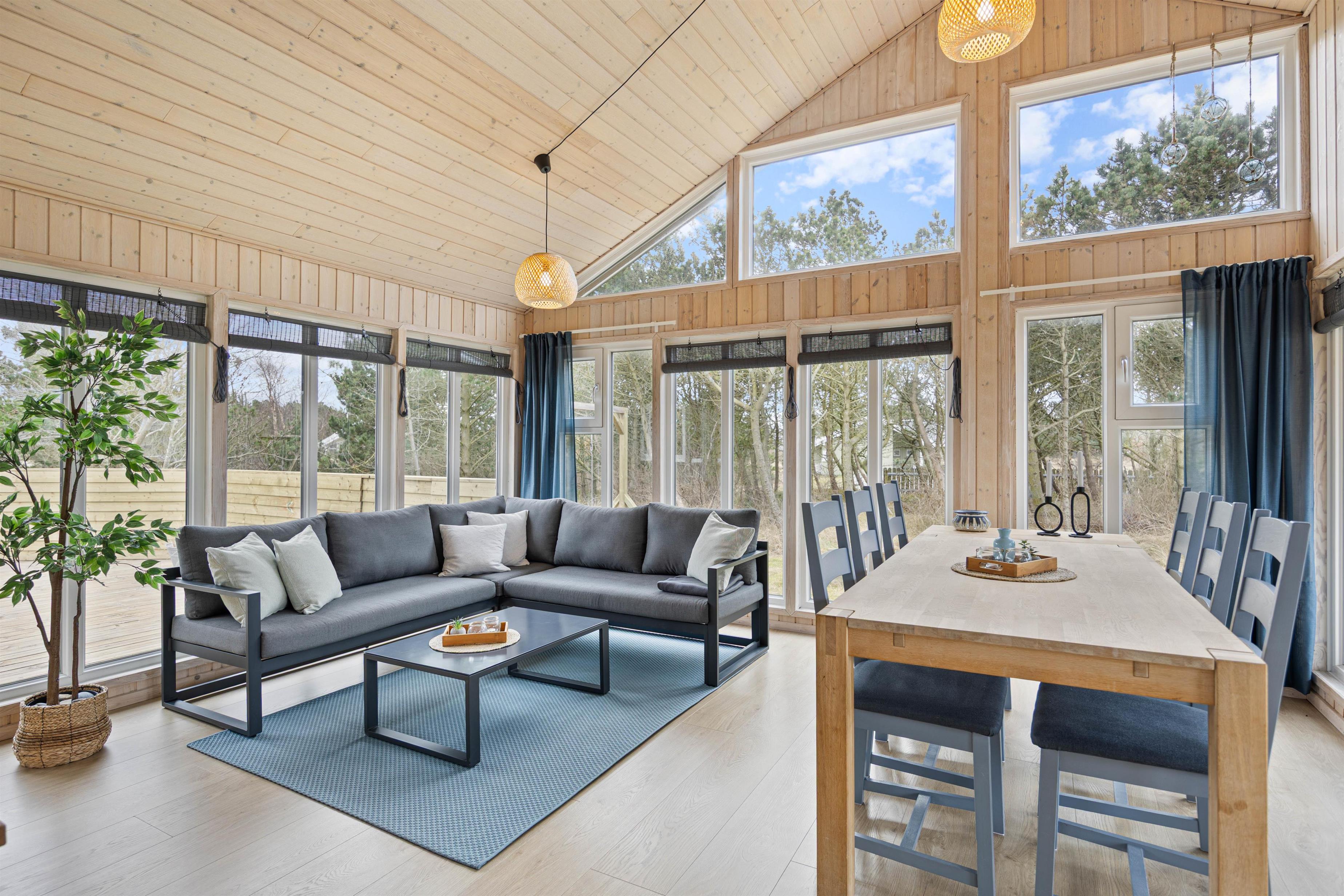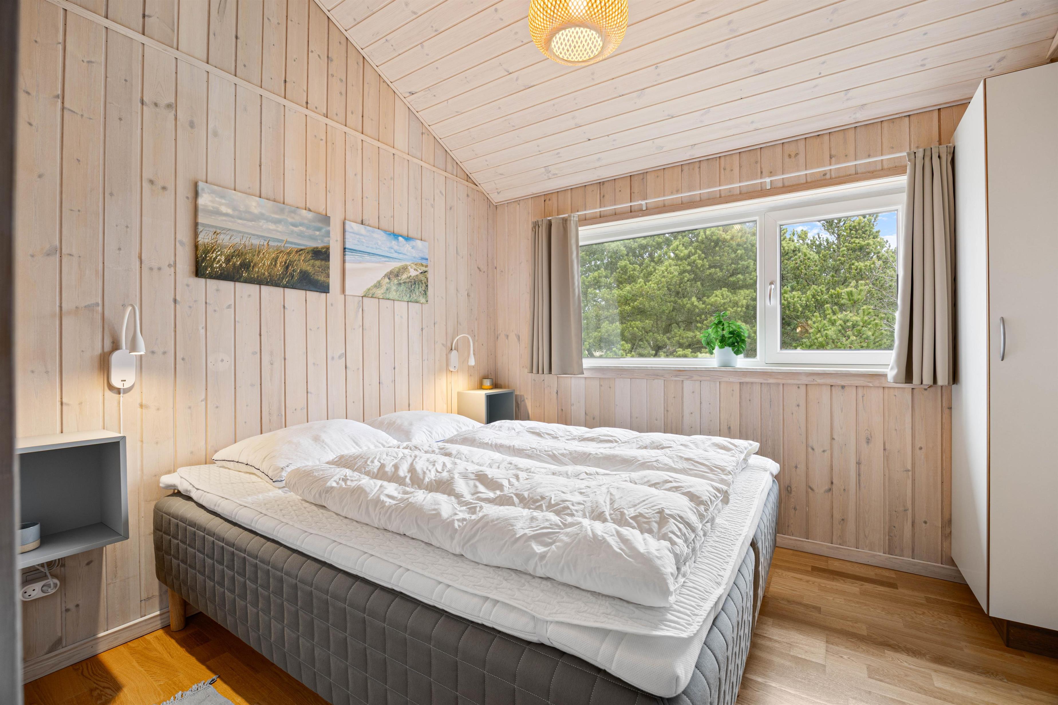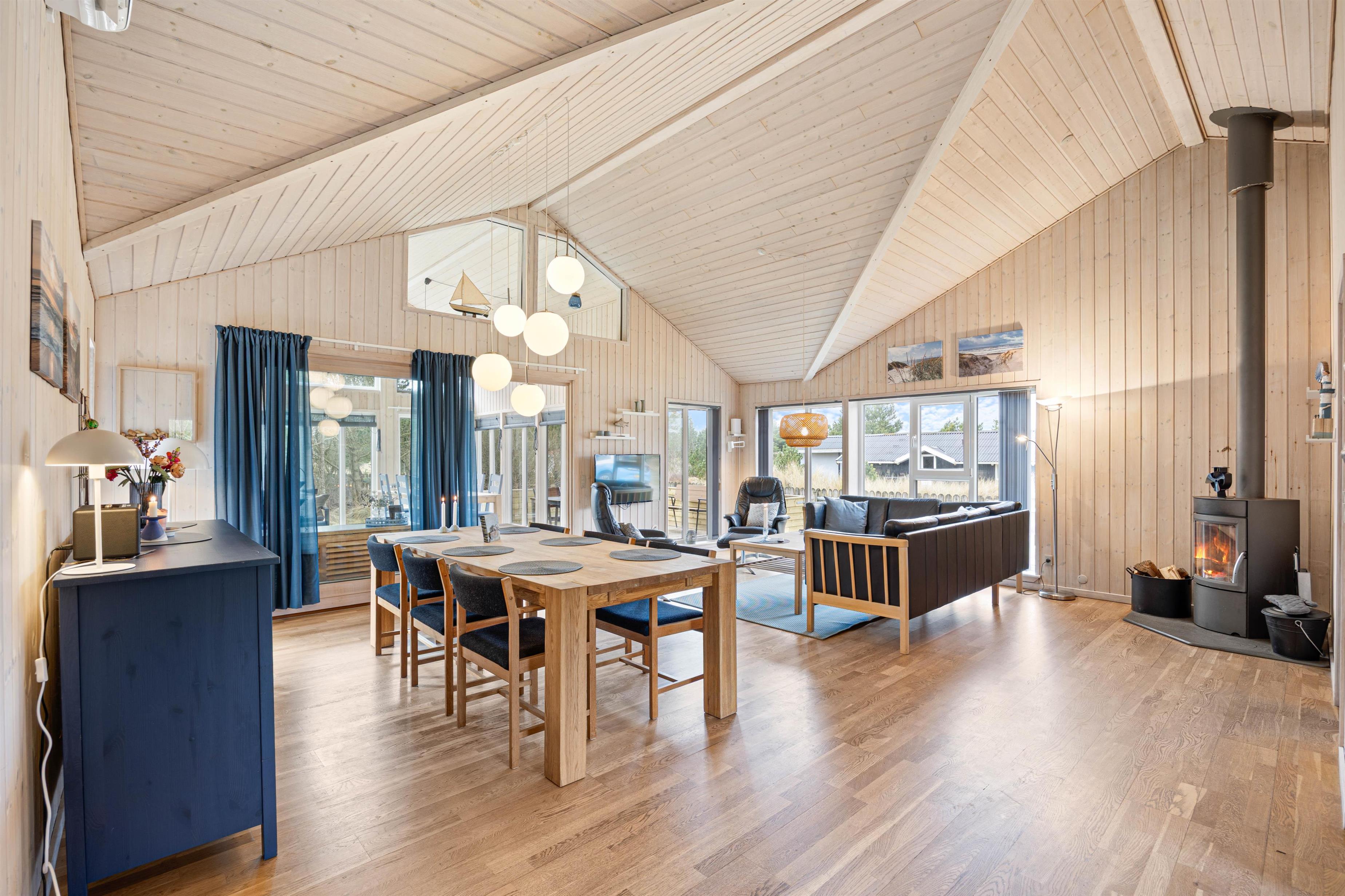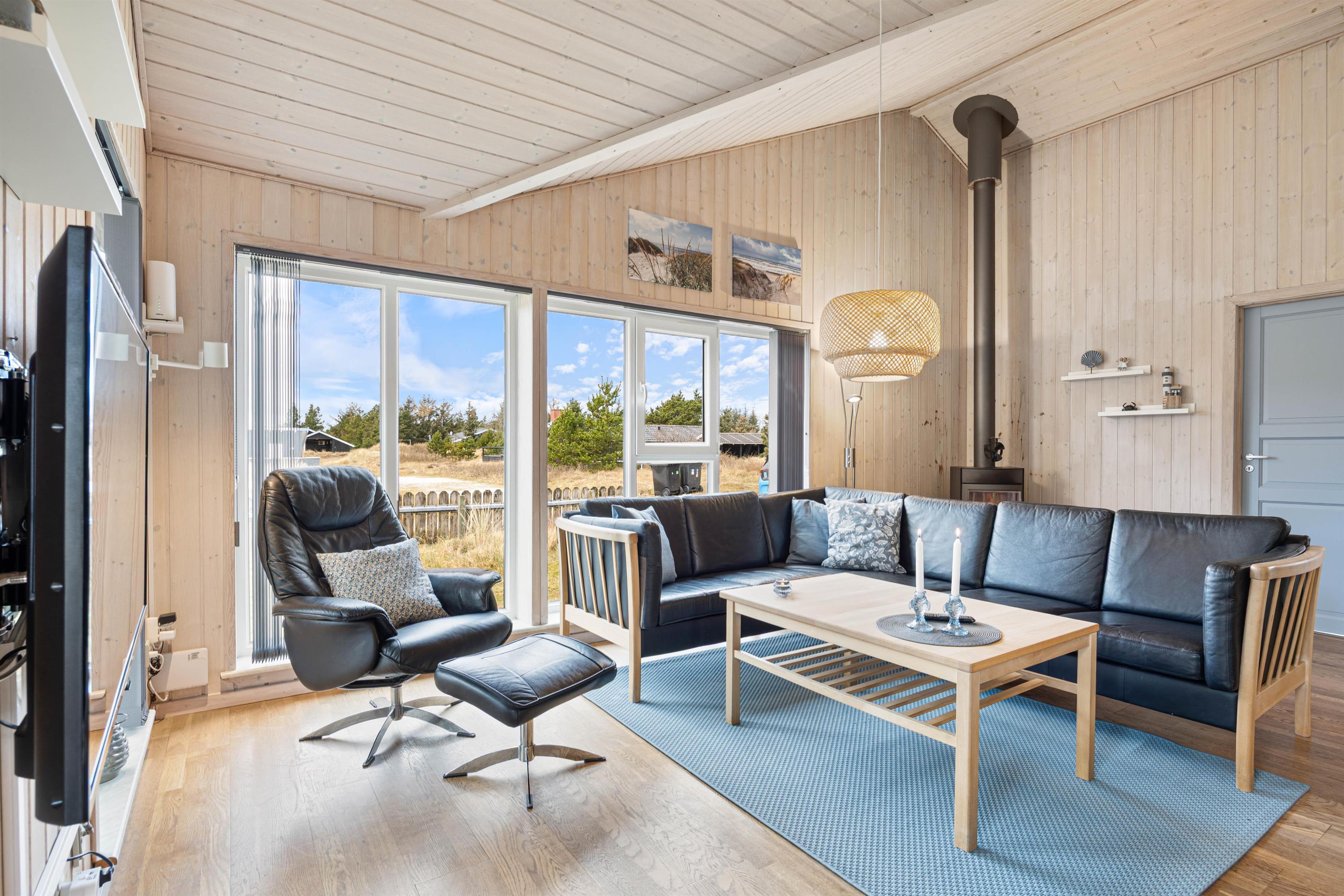 På Bjerregårdsvej 21 venter jer et dejligt sommerhus med plads til 6 gæster. Tag også gerne hundene med - De er velkomne her. Sommerhuset er hyggeligt indrettet med lyse trævægge, komfortable møbler og med højt til loftet, hvilket, sammen med de store vinduer, skaber en luftig fornemmelse og lukker det helt specielle lys ind. En varmepumpe sørger for et behageligt indeklima sammen med den hyggelige brændeovn.