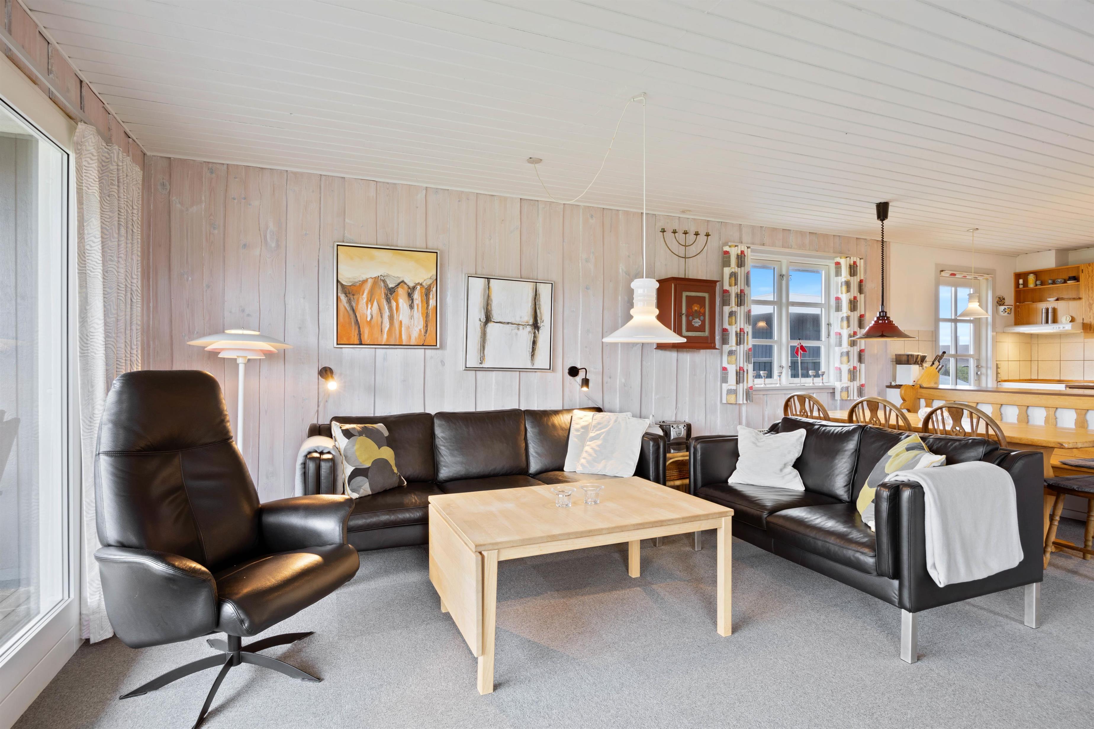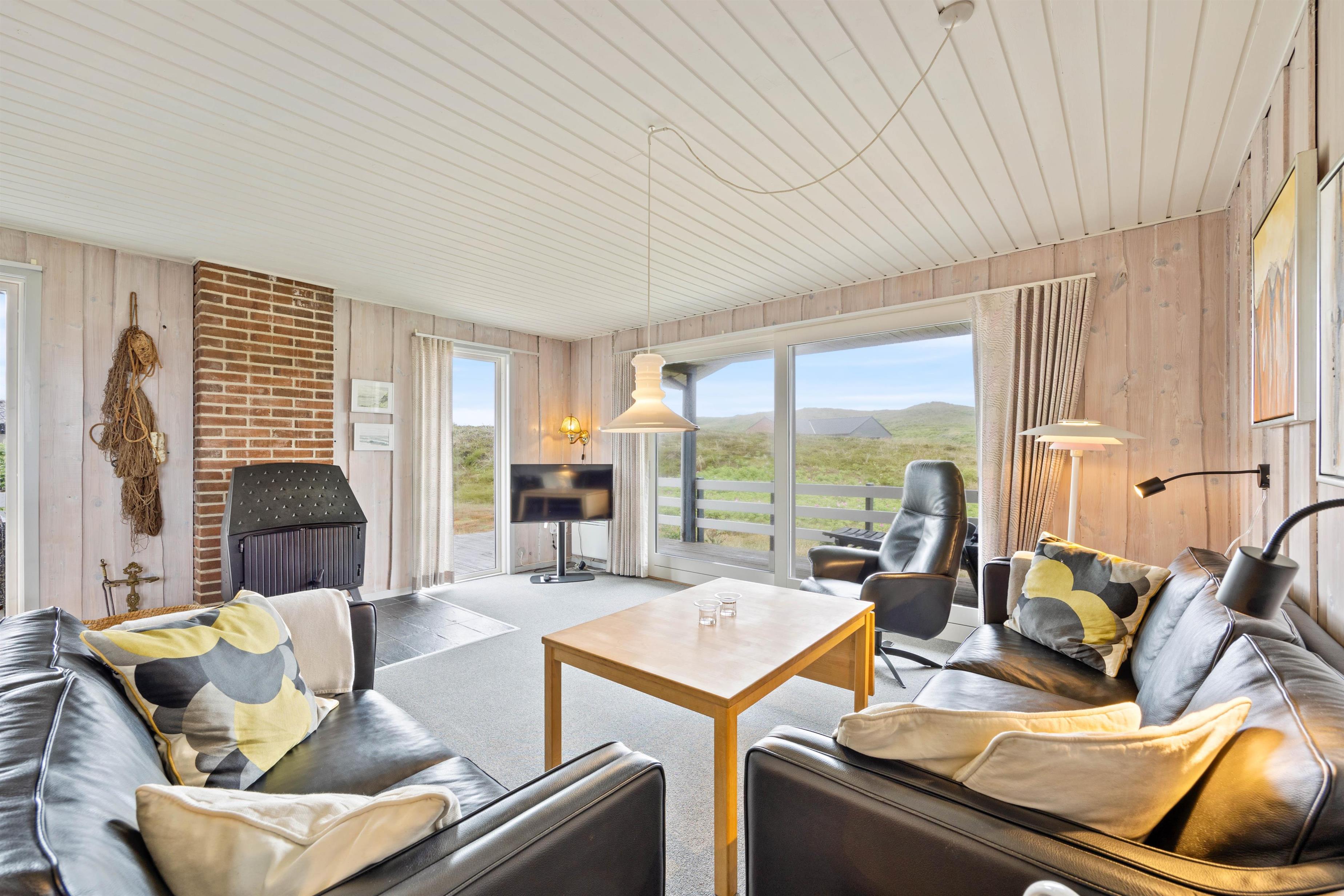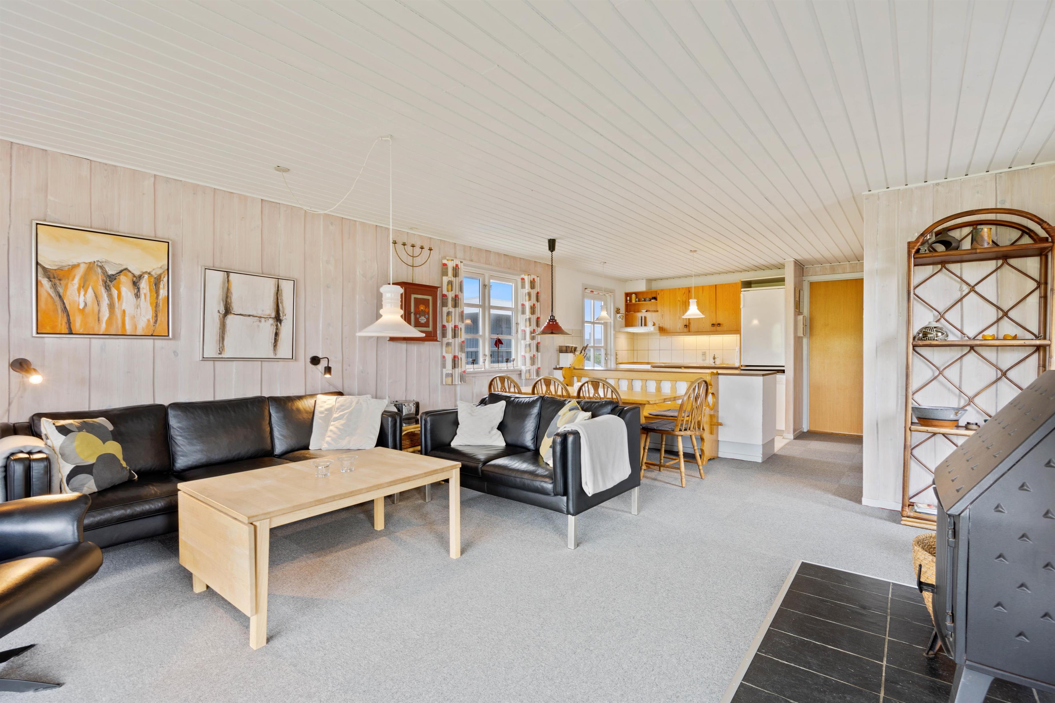 Samlingspunktet bliver uden tvivl alrummet, som forener køkken og stue. Saml jer omkring brætspil eller tag feriekrimien med hen i sofaen - samtidig med at brændeovn knitrer i baggrunden og spreder hygge og varme. Herfra har I desuden også udsigt over det smukke kuperede klitlandskab.