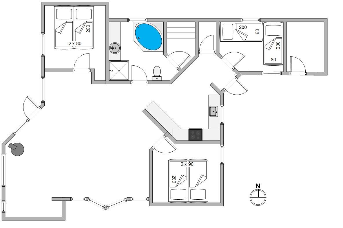 Når timerne bliver sene, kan I kravle til køjs i ét af feriehusets 3 soveværelser. Her venter jer gode og behagelige senge, så I kan få ladet batterierne op til næste dags aktiviteter og solskinstimer. Der er en energibesparende varmepumpe, som hurtigt og effektivt sørger for et behageligt indeklima og en god temperatur.