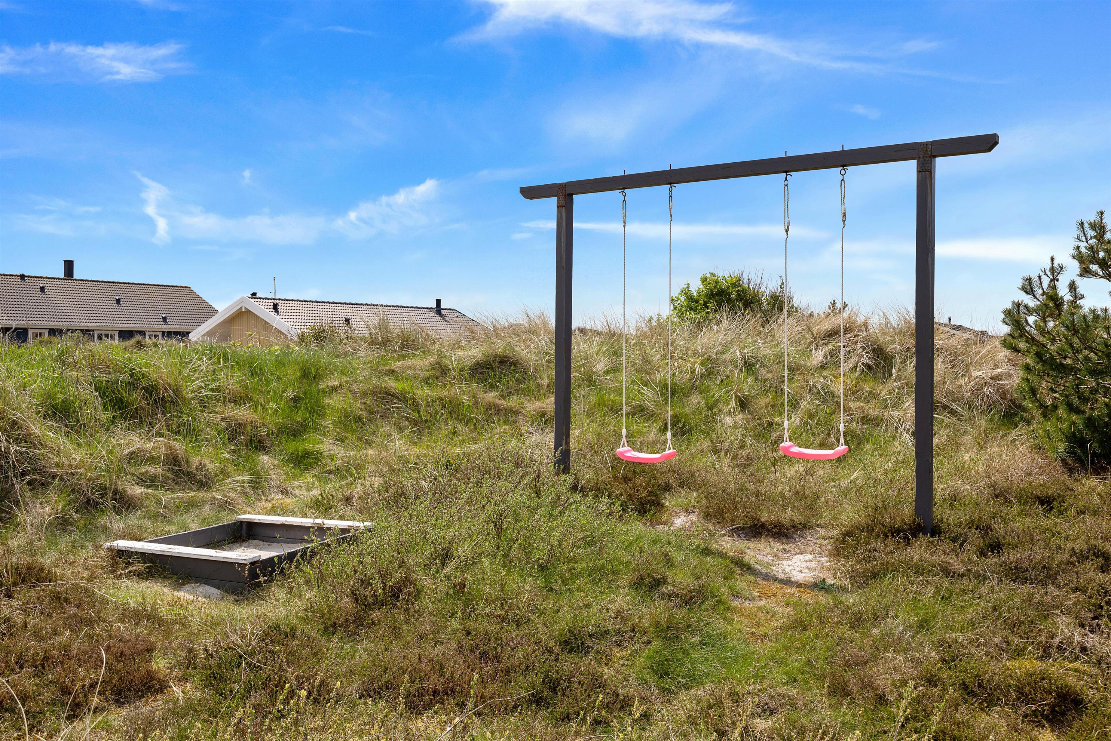 Solskinstimerne kan nydes fra den dejlige træterrasse, hvorfra der er en god udsigt over det omkringliggende hede- og klitlandskab. Her venter havemøbler og liggestolene på jer. Mens der bliver solet på terrassen, kan de små gynge på gyngerne eller bygge store sandslotte i sandkassen.