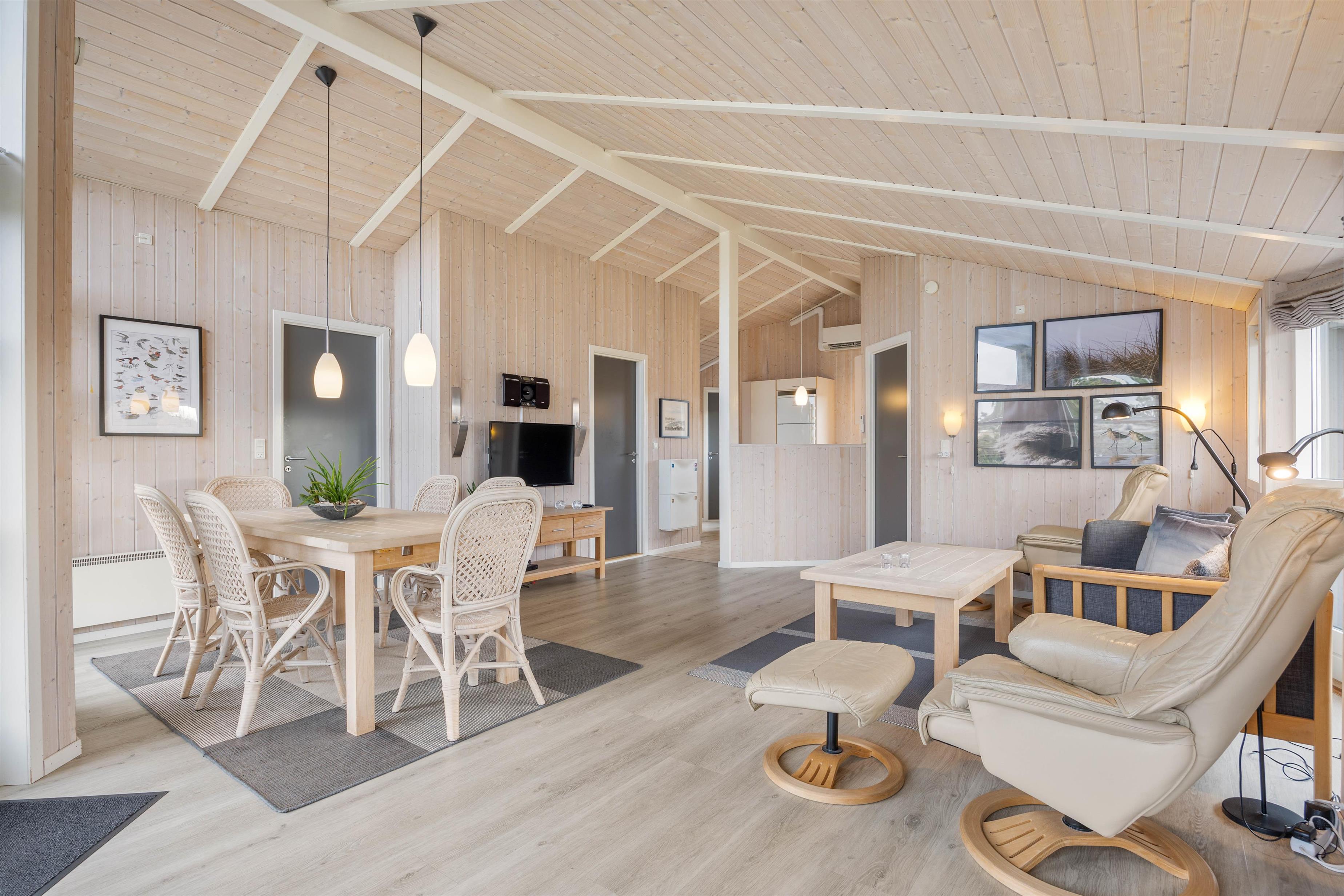Med beliggenheden for enden af en blind vej tilbyder dette sommerhus en uforstyrret ferie, hvor I kun skal tænke på at slappe af og holde fri sammen. Feriehuset er dejligt lyst indrettet med store vinduespartier i stuen, der bidrager med naturligt lys og en skøn udsigt. Den rummelige stue med spiseafdelingen har plads til, at hele familien kan samles til en god film, over et lækkert måltid eller bare til en hyggesnak foran den lune brændeovn. I stuen venter en alkove, der er perfekt til ferielæsningen og børnenes huler. Stuen og køkkenet opdeles af en halvmur, så selvom du står for madlavningen, kan du stadig være med i familiehyggen.