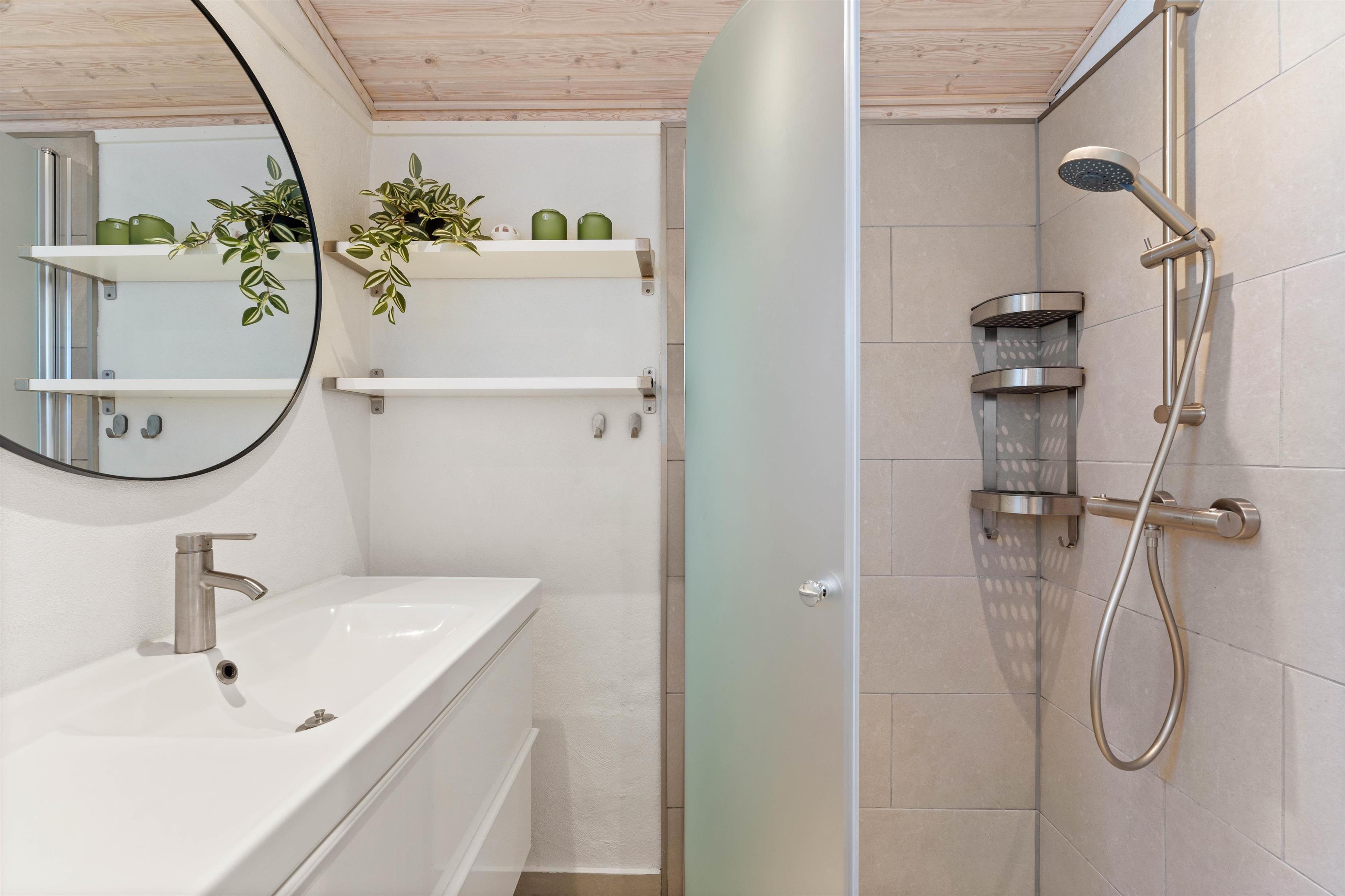 Køkkenafdelingen med kogeø indeholder alt, hvad I skal bruge for at forkæle hinanden med lækre, hjemmelavede måltider. Den separate fryser på 80 liter vil især glæde lystfiskere – her kan nok være en frisk fisk eller to. I køkkenområdet er der endvidere gulvvarme, ligesom på badeværelserne. Sommerhuset har desuden vaskemaskine og tørretumbler.