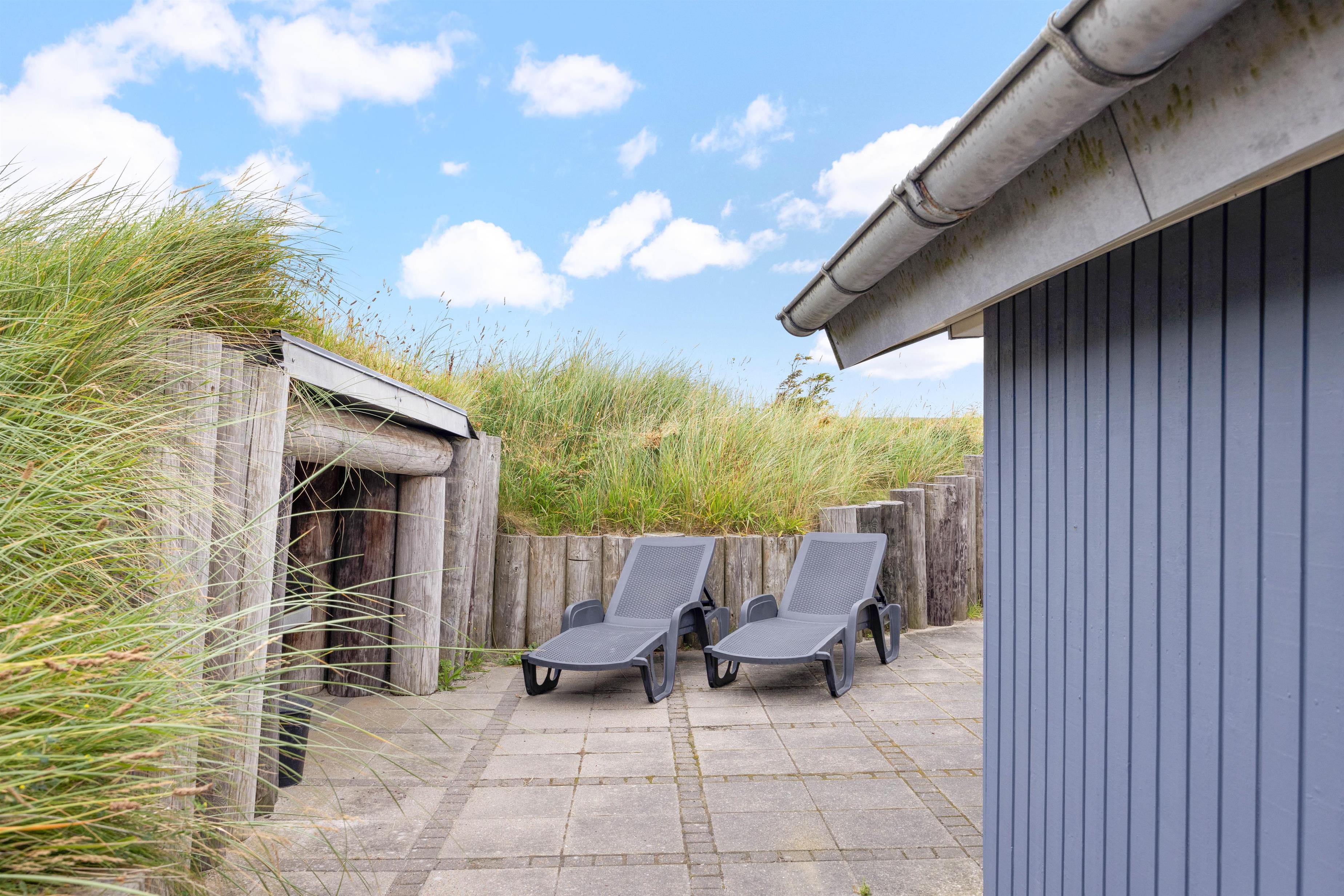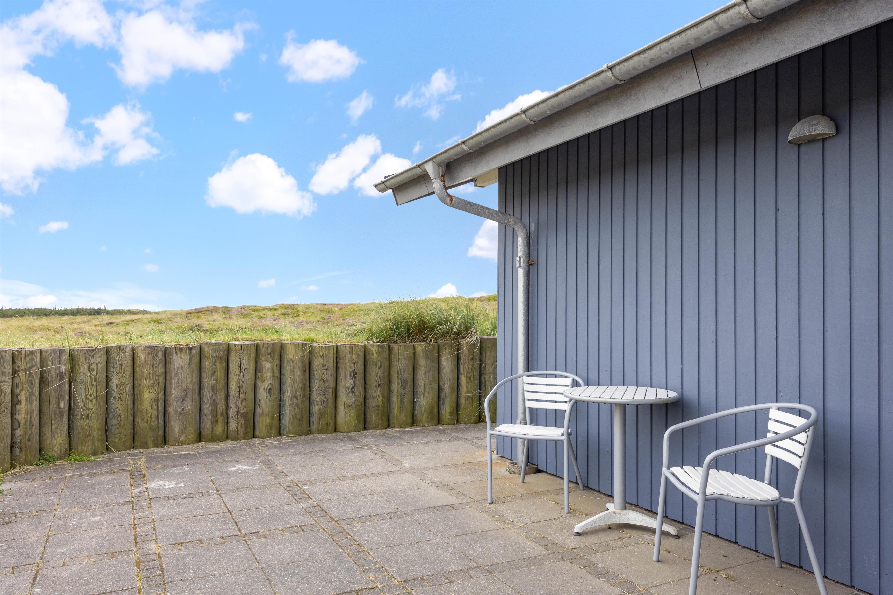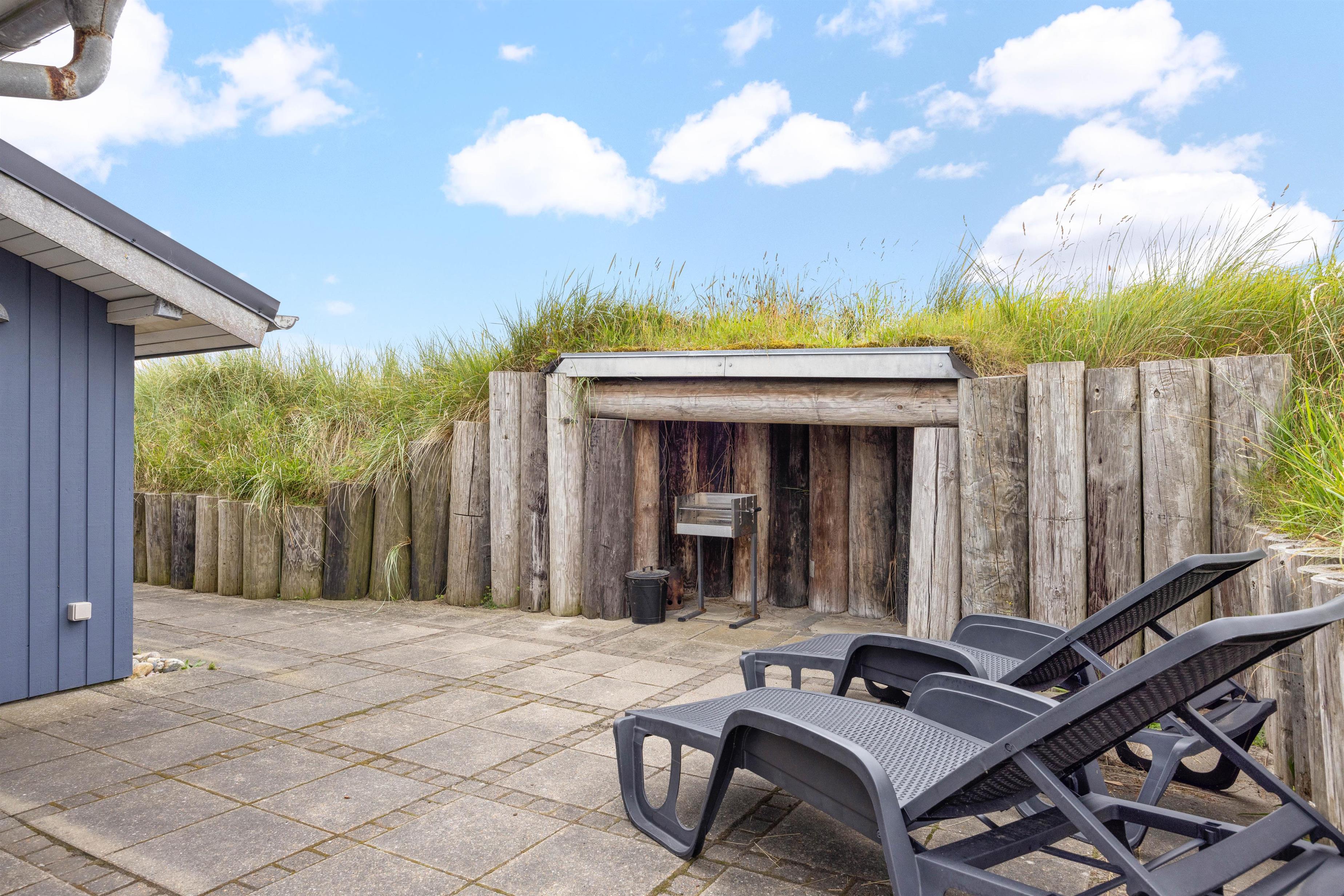 Sommerhuset er omringet af terrasssen, der smukt er afskærmet af naturen, således I uforstyrret kan benytte terrassen. Fra terrassen kan naturen og den friske luft nydes til solnedgangen. I dagtimerne kan solen og naturen nydes i en af liggestolene, mens børnene leger i sandkassen. Grillen kan om aftenen gøres klar til en lækker grillaften med familien.