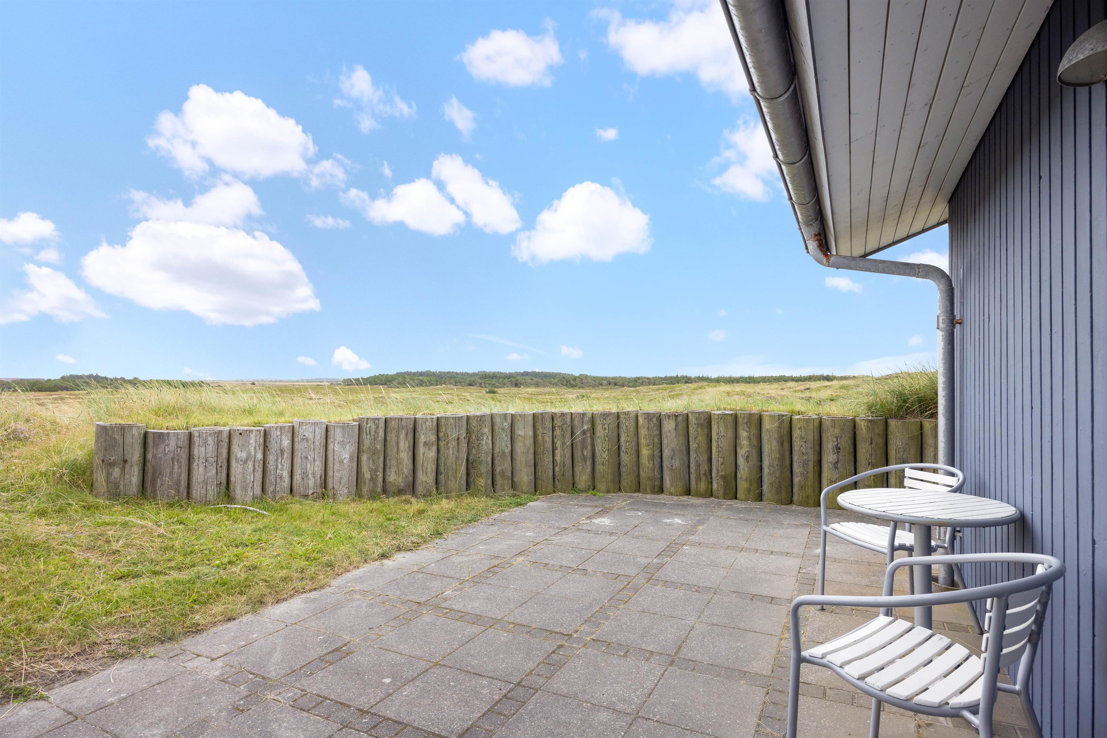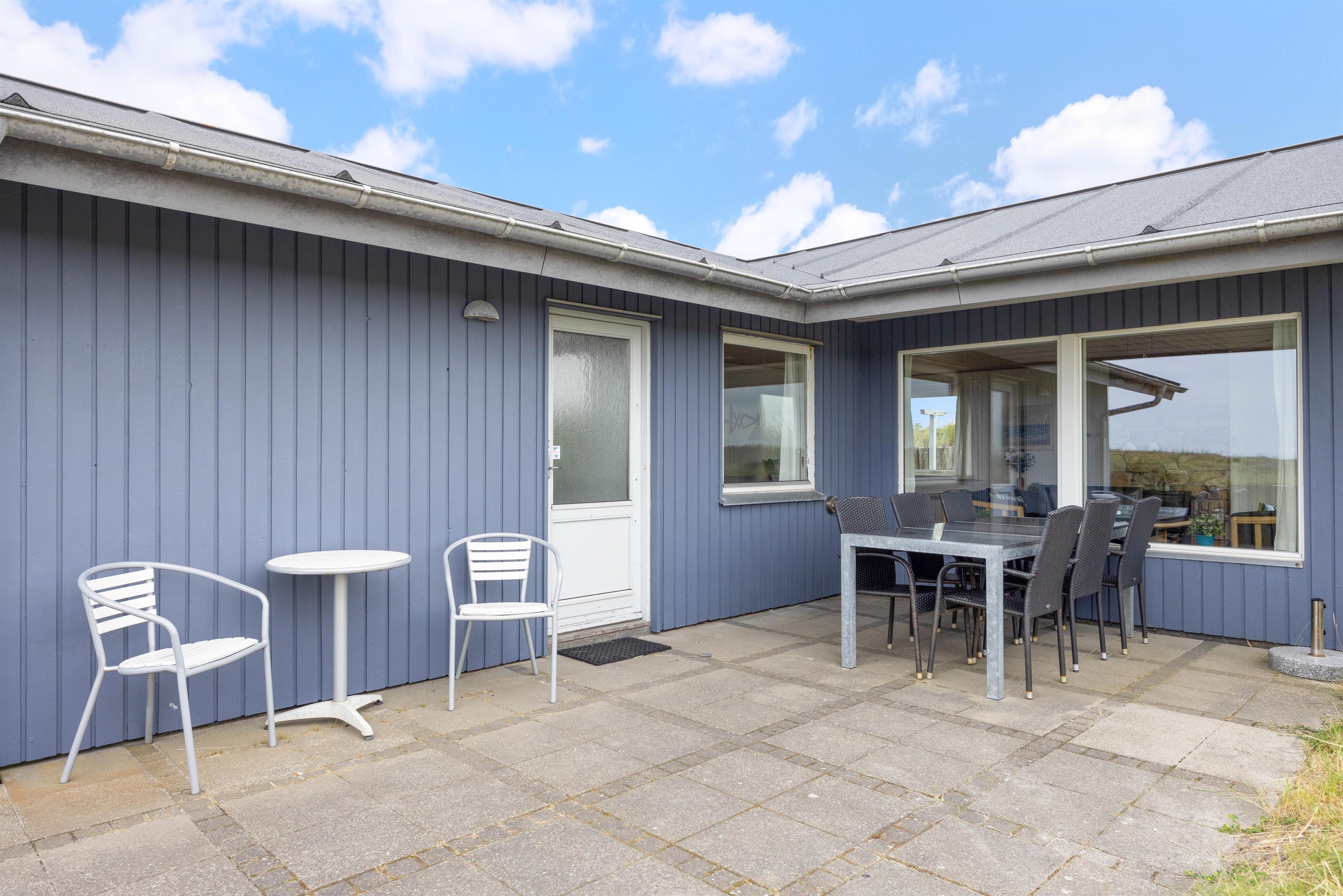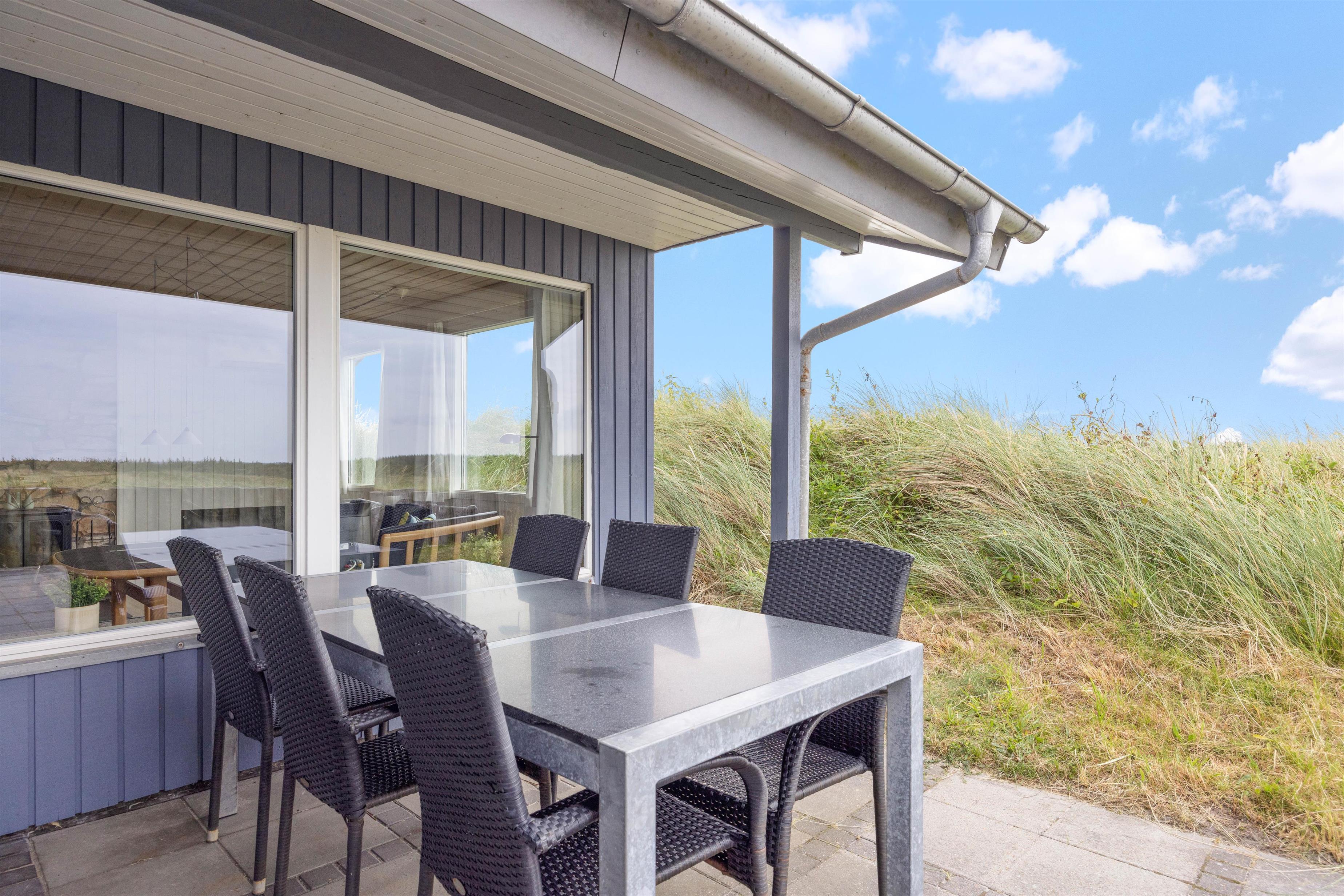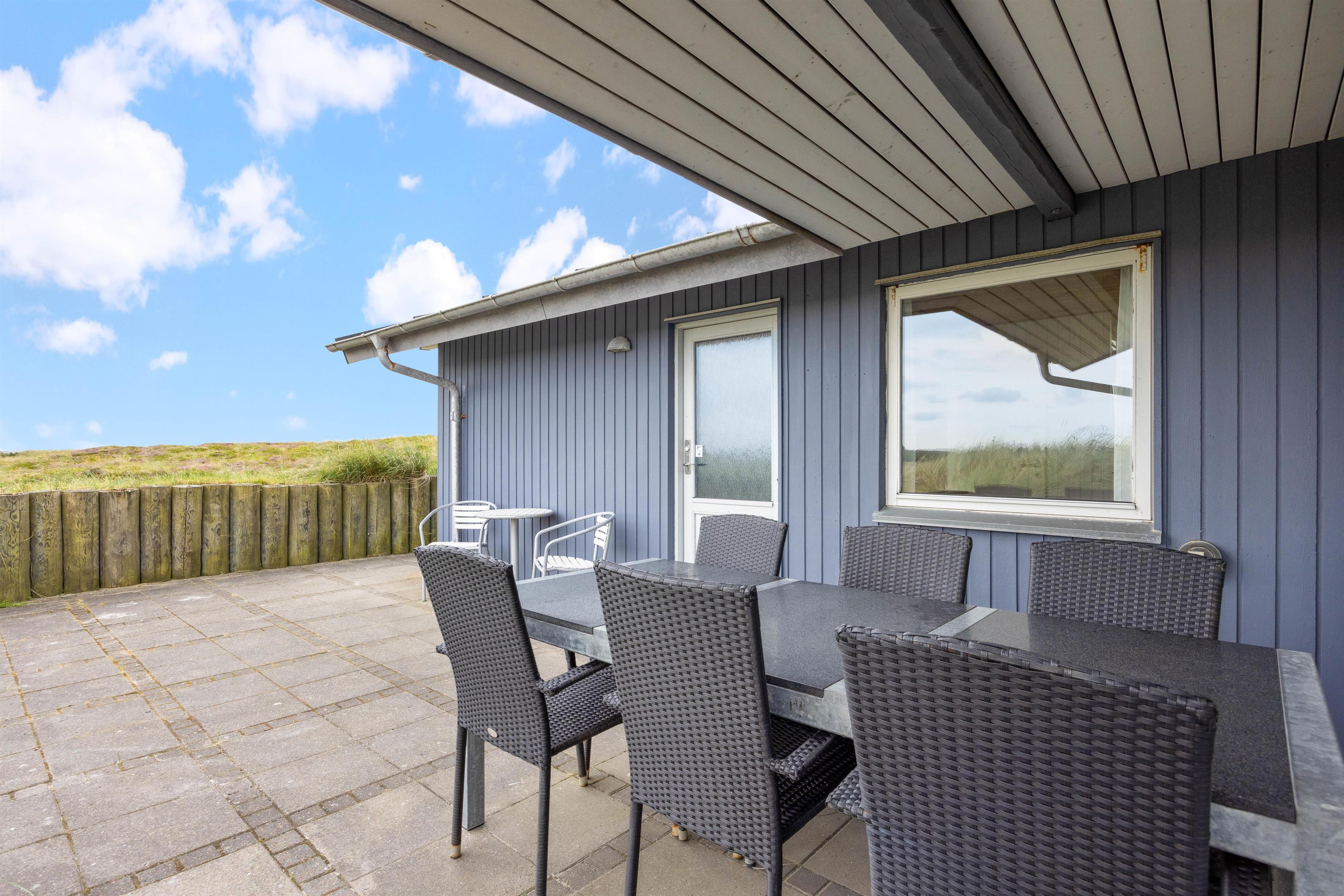 Sommerhuset er omringet af terrasssen, der smukt er afskærmet af naturen, således I uforstyrret kan benytte terrassen. Fra terrassen kan naturen og den friske luft nydes til solnedgangen. I dagtimerne kan solen og naturen nydes i en af liggestolene, mens børnene leger i sandkassen. Grillen kan om aftenen gøres klar til en lækker grillaften med familien.
