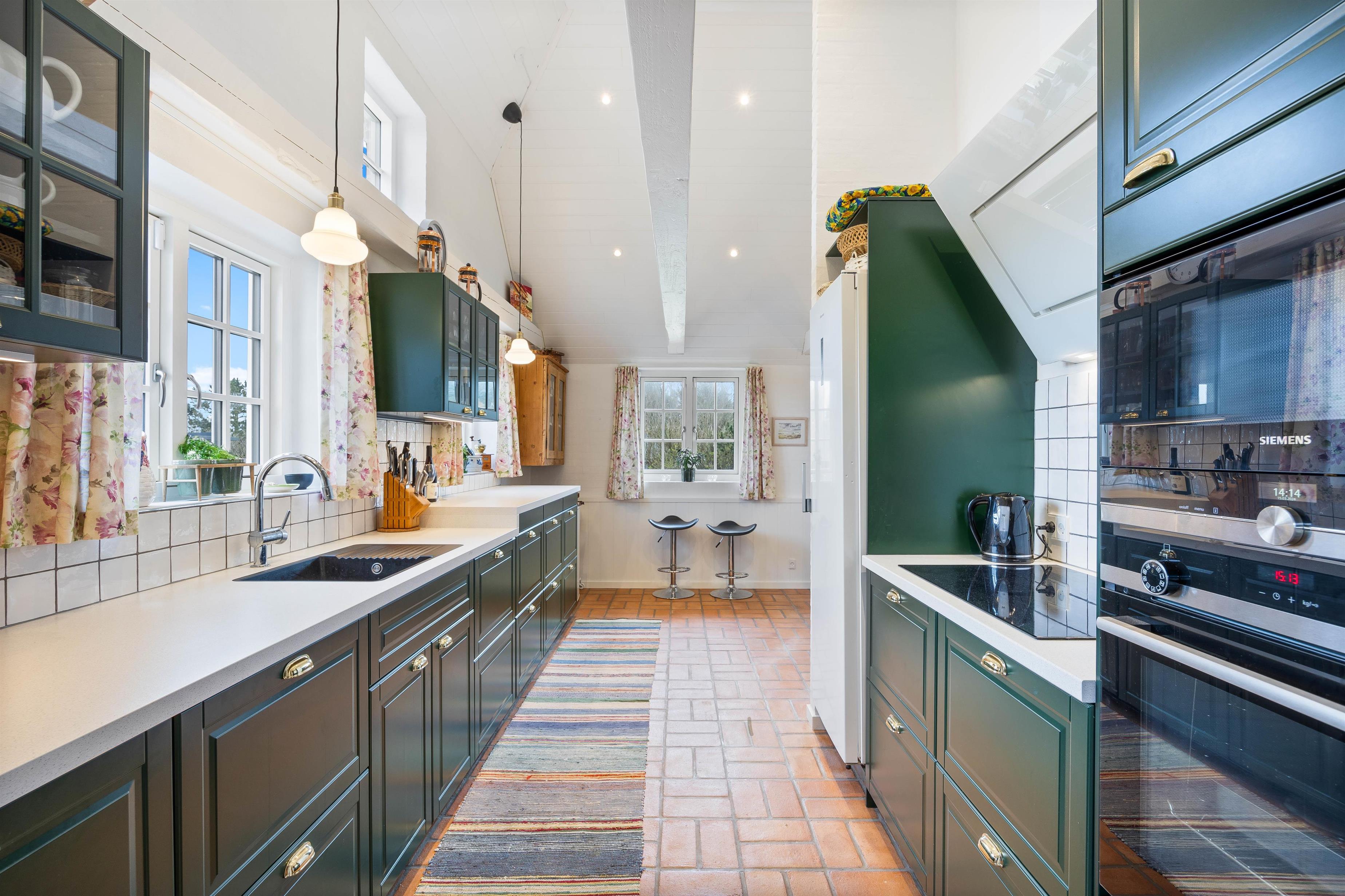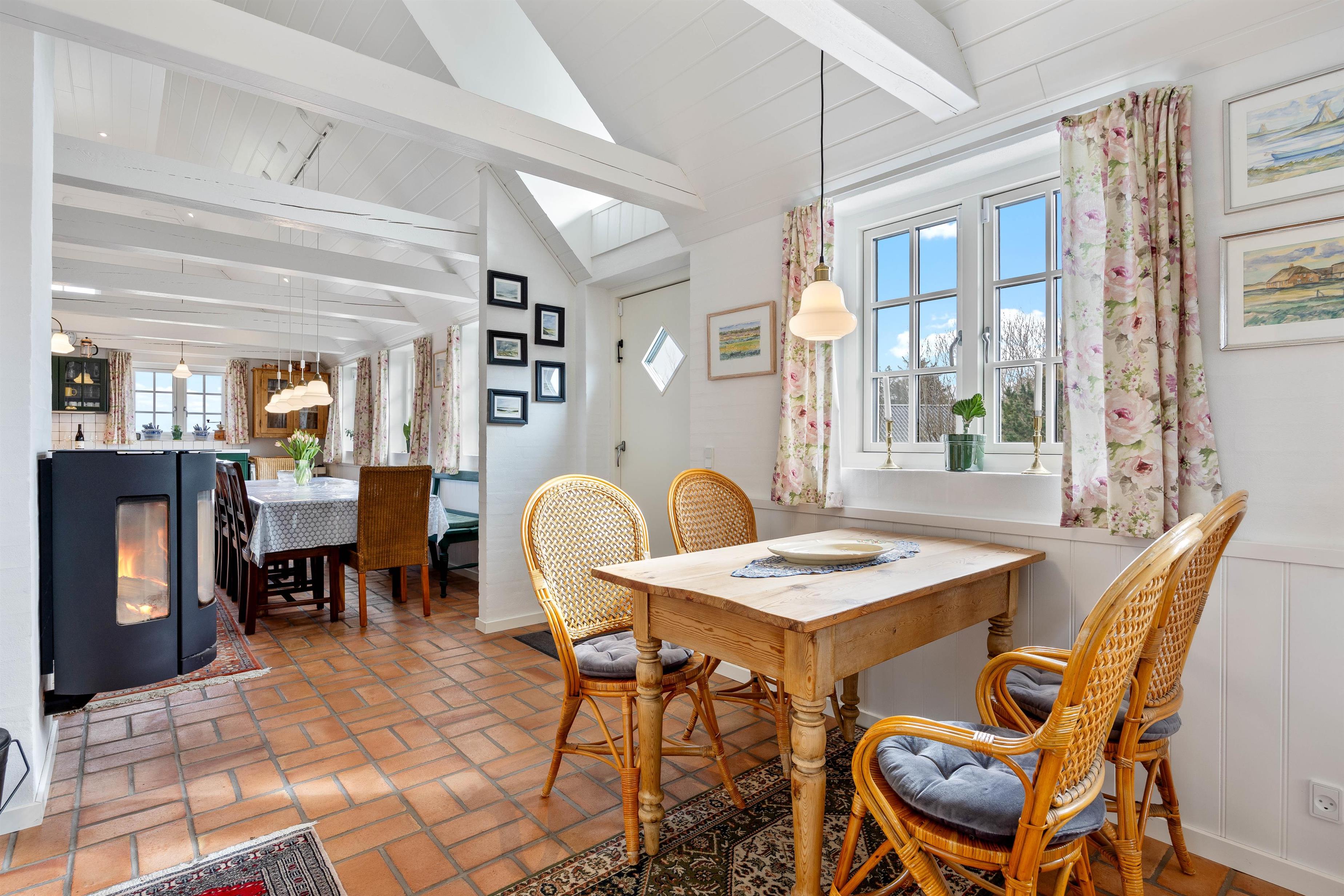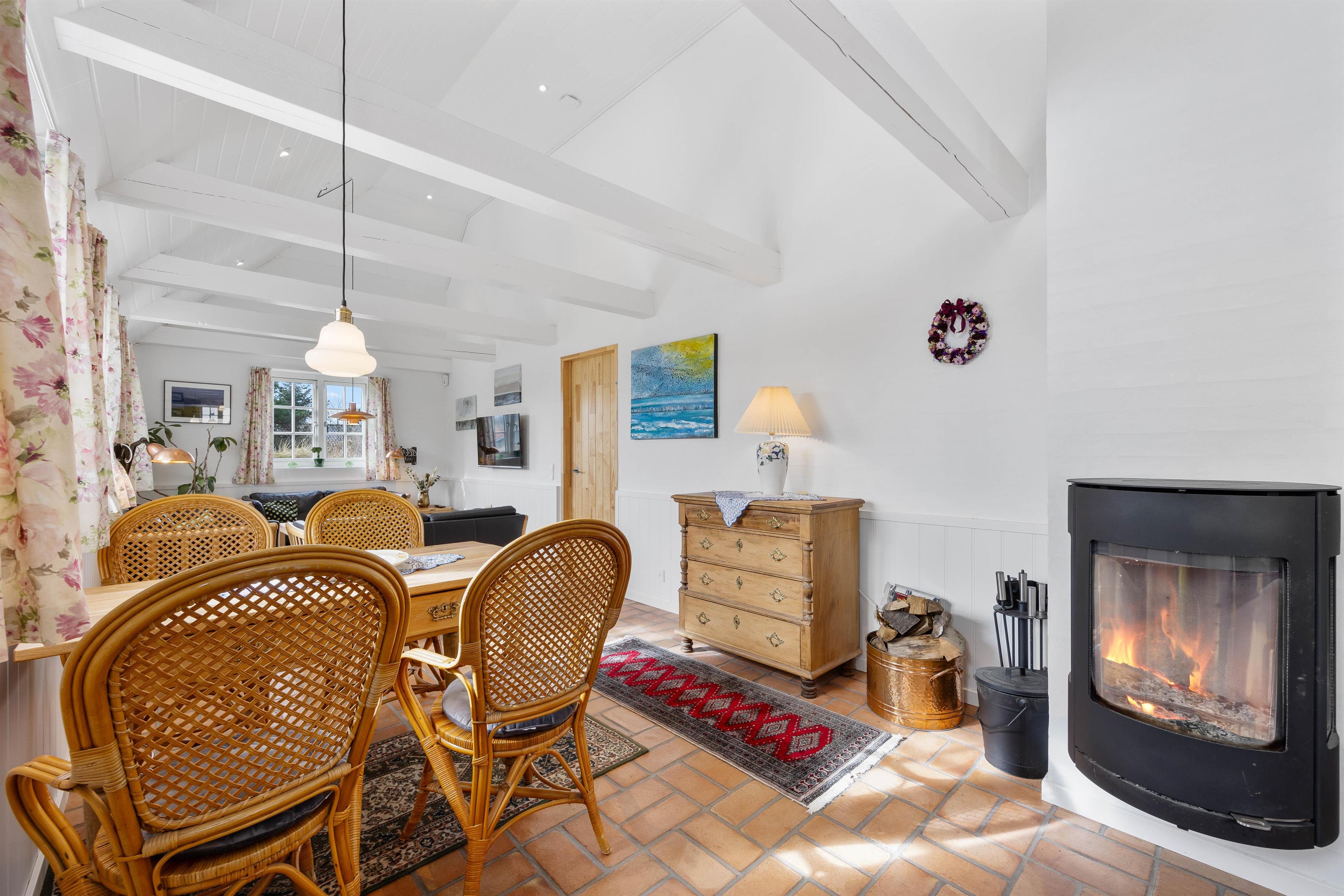 Køkken, spiseplads og stue ligger samlet i ét, og her kan hele familien nyde hinandens selskab, hvad enten det er over madlavningen, et lækkert måltid eller afslapning i sofaen. Brændeovnen sørger for varme og spreder en ekstra hyggelig feriestemning.