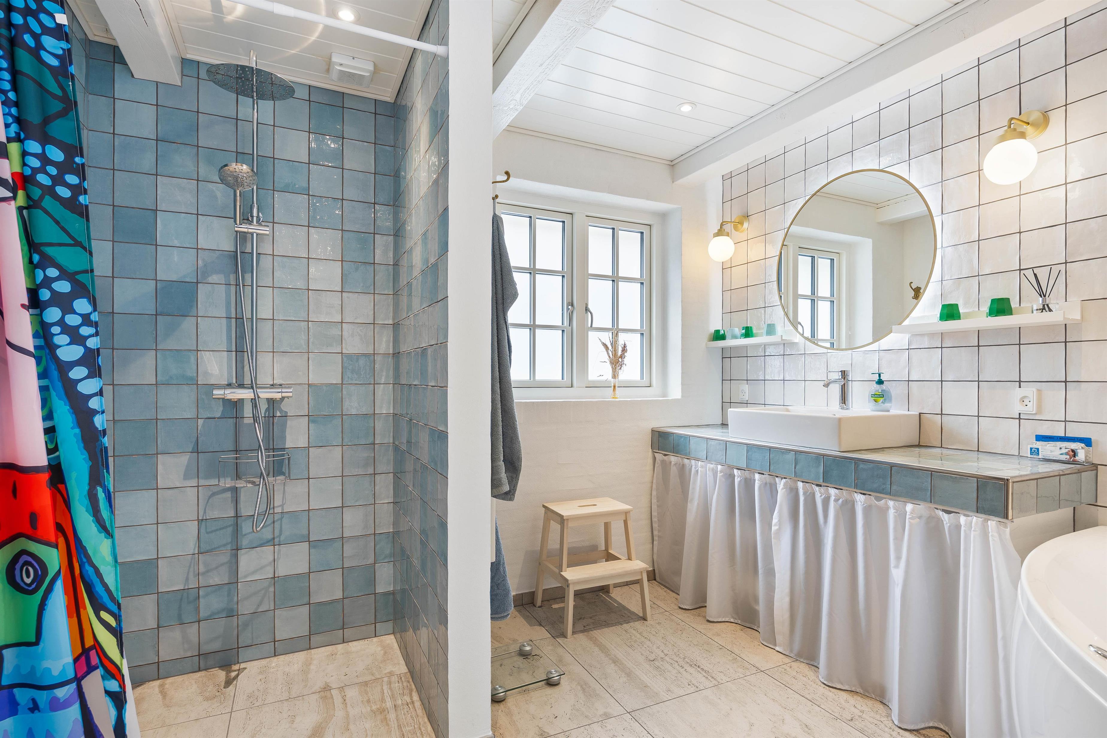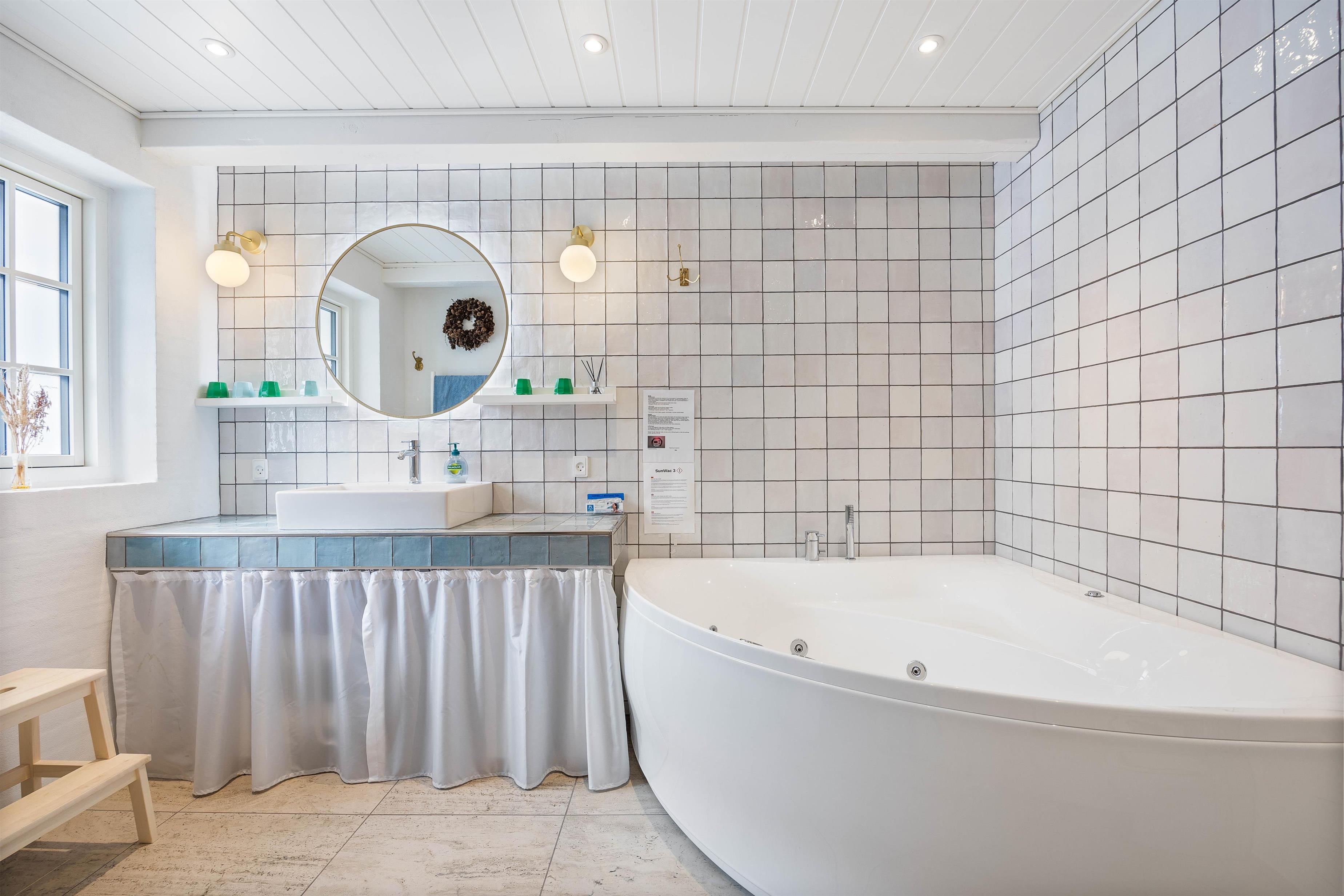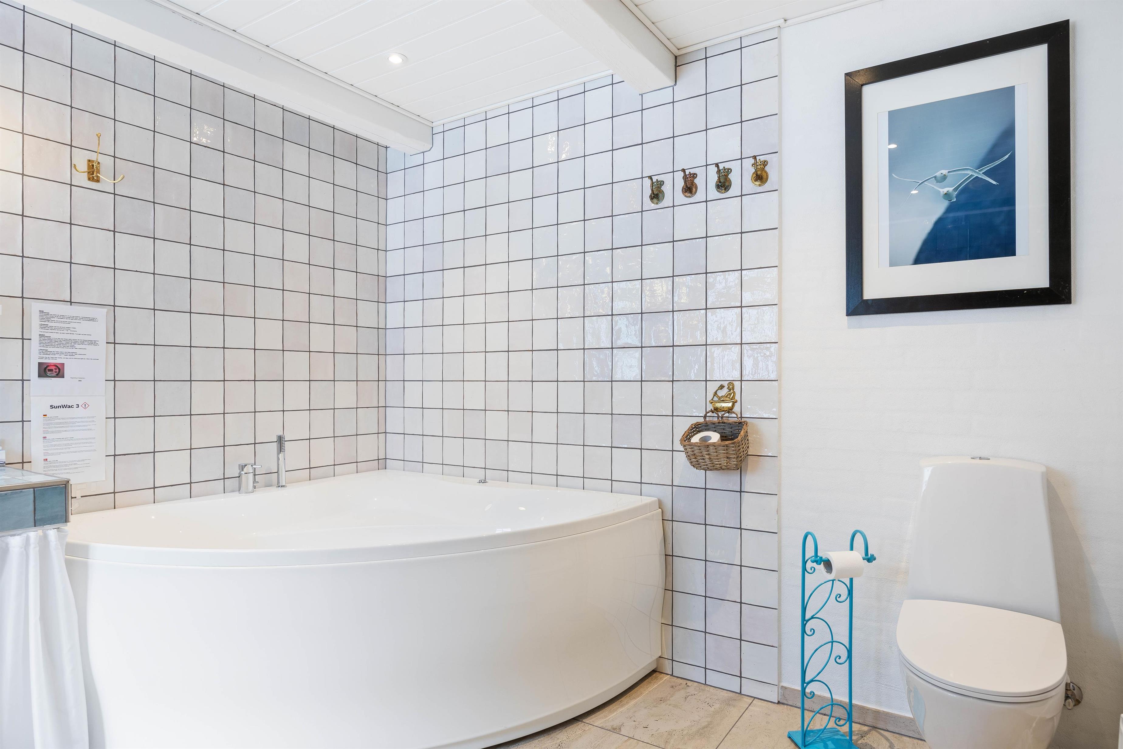 Der er 2 gode badeværelser med gulvvarme i sommerhuset, og på det ene finder I et spabad til afslapning og velvære. Desuden er der både vaskemaskine og tørretumbler i sommerhuset, så I om nødvendigt har mulighed for lidt tøjvask undervejs.