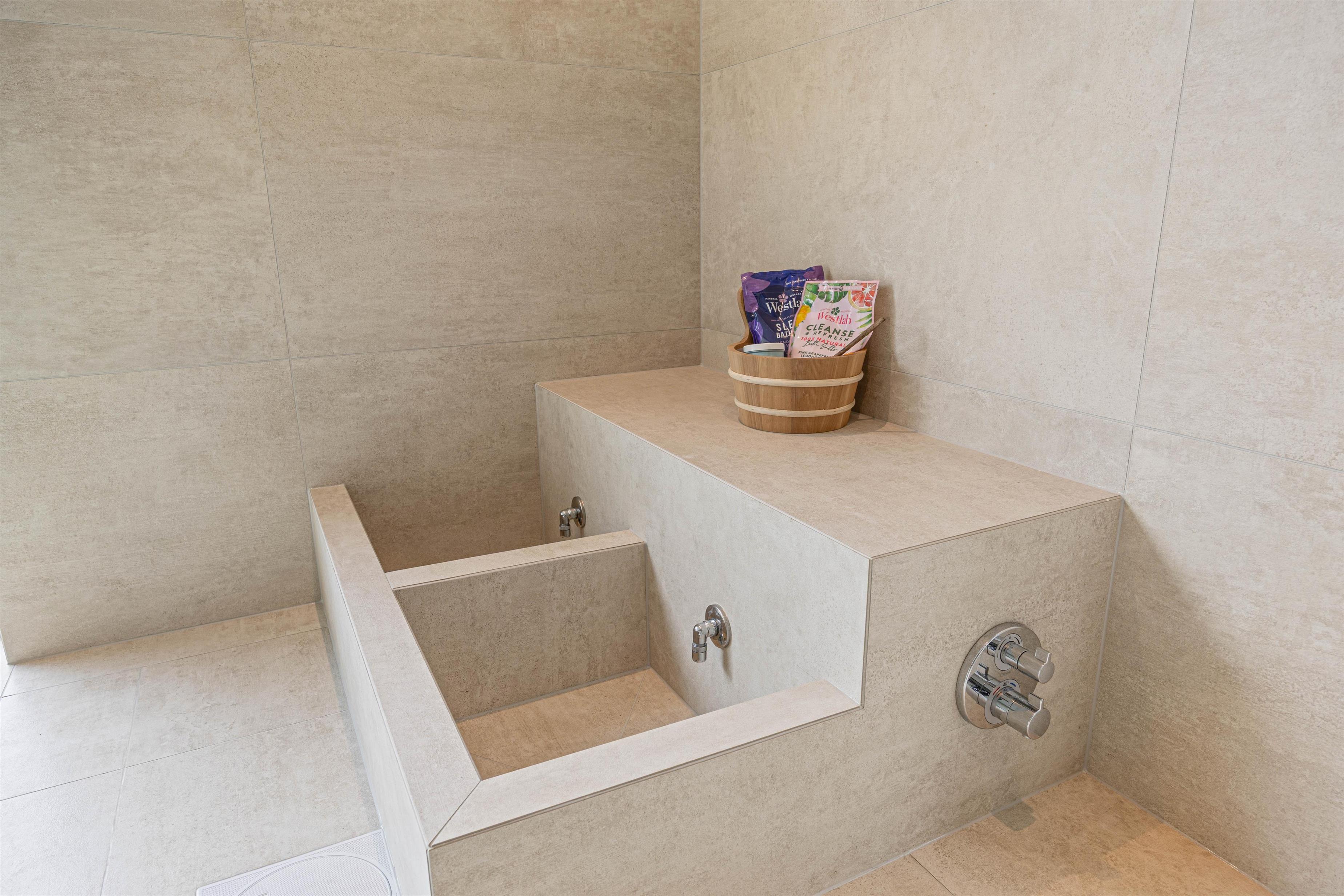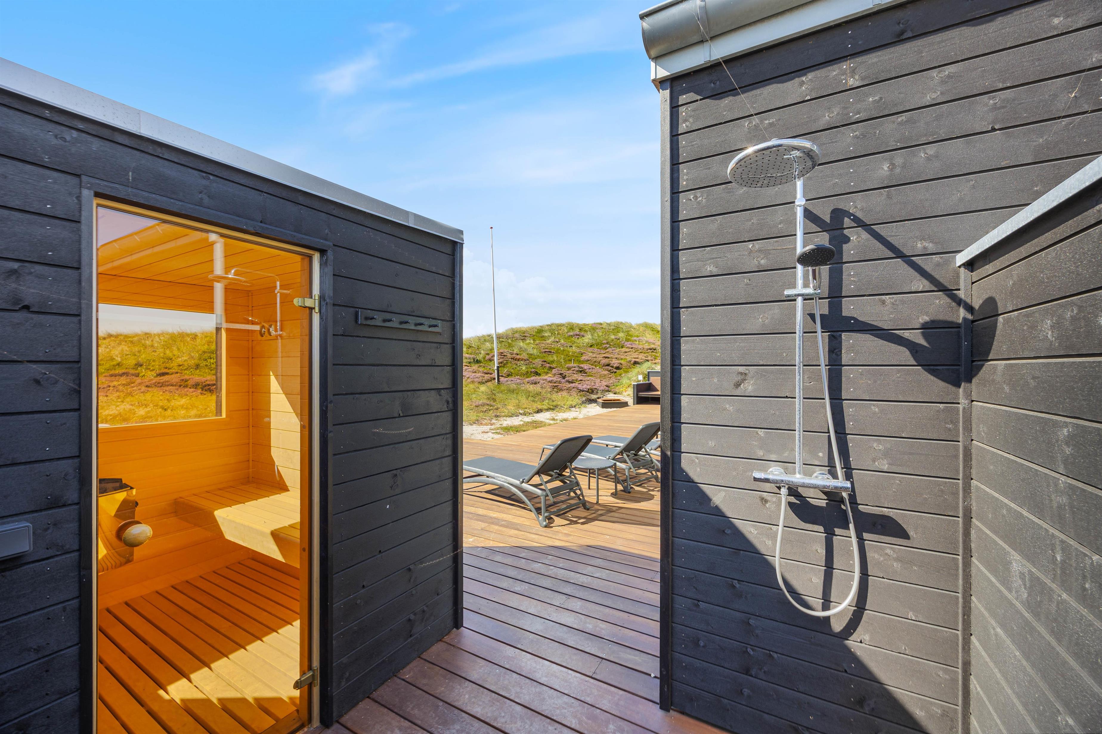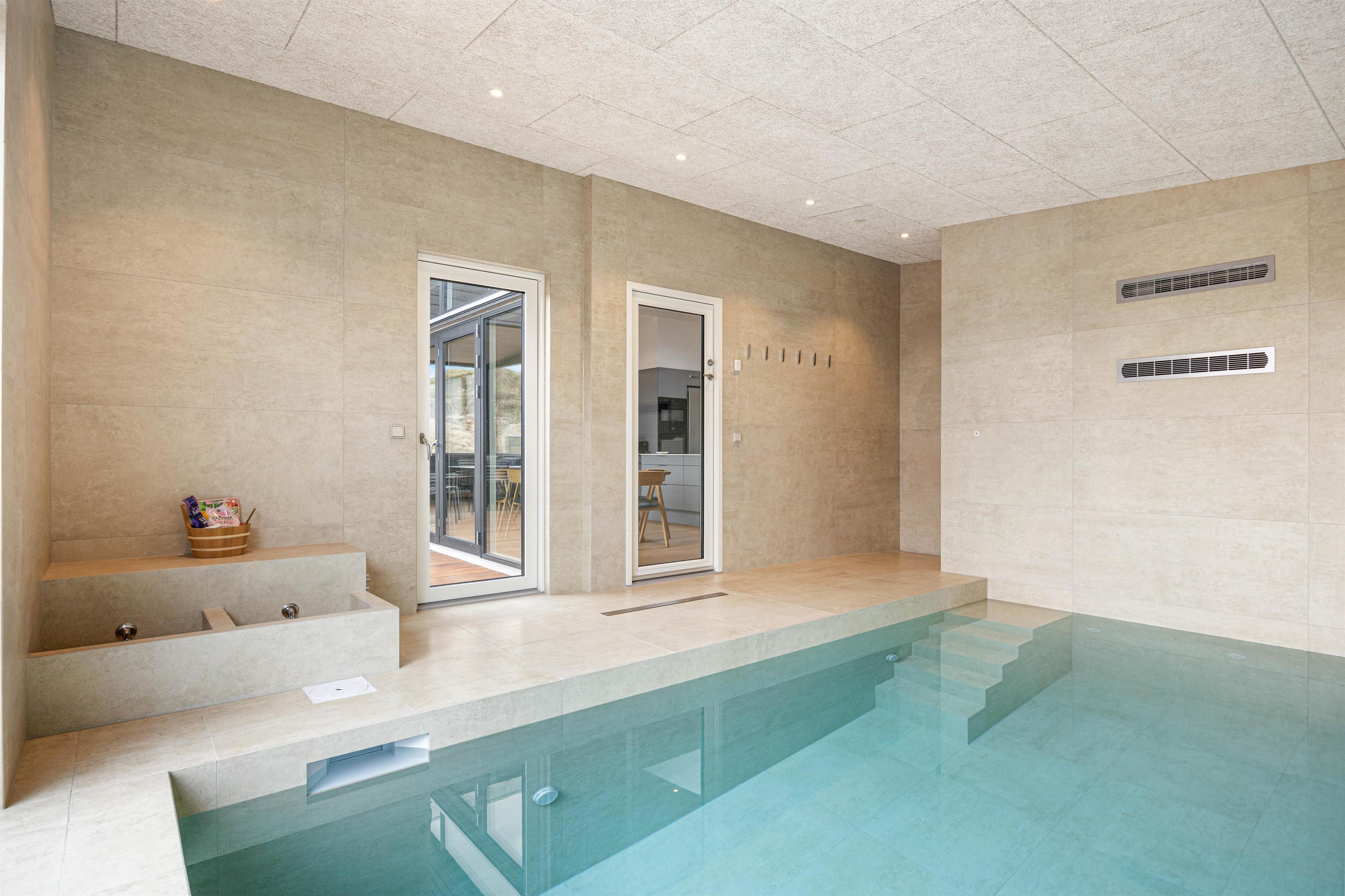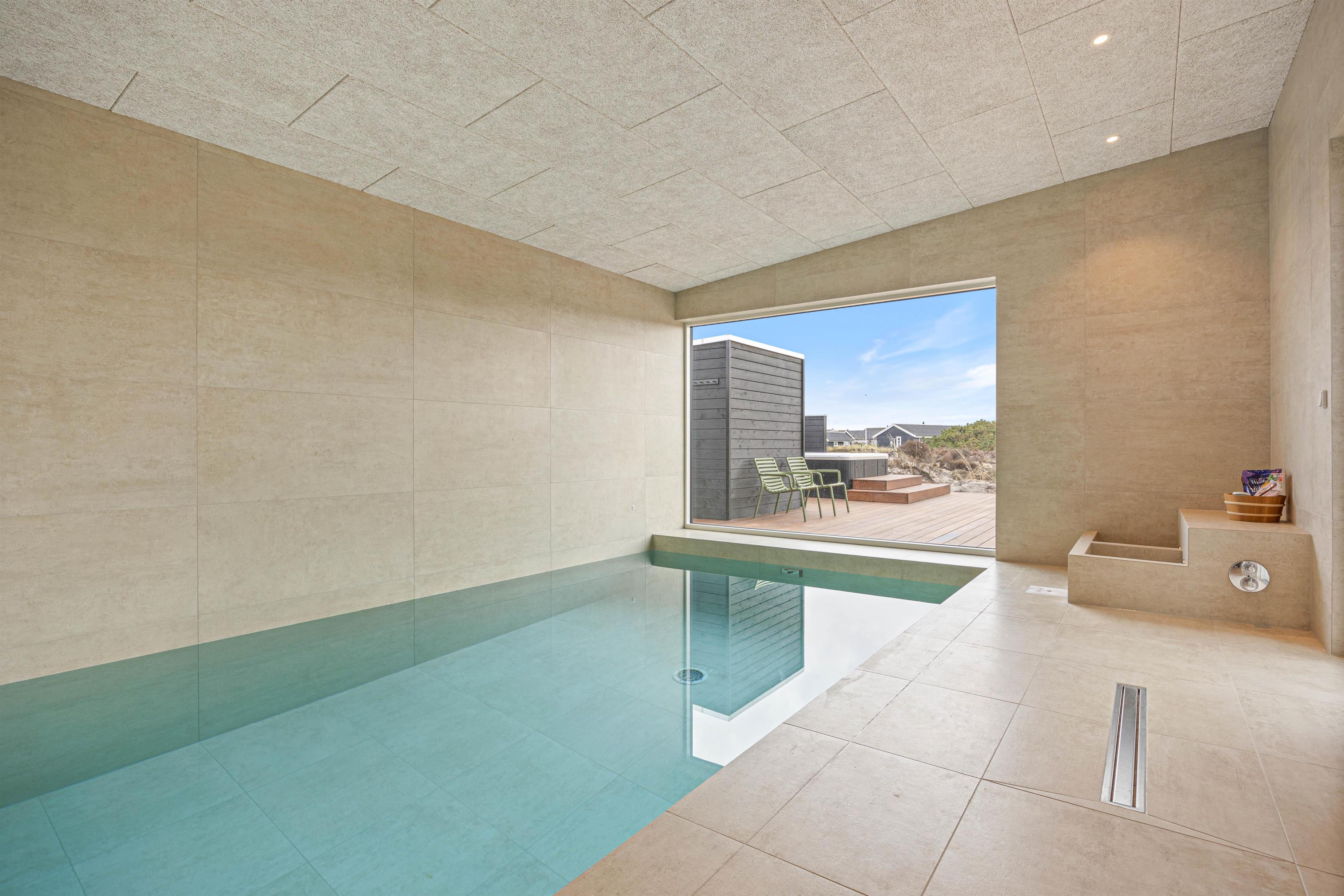 Sommerhusets 15 m² store swimmingpool med modstrømsanlæg inviterer til leg og motion – perfekt til både store og små vandhunde. I poolområdet finder I også det unikke fodbad, der giver en ekstra dimension af komfort og velvære. Når det er tid til afslapning, kan I nyde den varme udespa på terrassen og lade roen sænke sig. Om sommeren (fra april til november) kan I få et koldt skyl under udebruseren.