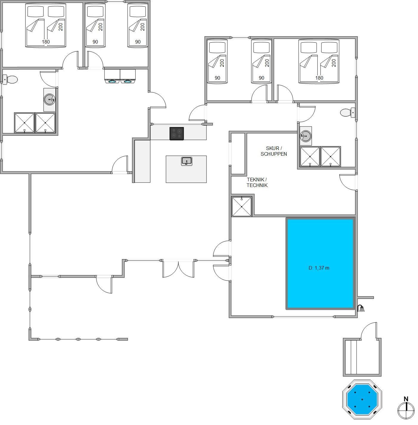 Poolhuset på Bjerregårdsvej 283 er skabt til både afslapning og samvær. Med 4 rummelige soverum, 2 moderne badeværelser med dobbeltbruser samt himmelkig og et veludstyret køkken med alle hverdagens hjælpemidler, som opvaskemaskine, vinkøleskab, powerblender og 2 ovne, så mangler I intet. Velux ovenlysvinduer i køkken og badeværelser sikrer et fantastisk lysindfald, der bidrager til den lyse og indbydende atmosfære.