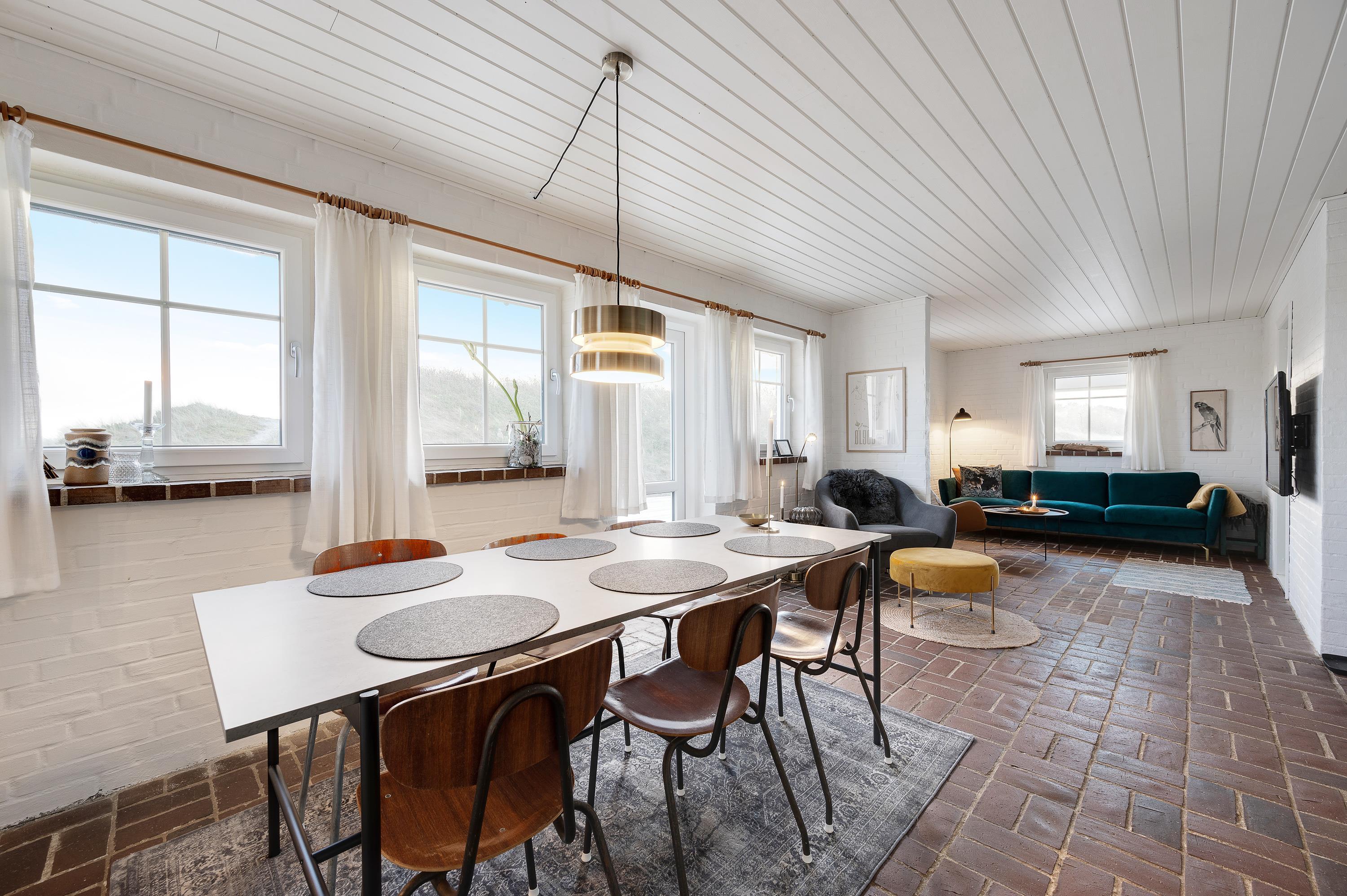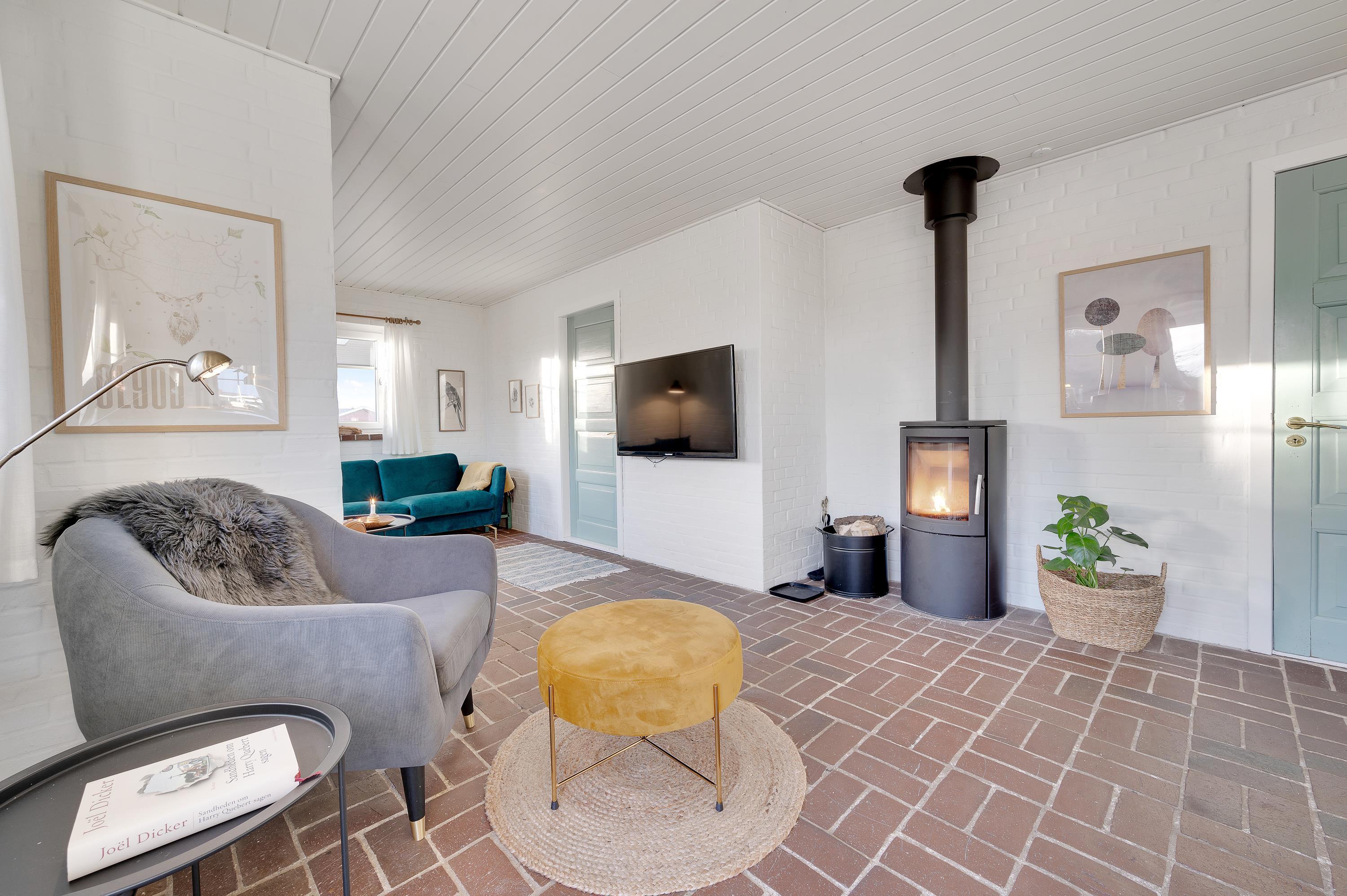I midten af feriehuset ligger den lyse opholdsstue med klinkegulv, der danner rammen om feriens fælles stunder. Herfra er der også adgang til alle sommerhusets øvrige rum. De lyse nuancer og den hyggelige indretning skaber en behagelig og hjemlig atmosfære.