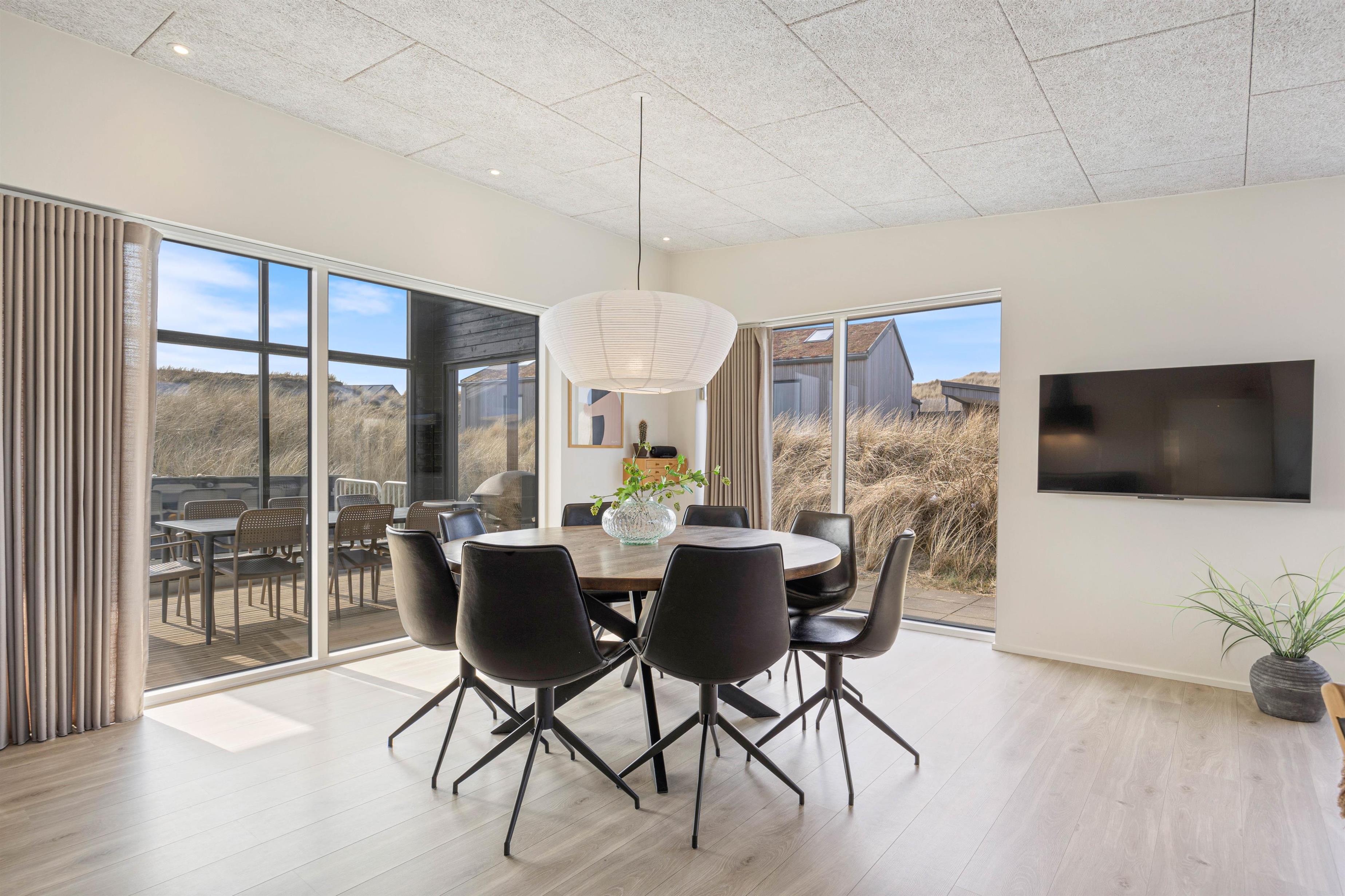 Sommerhuset er bygget i 2021 og står derfor superflot og moderne med lækre komfortable møbler. Fra det veludstyrede køkken er der adgang til det store overdækkede terrasseområde. Her kan I sidde i læ fra Vestenvinden, mens I nyder udsigten over det flotte klitlandskab i Bjerregård.