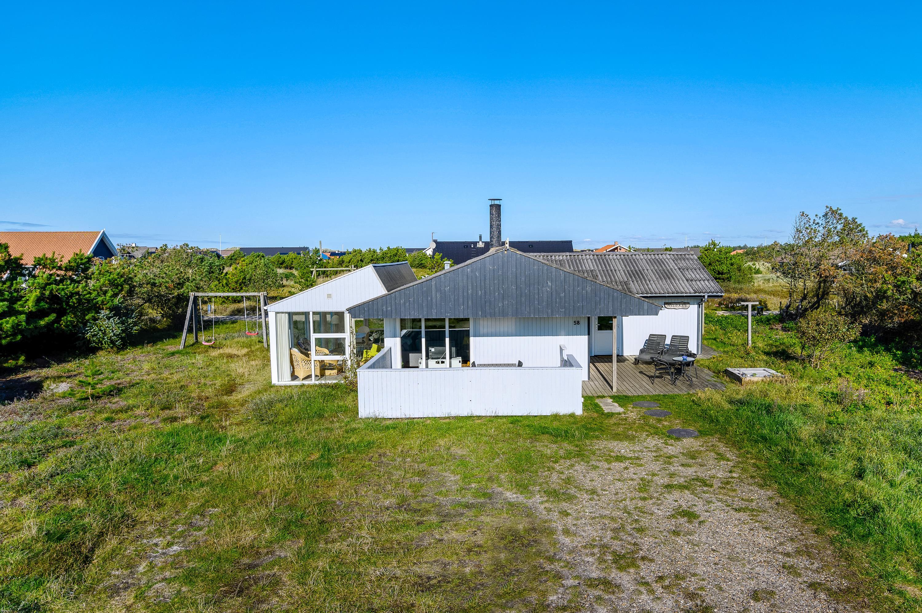Velkommen til dette hyggelige 2-stjernet feriehus på Kirstinevej 58, smukt placeret på en 1.200 m² stor naturgrund. Kun 500 meter fra sommerhuset kan I høre Vesterhavets brus, og 100 meter mod syd ligger et fredet hedeområde – perfekt til gåture og naturoplevelser. Feriehuset har plads til op til 6 personer og 2 hunde og er især velegnet til familier med små børn. Et af sommerhusets højdepunkter er den indbydende vinterhave, som kan bruges året rundt.